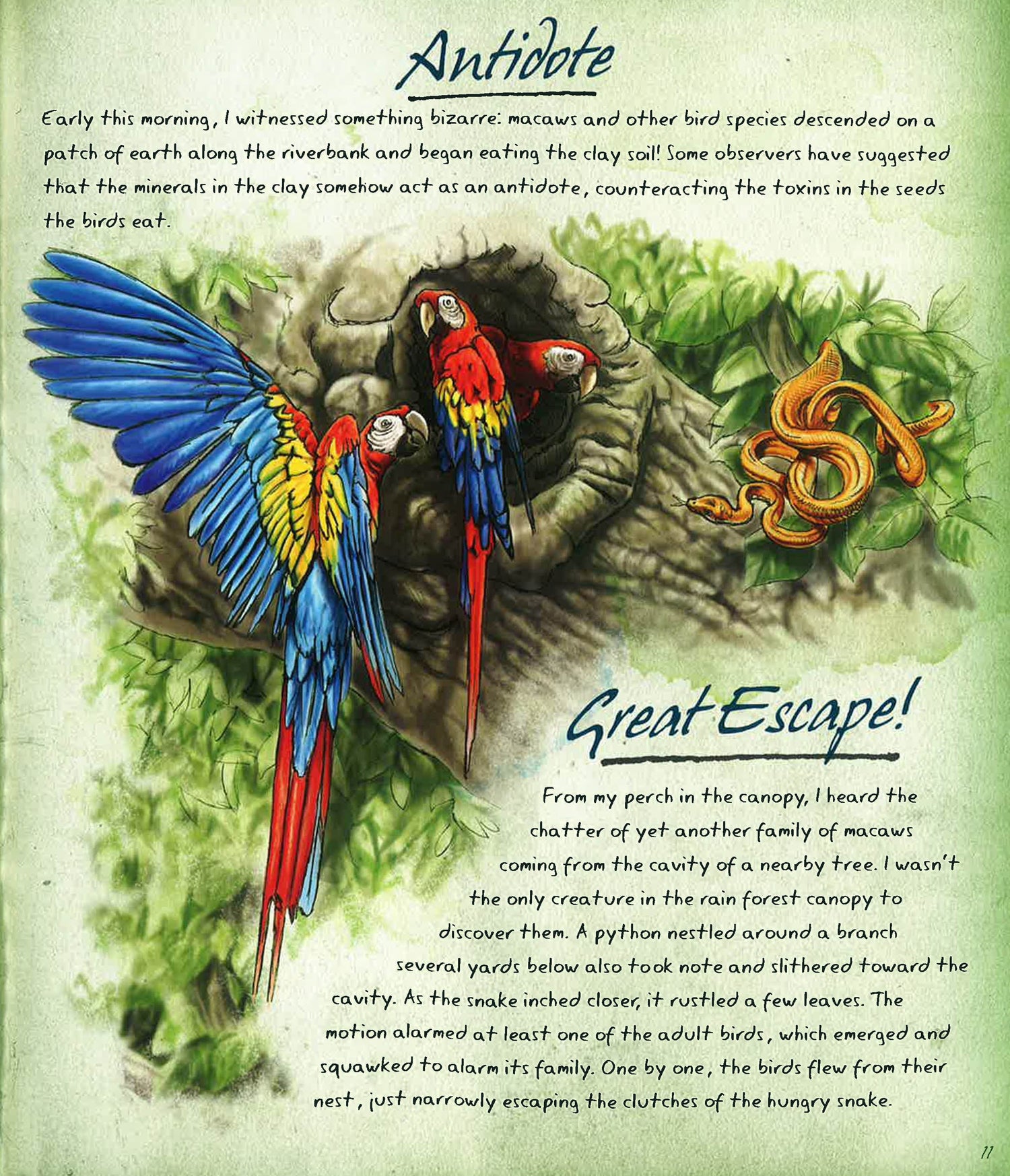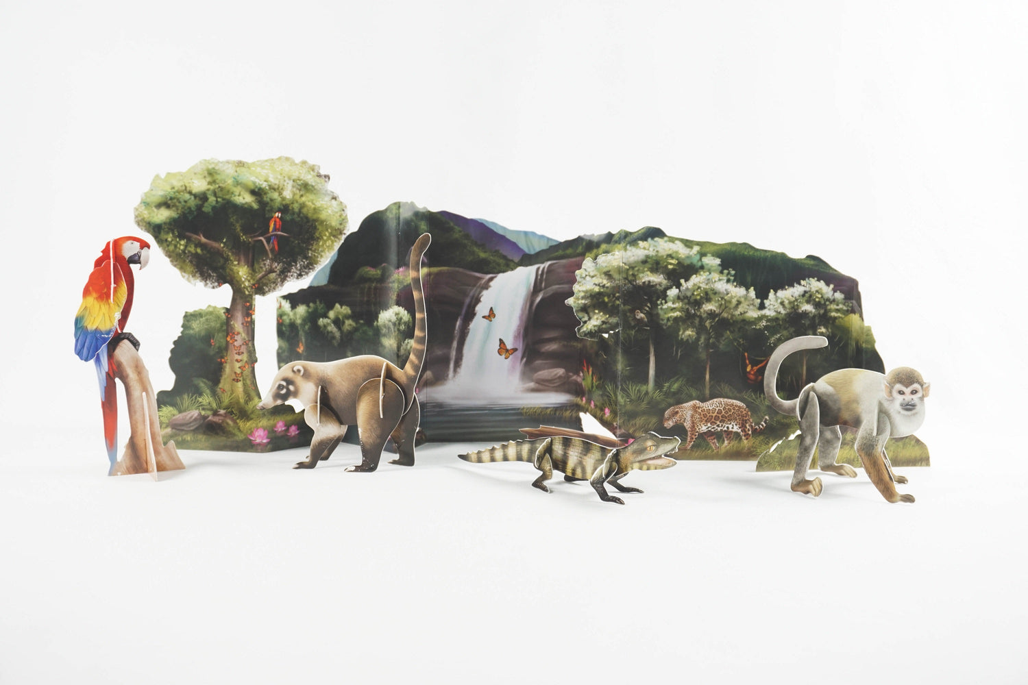 Join the adventure of a lifetime as you explore the Amazon Rain Forest! Follow the trail of the jungle's most magnificent creatures, including silent jaguars, leaping monkeys, and pink river dolphins in "The Field Guide to Rain Forest Animals." Learn the difference between New World and Old World monkeys, how to detect the presence of a Dwarf Caiman crocodile, and why Vampire Bats can walk and run. This unique interactive journal is filled with photographs, maps, and detailed illustrations of eight interesting jungle animals. At the end of this book kids can continue the adventure by assembling their animals amidst a colorful diorama for their own museum-ready display!