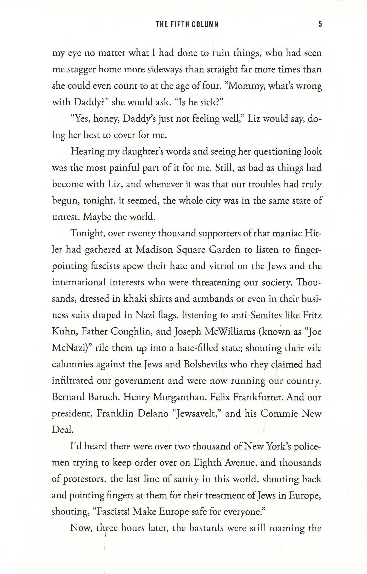 February, 1939. Europe teeters on the brink of war. In New York City, twenty-two thousand cheering Nazi supporters pack Madison Square Garden for a raucous, hate-filled rally. In a Hells Kitchen bar, Charles Mossman is reeling from the loss of his job and the demise of his marriage when a group draped in Nazi flags barges in. Drunk, Charlie takes a swing at one with tragic results and a torrent of unintended consequences follows.