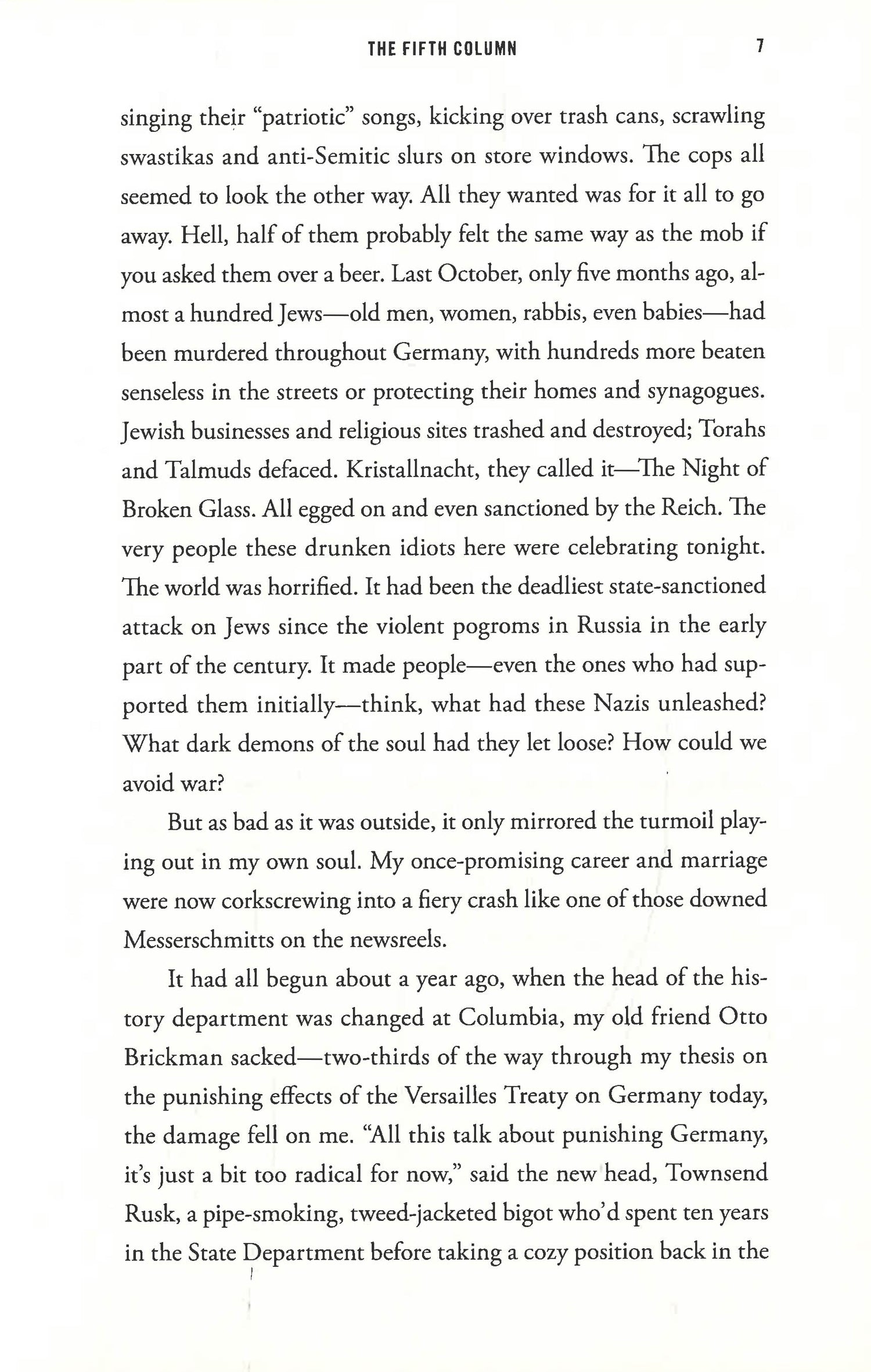 As the threat of war grows, and fears of a fifth columnGerman spies embedded into everyday lifeare everywhere, Charles puts together that the seemingly amiable Bauers may be part of a sinister conspiracy. When Pearl Harbor is attacked and America can no longer sit on the sideline, that conspiracy turns into a deadly threat with Charles the only one who can see it and Emma, an innocent pawn.