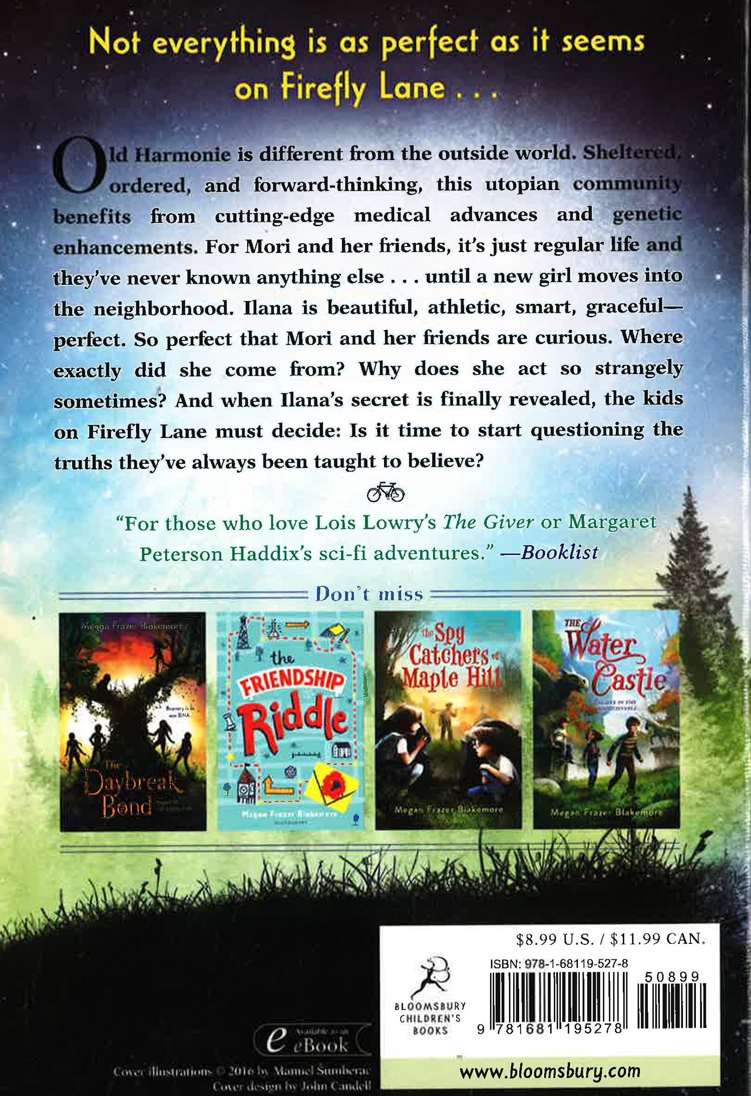 Mori and her friends live a normal life on Firefly Lane in their utopian community, Old Harmonie. In a world this safe and perfect, they've never had to question anything . . . never had to wonder about how their lives came to be. Until a new girl named Ilana moves in. She's so perfect that Mori and her friends are curious . . . Where exactly did Ilana come from, and why does she act so strange sometimes? When Ilana's secret is revealed, the kids on Firefly Lane must decide: is it finally time to start questioning the only world they've ever known? In a stunningly imaginative story, critically acclaimed author Megan Frazer Blakemore takes readers on a journey with five friends--new and old--that will have everyone talking about not just what makes people human, but what makes them true friends. (Age Range: 8-12 years old)