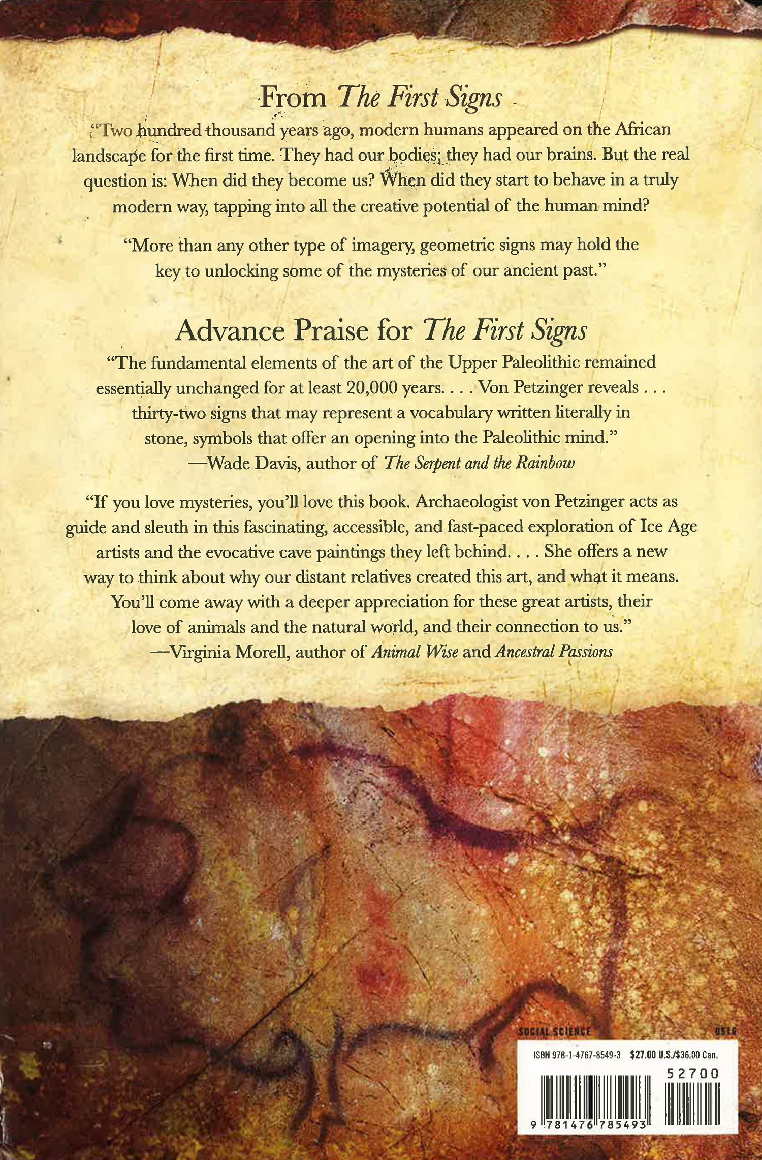 One of the most significant works on our evolutionary ancestry since Richard Leakey's paradigm-shattering Origins, The First Signs is the first-ever exploration of the little-known geometric images that accompany most cave art around the world-the first indications of symbolic meaning, intelligence, and language. Imagine yourself as a caveman or woman. The place: Europe. The time: 25,000 years ago, the last Ice Age. In reality, you live in an open-air tent or a bone hut. But you also belong to a rich culture that creates art. In and around your cave paintings are handprints and dots, x's and triangles, parallel lines and spirals. Your people know what they mean. You also use them on tools and jewelry. And then you vanish-and with you, their meanings. Join renowned archaeologist Genevieve von Petzinger on an Indiana Jones-worthy adventure from the open-air rock art sites of northern Portugal to the dark depths of a remote cave in Spain that can only be reached by sliding face-first through the mud. Von Petzinger looks past the beautiful horses, powerful bison, graceful ibex, and faceless humans in the ancient paintings. Instead, she's obsessed with the abstract geometric images that accompany them, the terse symbols that appear more often than any other kinds of figures-signs that have never really been studied or explained until now. Part travel journal, part popular science, part personal narrative, von Petzinger's groundbreaking book starts to crack the code on the first form of graphic communication. It's in her blood, as this talented scientist's grandmother served as a code-breaker at Bletchley. Discernible patterns emerge that point to abstract thought and expression, and for the first time, we can begin to understand the changes that might have been happening inside the minds of our Ice Age ancestors-offering a glimpse of when they became us.