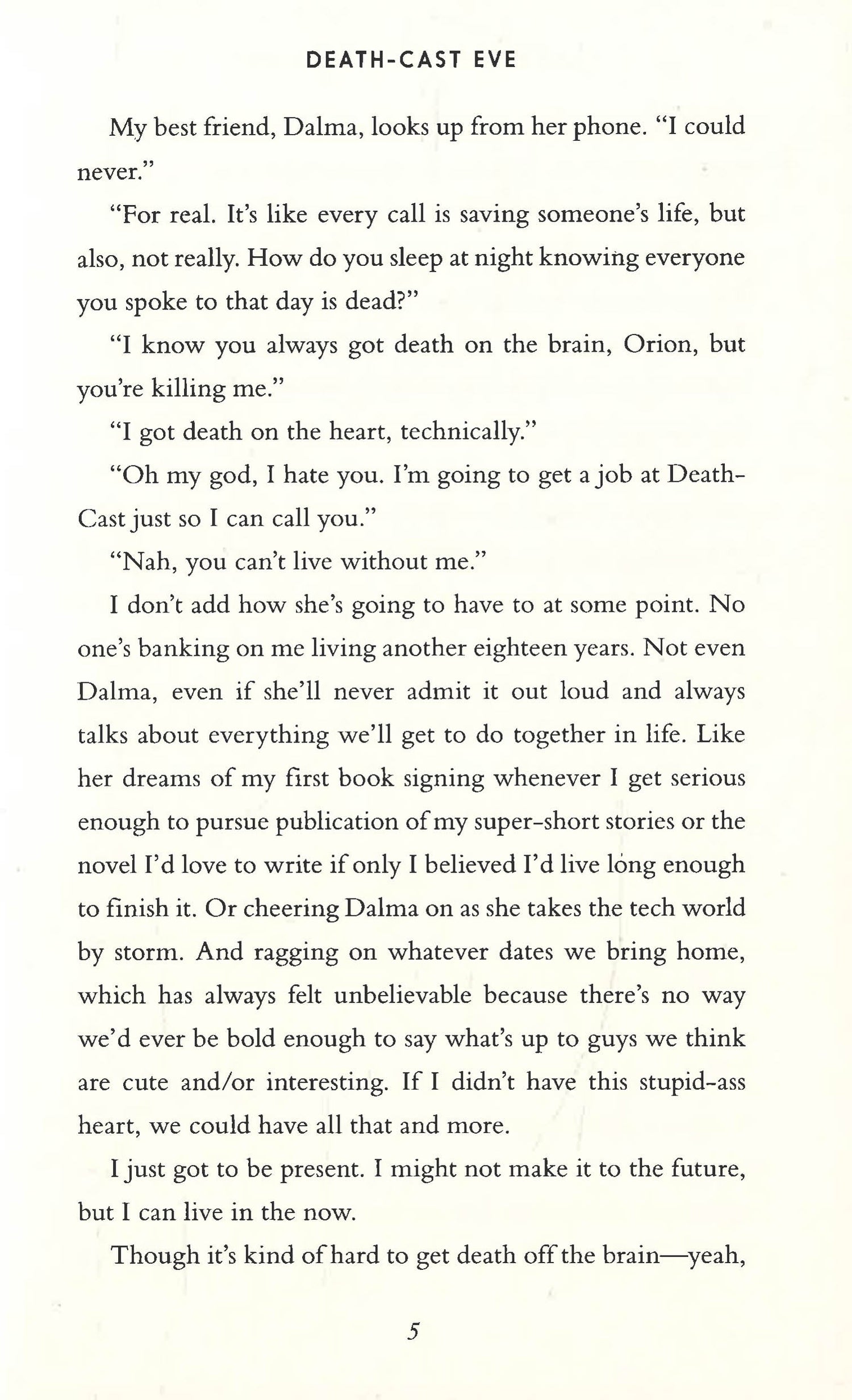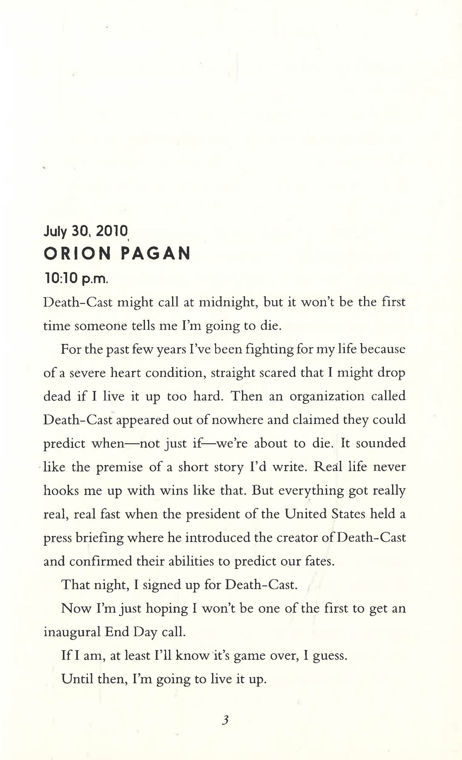 Orion Pagan has waited years for someone to tell him that he’s going to die. He has a serious heart condition, and he signed up for Death-Cast so he could know what’s coming.