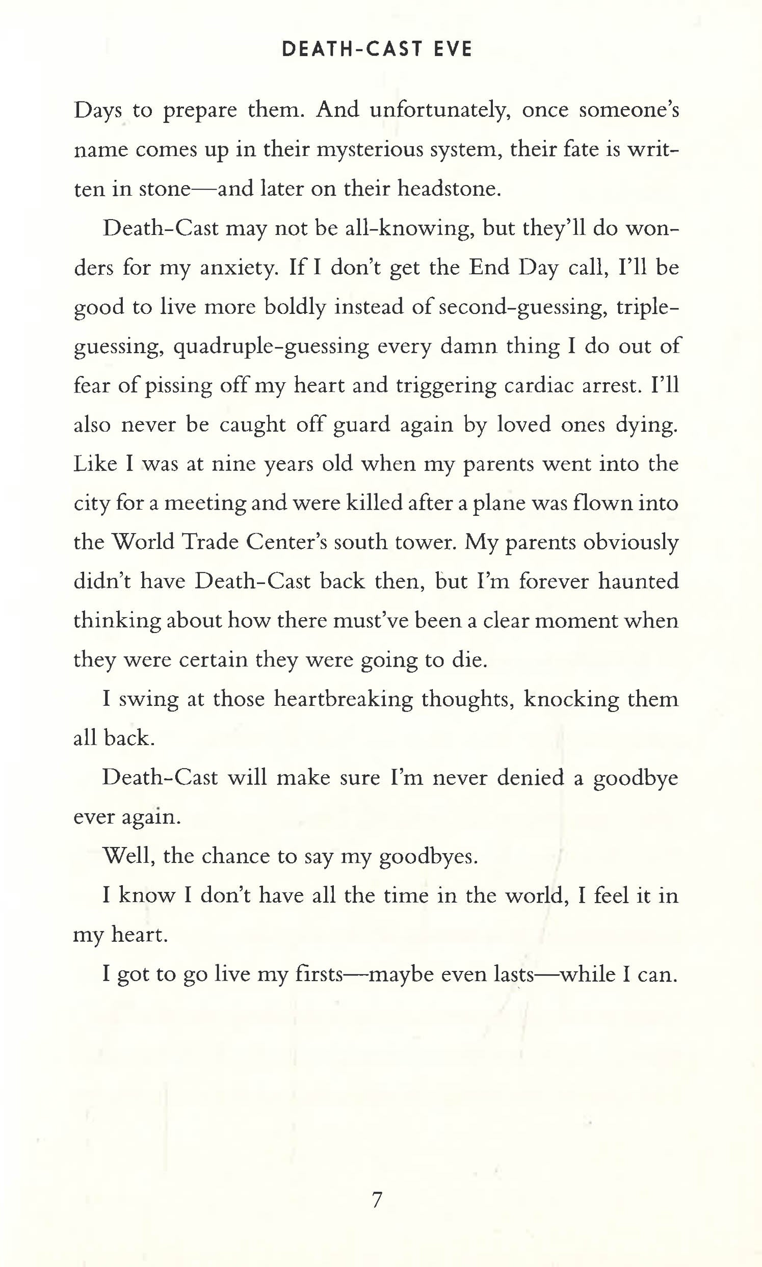 Valentino Prince is restarting his life in New York. He has a long and promising future ahead and he only registered for Death-Cast after his twin sister nearly died in a car accident.