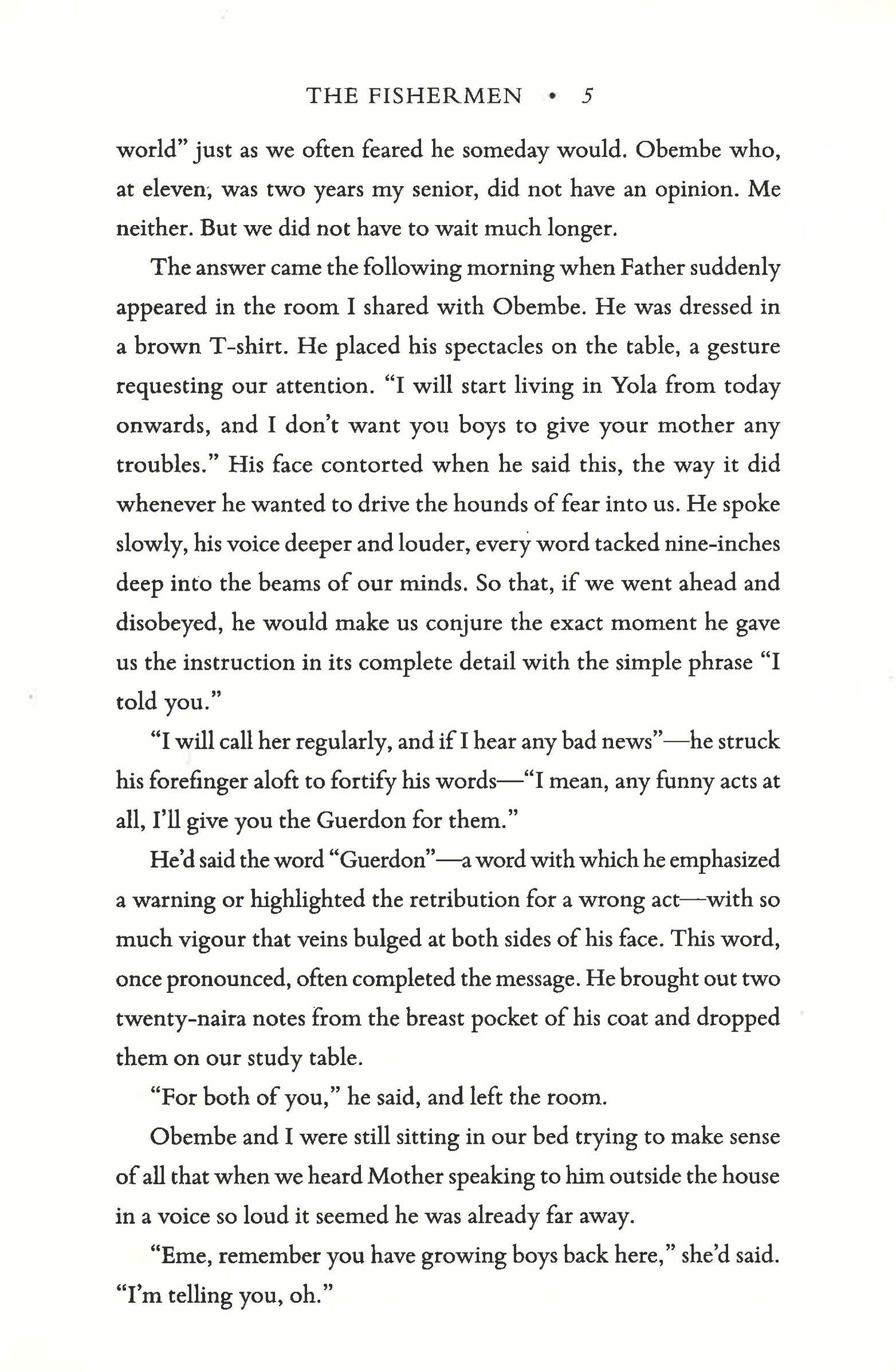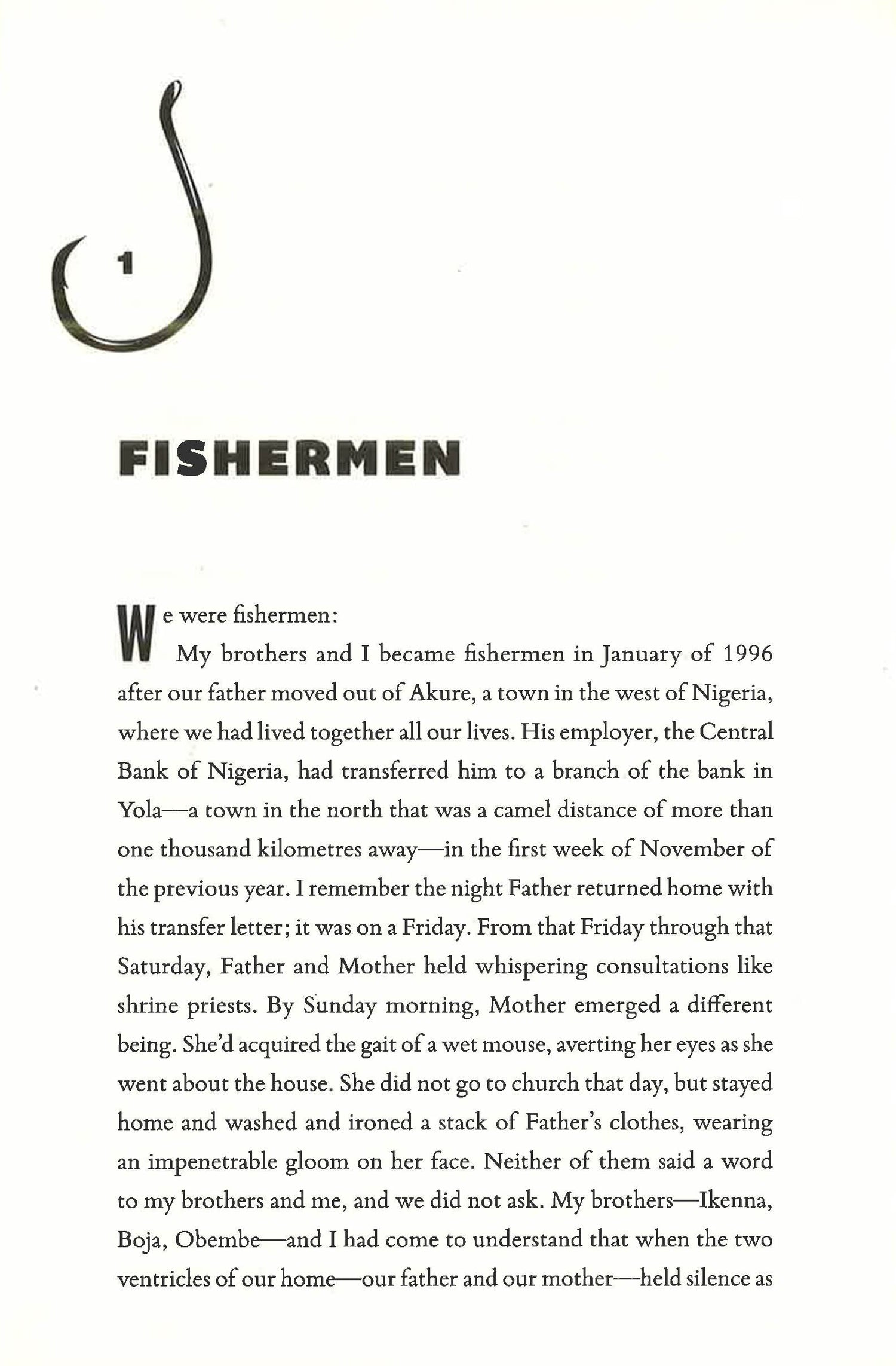 A striking debut novel about an unforgettable childhood, by a Nigerian writer the New York Times has crowned "the heir to Chinua Achebe." Told by nine-year-old Benjamin, the youngest of four brothers, The Fishermen is the Cain and Abel-esque story of a childhood in Nigeria, in the small town of Akure. When their father has to travel to a distant city for work, the brothers take advantage of his absence to skip school and go fishing. At the forbidden nearby river, they meet a madman who persuades the oldest of the boys that he is destined to be killed by one of his siblings. What happens next is an almost mythic event whose impact-both tragic and redemptive-will transcend the lives and imaginations of the book's characters and readers. Dazzling and viscerally powerful, The Fisherman is an essential novel about Africa, seen through the prism of one family's destiny.