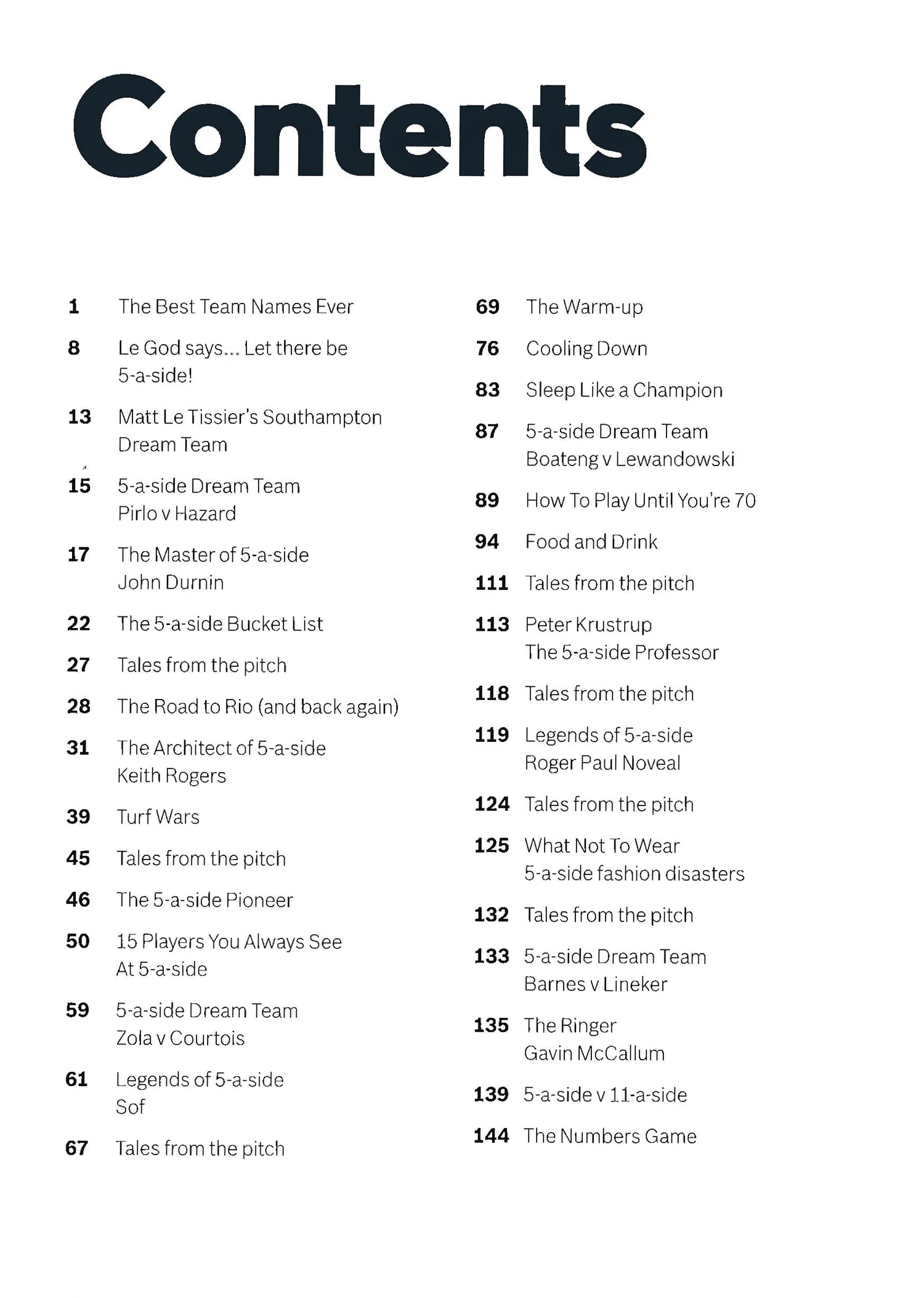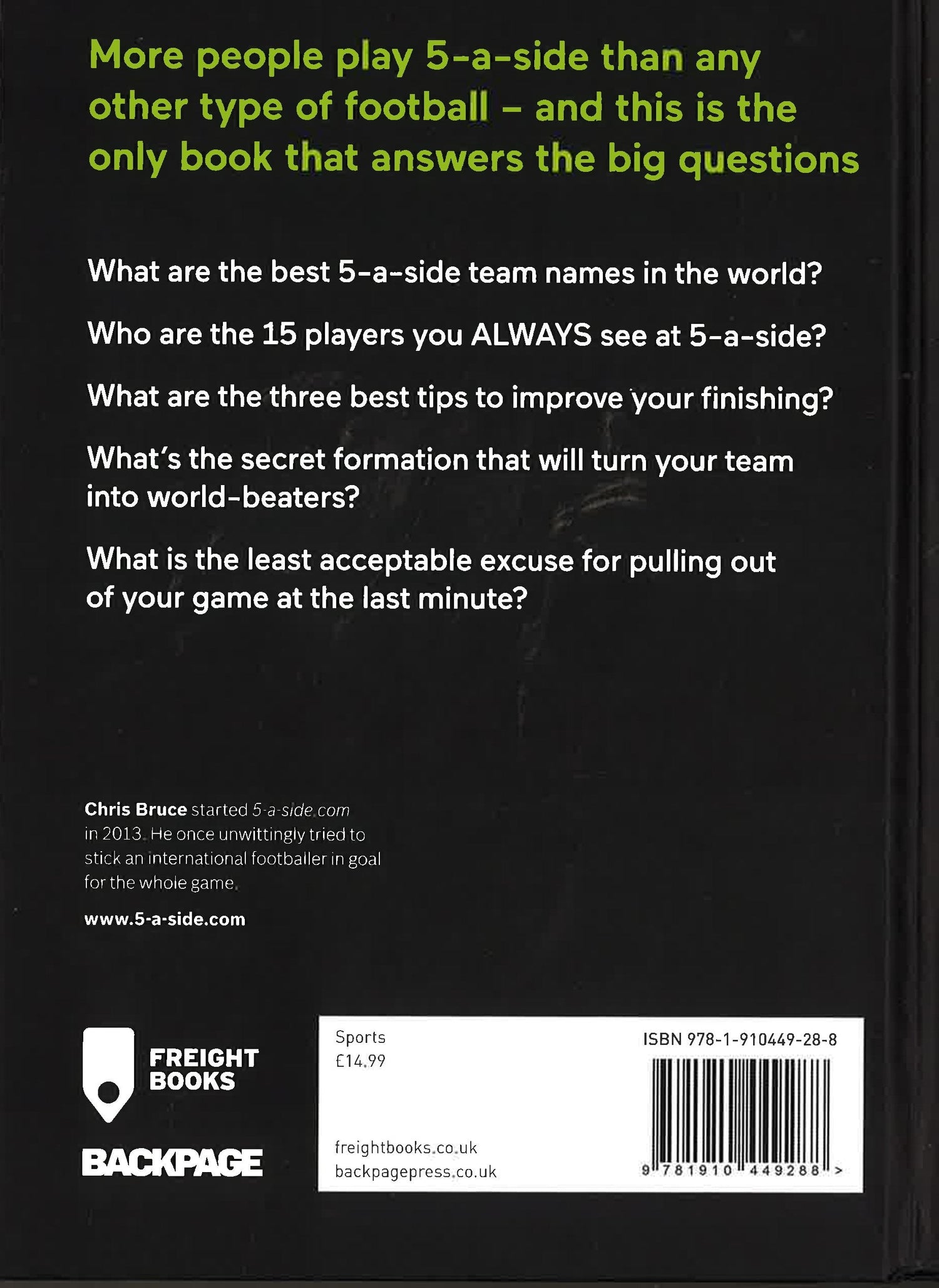 Magazine-style and full of humor, anecdotes and practical information, "The Five-a-Side Bible" covers sports science, tactics, nutrition, fitness warm-ups and warm-downs, but with an emphasis on fun. It reflects the shared experiences of participants and covers everything from the crazy team names The Neville Wears Prada, Murder on Zidane s Floor to wacky stories of ill-discipline and injuries, outlandish excuses for not playing, kit disasters, the five-a-side archetypes and tips from pros like former England international Matt Le Tissier and current Everton winger Aiden McGeady. Fully illustrated in color, "The Five-a-Side Bible" will profile the best five-a-side players in the UK and provide a bucket list including a pitch on top of a skyscraper in Shanghai and one on Copacabana beach for those who want to take their fives obsession to the next level."