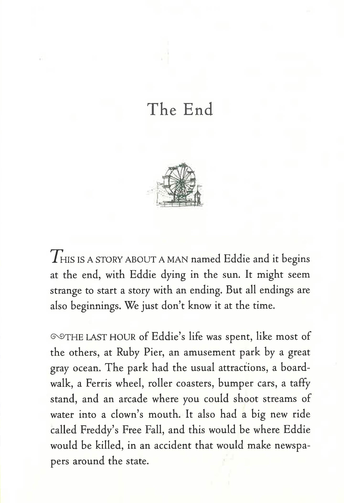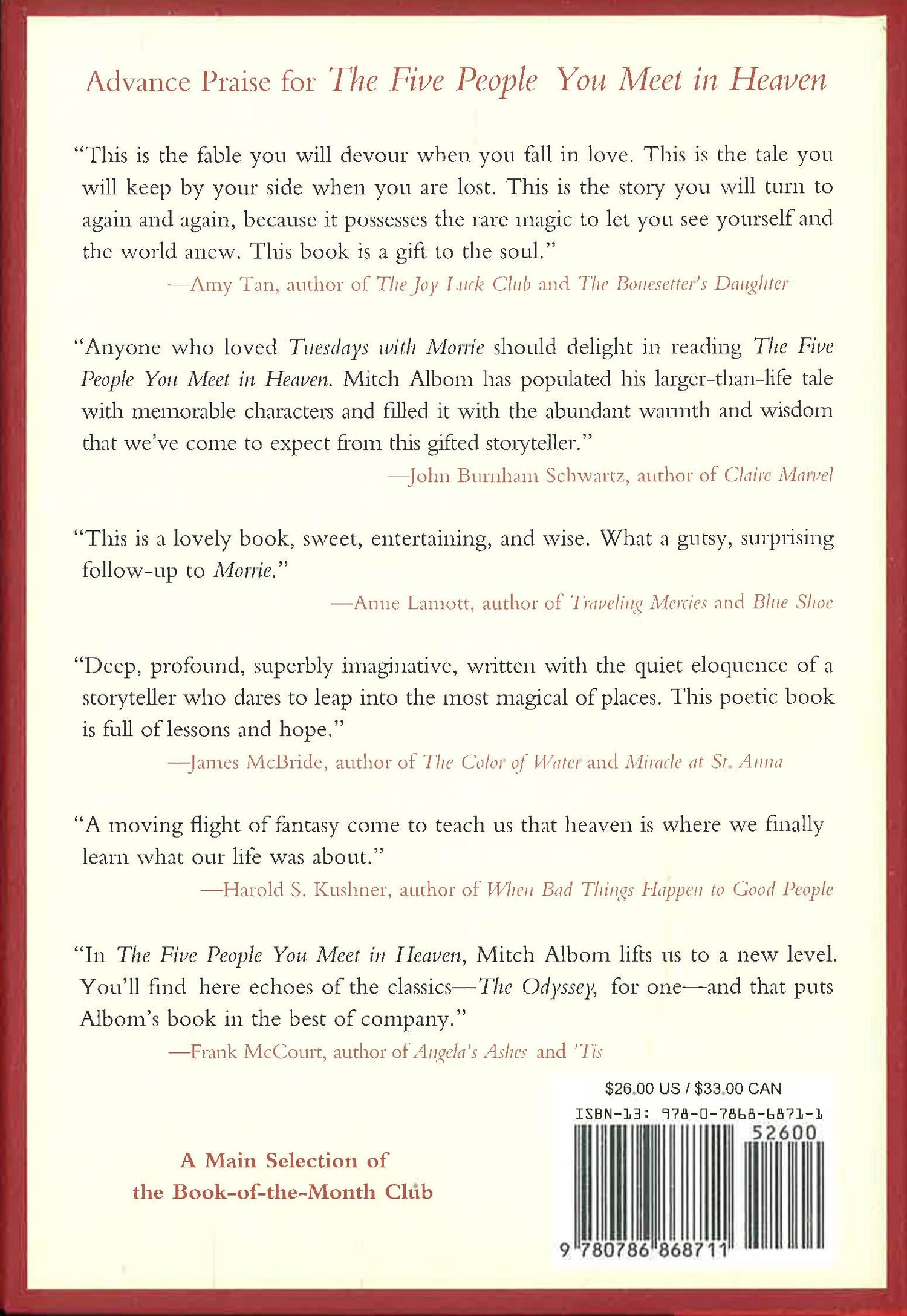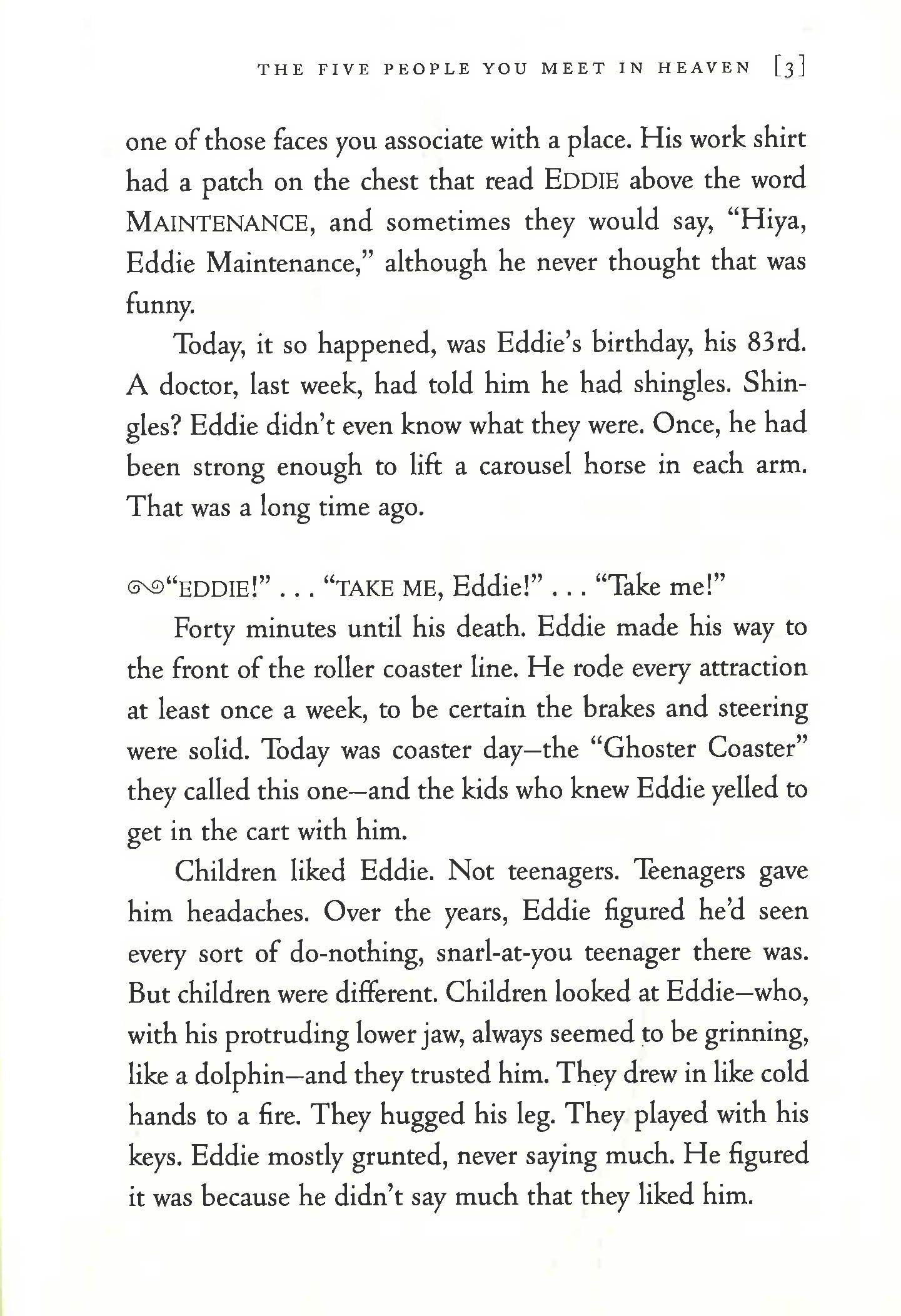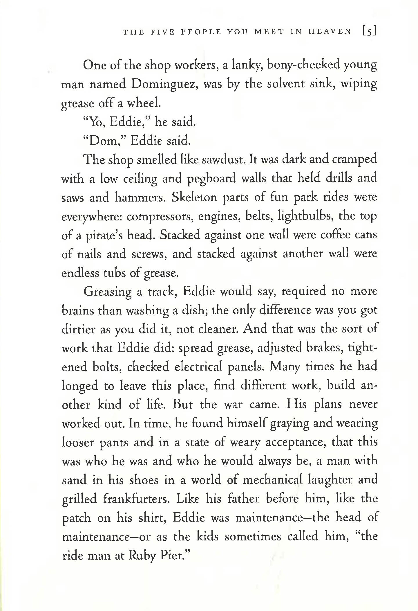 Eddie is a wounded war veteran, an old man who has lived, in his mind, an uninspired life. His job is fixing rides at a seaside amusement park. On his 83rd birthday, a tragic accident kills him, as he tries to save a little girl from a falling cart. He awakes in the afterlife, where he learns that heaven is not a destination. It's a place where your life is explained to you by five people, some of whom you knew, others who may have been strangers. One by one, from childhood to soldier to old age, Eddie's five people revisit their connections to him on earth, illuminating the mysteries of his "meaningless" life, and revealing the haunting secret behind the eternal question: "Why was I here?