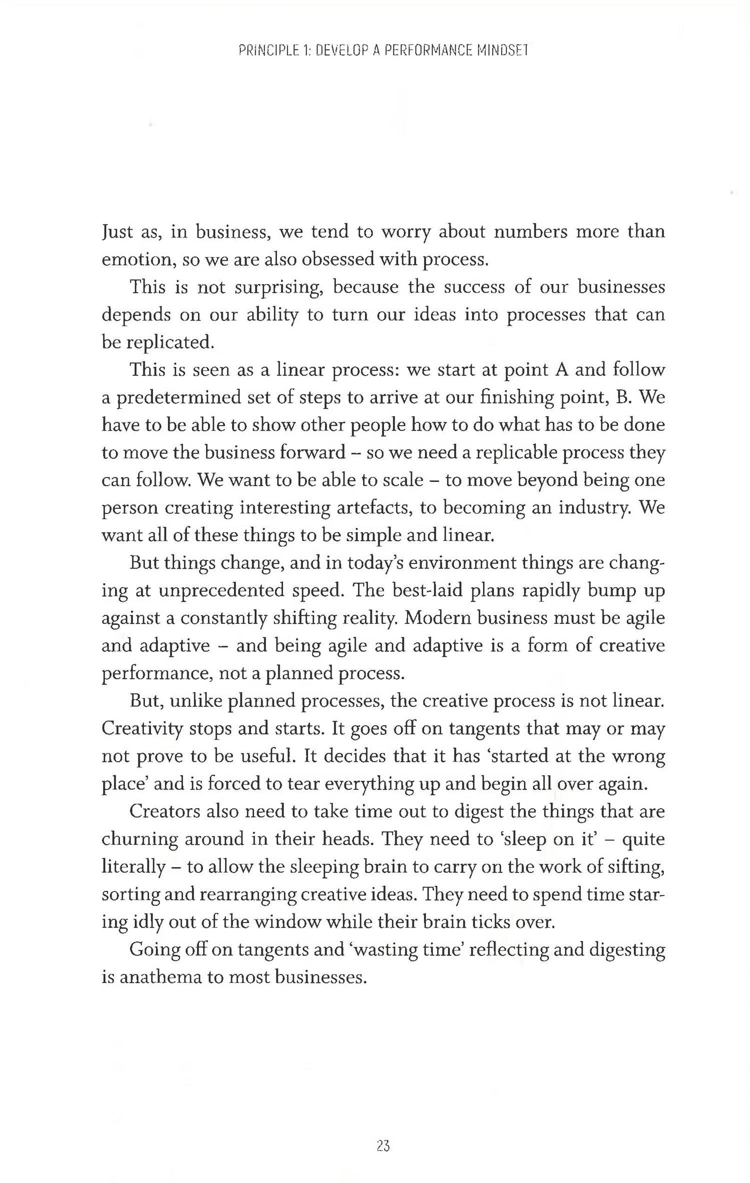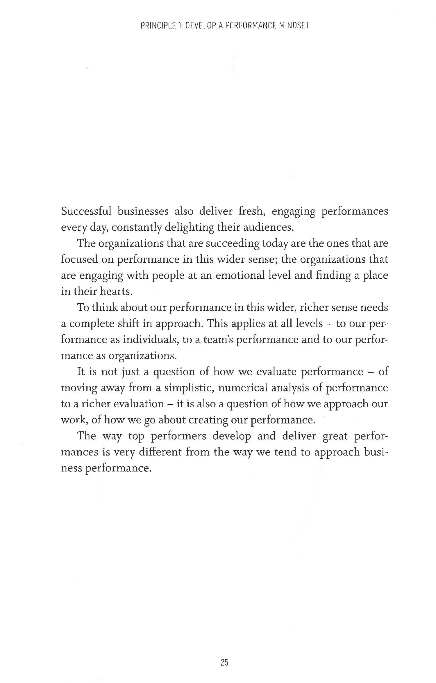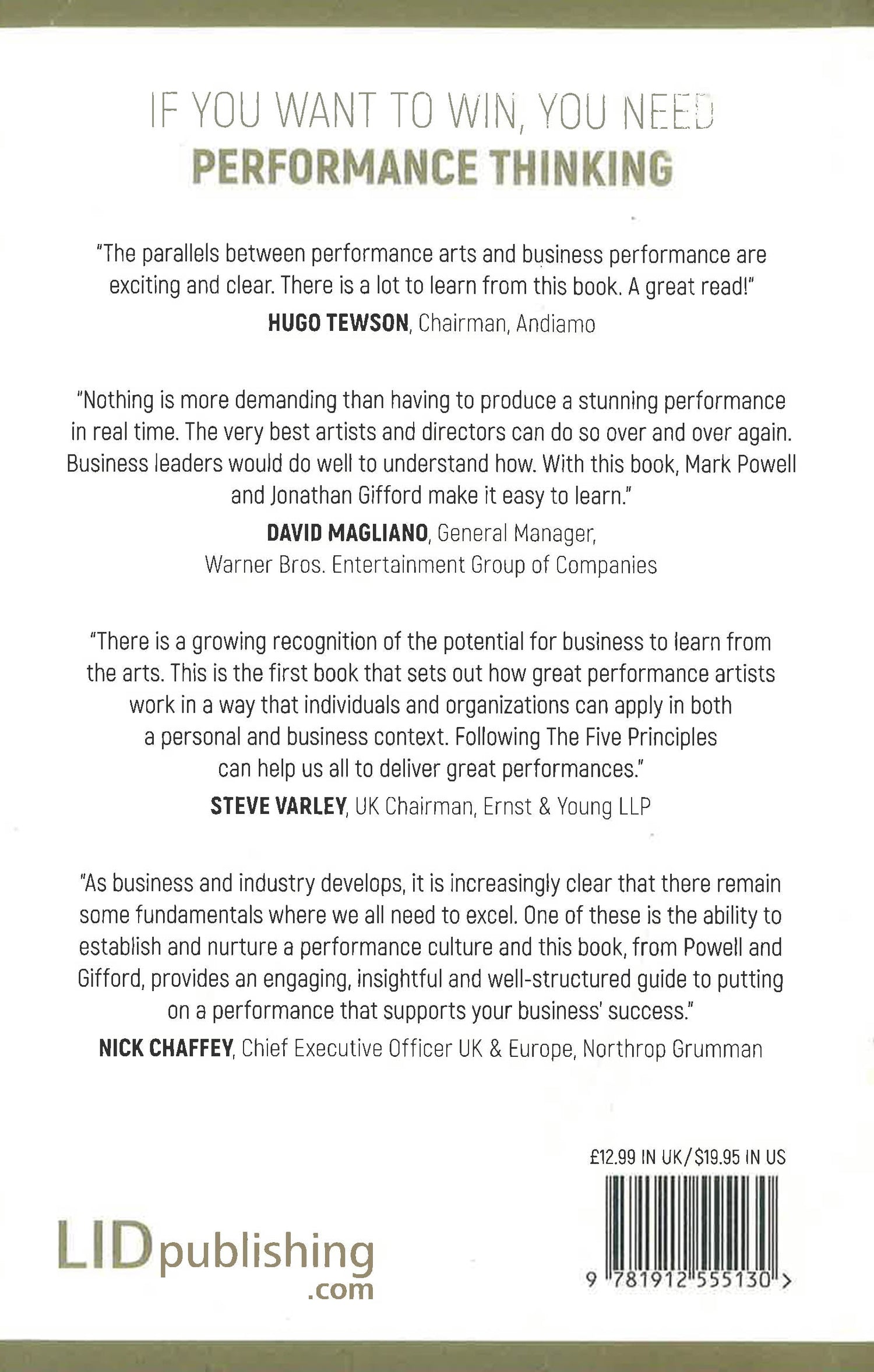 When it comes to performance, great businesses and impressive individuals do more than simply deliver their numbers. They also engage with us; they make a human connection; a great performance moves us in some fundamental way. Great companies, great teams, and great individuals are defined y a wider set of abilities that create extraordinary levels of performance. This book explores the mindsets and techniques used by top performing artists and adapts these for the creation and delivery of great business performance. Based on five core principles - 'Adopt the Artistic Mindset', 'Build Connected Ensembles', 'Create Compelling Narrative', 'Rehearse Creatively', 'Deliver Brilliant Performances' - the authors bring together unique perspectives and methods for anyone in business who wants to excel in their work and career.