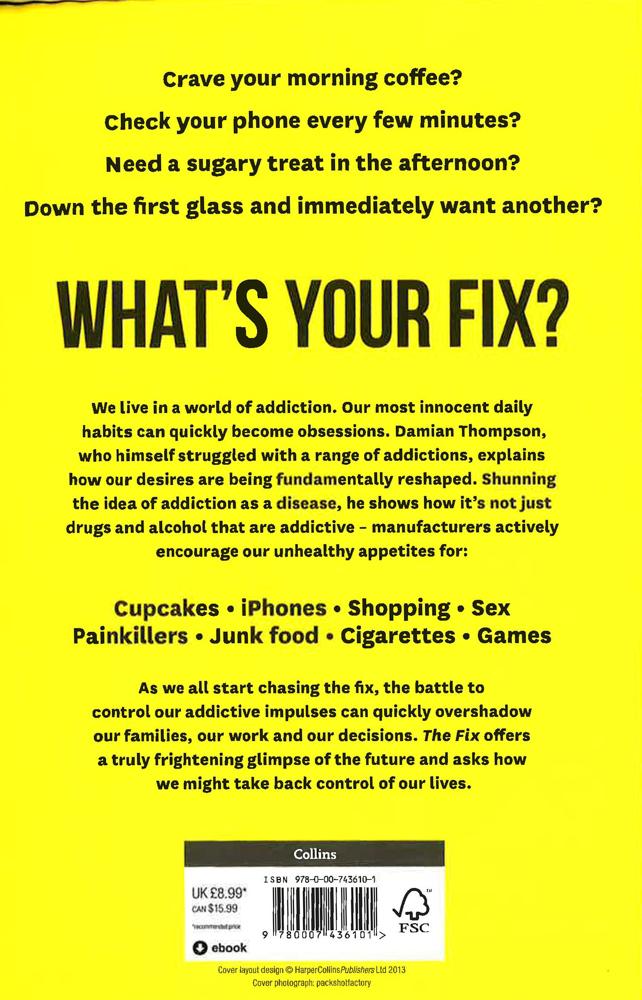 Addictions to iphones, painkillers, cupcakes, alcohol and sex are taking over our lives. Our most casual daily habits can quickly become obsessions that move beyond our control. Damian Thompson, who has himself struggled with a range of addictions, argues that human desire is in the process of being reshaped. Shunning the concept of addiction as disease, he shows how manufacturers are producing substances like ipads, muffins and computer games that we learn to like too much and supplement tradition addictions to alcohol, drugs and gambling. He argues that addictive behaviour is becoming a substitute for family and work bonds that are being swept away by globalisation and urbanisation. This battle to control addiction will soon overshadow familiar ideological debates about how to run the economy, and as whole societies set about "fixing" themselves, the architecture of human relations will come under strain as never before. The Fix offers a truly frightening glimpse of the future and is essential reading for fans of Naomi Klein's 'No Logo', Oliver James's 'Affluenza' and Francis Wheen's 'How Mumbo-jumbo Conquered the World'.