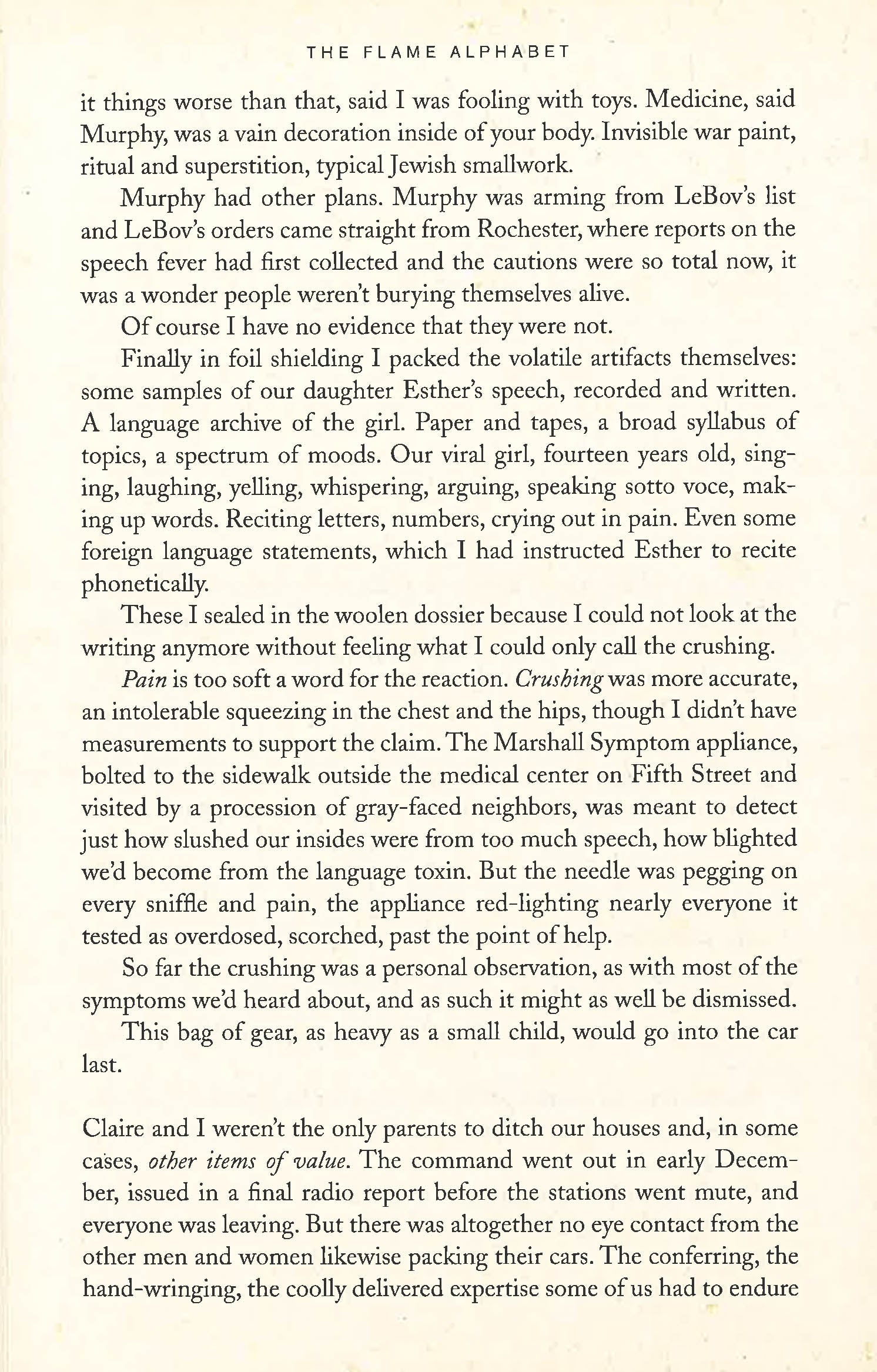 In The Flame Alphabet, the most maniacally gifted writer of our generation delivers a novel about how far we will go in order to protect our loved ones. The sound of children's speech has become lethal. In the park, adults wither beneath the powerful screams of their offspring. For young parents Sam and Claire, it seems their only means of survival is to flee from their daughter, Esther. But they find it isn't so easy to leave someone you love, even as they waste away from her malevolent speech. On the eve of their departure, Claire mysteriously disappears, and Sam, determined to find a cure for this new toxic language, presses on alone into a foreign world to try to save his family. *This book may have remainder mark*