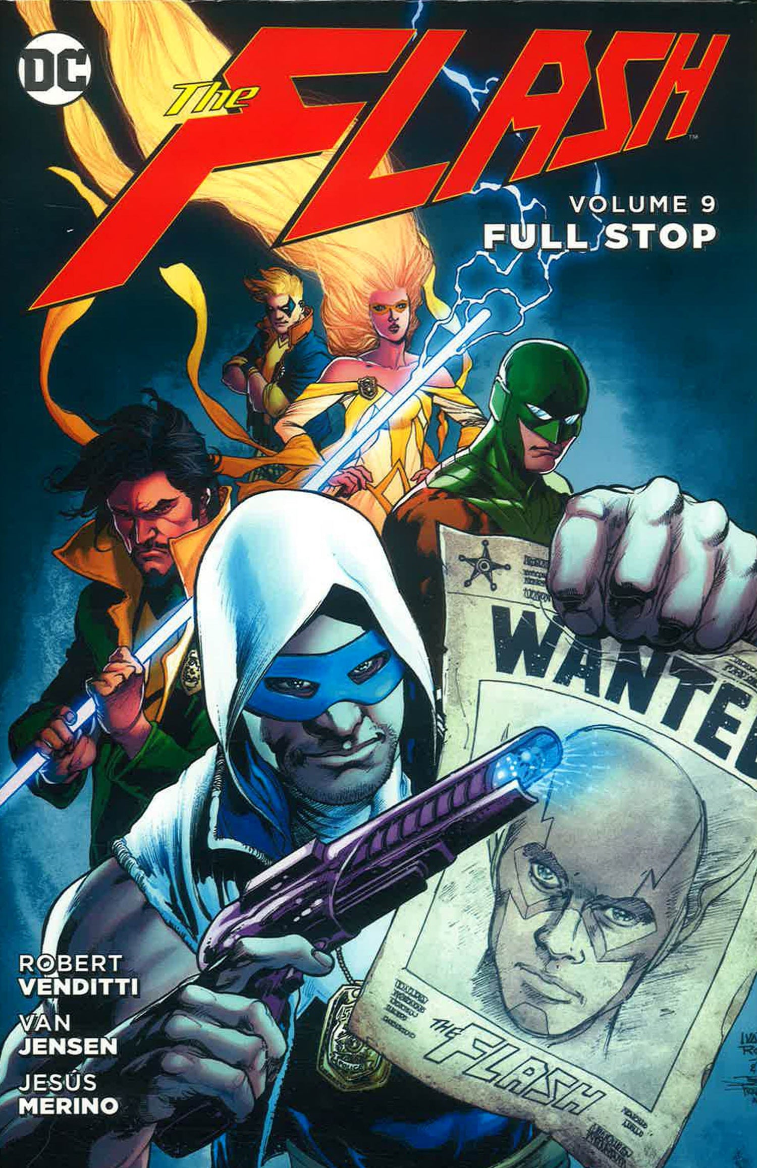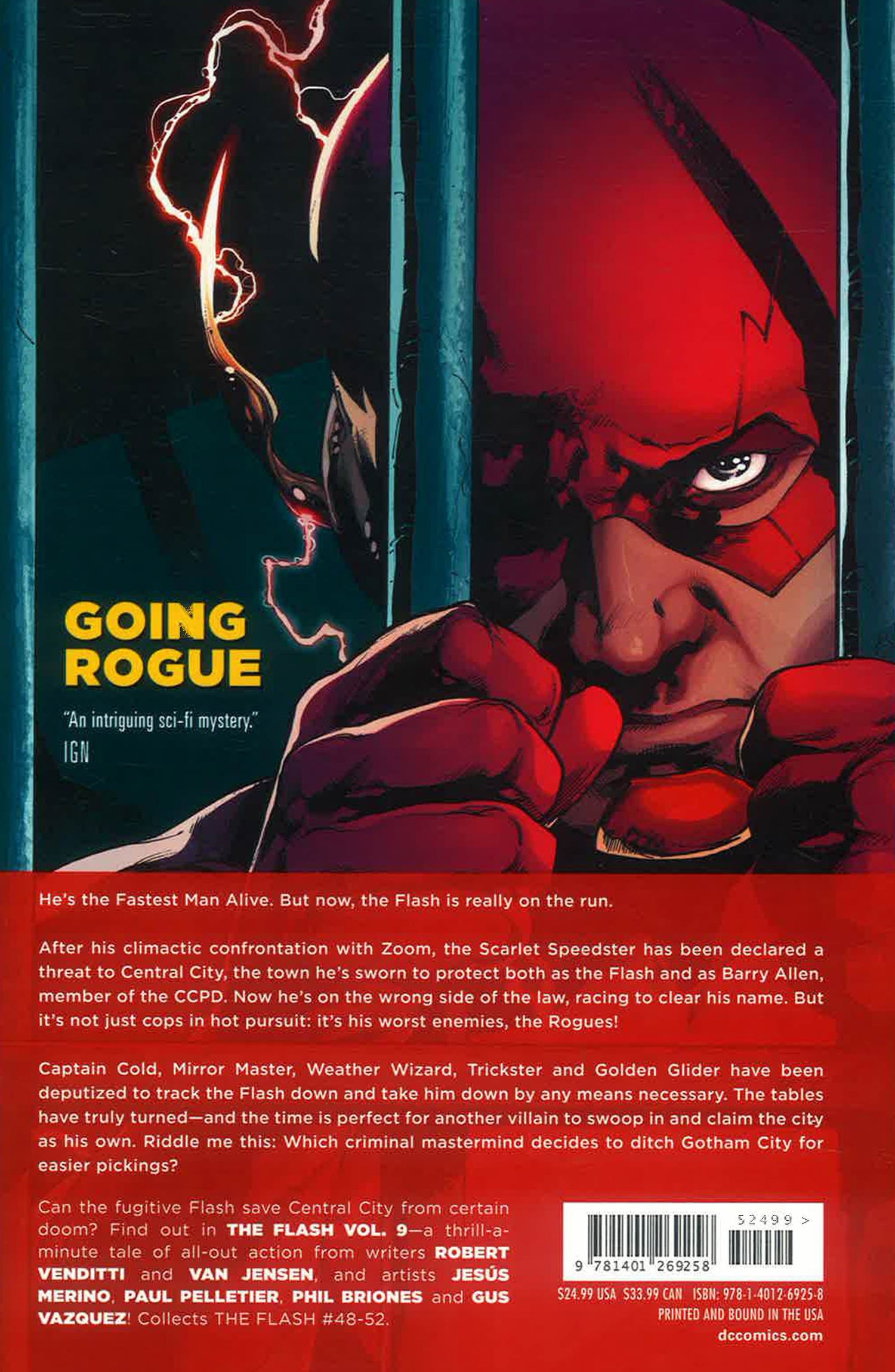 Can the fugitive Flash save Central City from certain doom? Find out in THE FLASH VOL. 9—a thrill-a-minute tale of all-out action from writers Robert Venditti and Van Jensen, and artists Jesus Merino, Paul Pelletier, Phil Briones and Gus Vasquez! Collects THE FLASH #48-52.