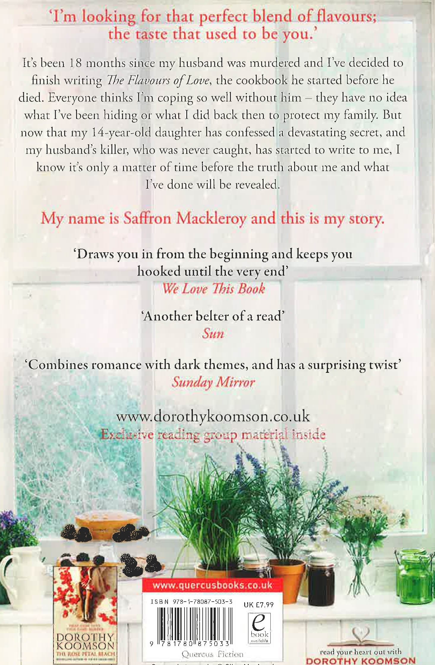 I'm looking for that perfect blend of flavours; the taste that used to be you.' It's been 18 months since my husband was murdered and I've decided to finish writing The Flavours of Love, the cookbook he started before he died. Everyone thinks I'm coping so well without him - they have no idea what I've been hiding or what I did back then to protect my family. But now that my 14-year-old daughter has confessed a devastating secret, and my husband's killer, who was never caught, has started to write to me, I know it's only a matter of time before the truth about me and what I've done will be revealed. My name is Saffron Mackleroy and this is my story.
