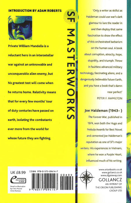 One of the very best must-read SF novels of all time.Private William Mandella is a reluctant hero in an interstellar war against an unknowable and unconquerable alien enemy. But his greatest test will be when he returns home. Relativity means that for every few months' tour of duty centuries have passed on Earth, isolating the combatants ever more from the world for whose future they are fighting.