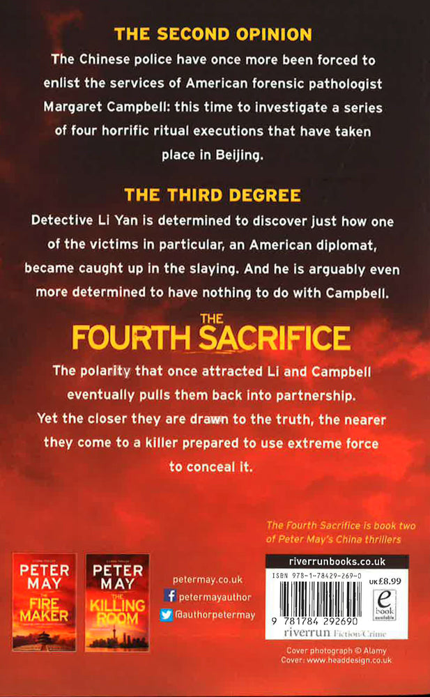 Li Yan and Margaret Campbell are reluctantly reunited, on the trail of a killer reenacting a series of gruesome rituals.PETER MAY: OVER 3 MILLION COPIES SOLD'A TERRIFIC WRITER' MARK BILLINGHAM'WONDERFULLY COMPELLING' KATE MOSSEIn the second novel in the China series, Li Yan and Margaret Campbell are reluctantly reunited, on the trail of a killer reenacting a series of gruesome ritualsTHE SECOND OPINIONThe Chinese police have once more been forced to enlist the services of American forensic pathologist Margaret Campbell: this time to investigate a series of four horrific ritual executions that have taken place in Beijing.THE THIRD DEGREEDetective Li Yan is determined to discover just how one of the victims in particular, an American diplomat, became caught up in the slaying. And he is arguably even more determined to have nothing to do with Campbell.THE FOURTH SACRIFICEThe polarity that once attracted Yan and Campbell eventually pulls them back into partnership. Yet the closer they are drawn to the truth, the nearer they come to a killer prepared to use extreme force to conceal it.LOVED THE FOURTH SACRIFICE? Read the third book in the series, THE KILLING ROOM.LOVE PETER MAY? Buy his new thriller, A SILENT DEATH.