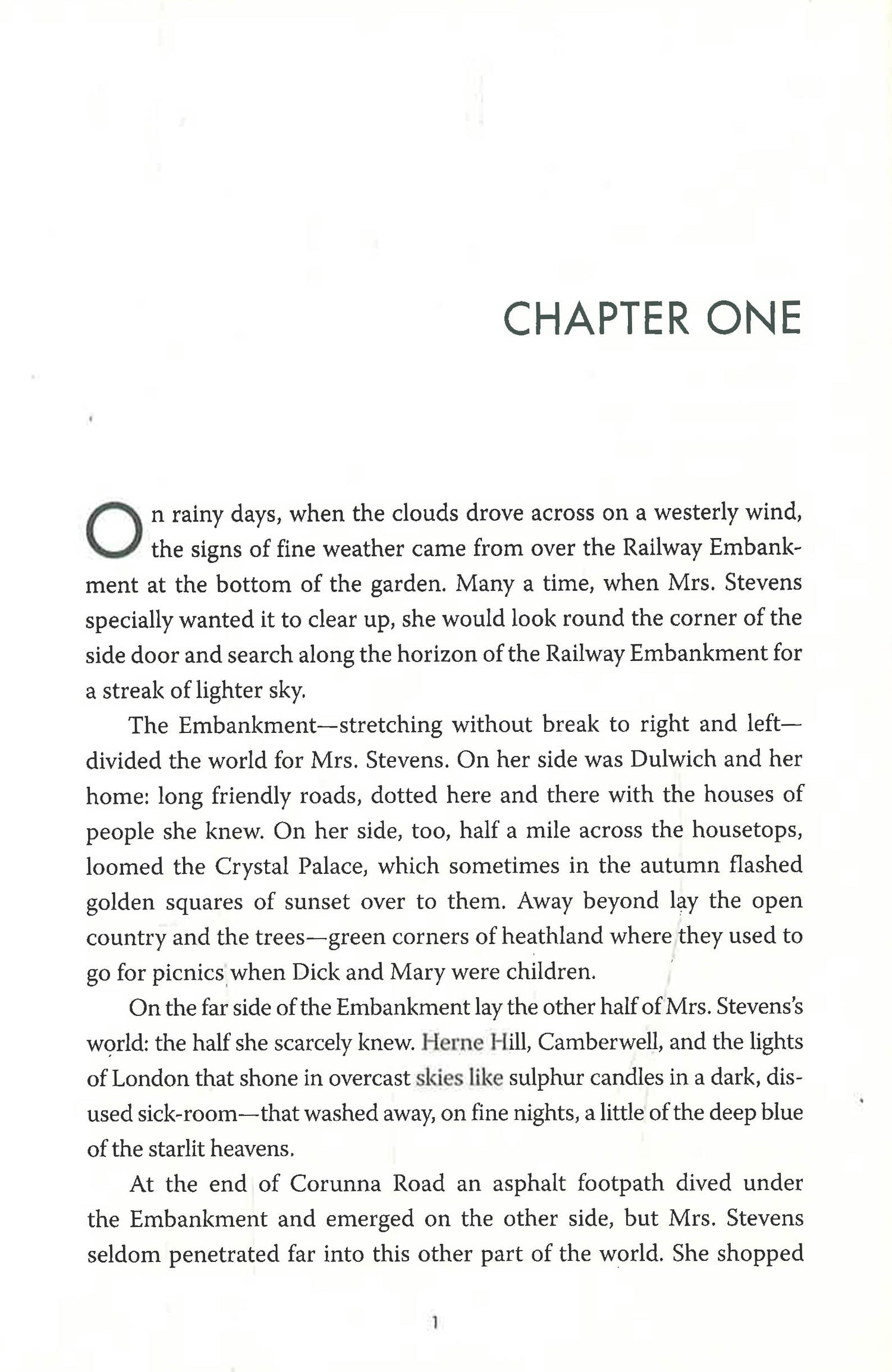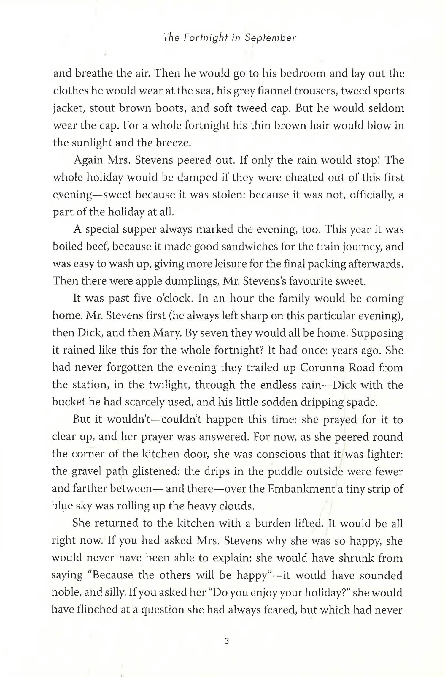 Mr. Stevens goes on his annual walk across the downs, reflecting on his life, his worries and disappointments, and returns refreshed. Mrs. Stevens treasures an hour spent sitting alone with her medicinal glass of port. Mary has her first small taste of romance. And Dick pulls himself out of the malaise he’s sunk into since graduation, resolving to work towards a new career. The Stevenses savor every moment of their holiday, aware that things may not be the same next year.