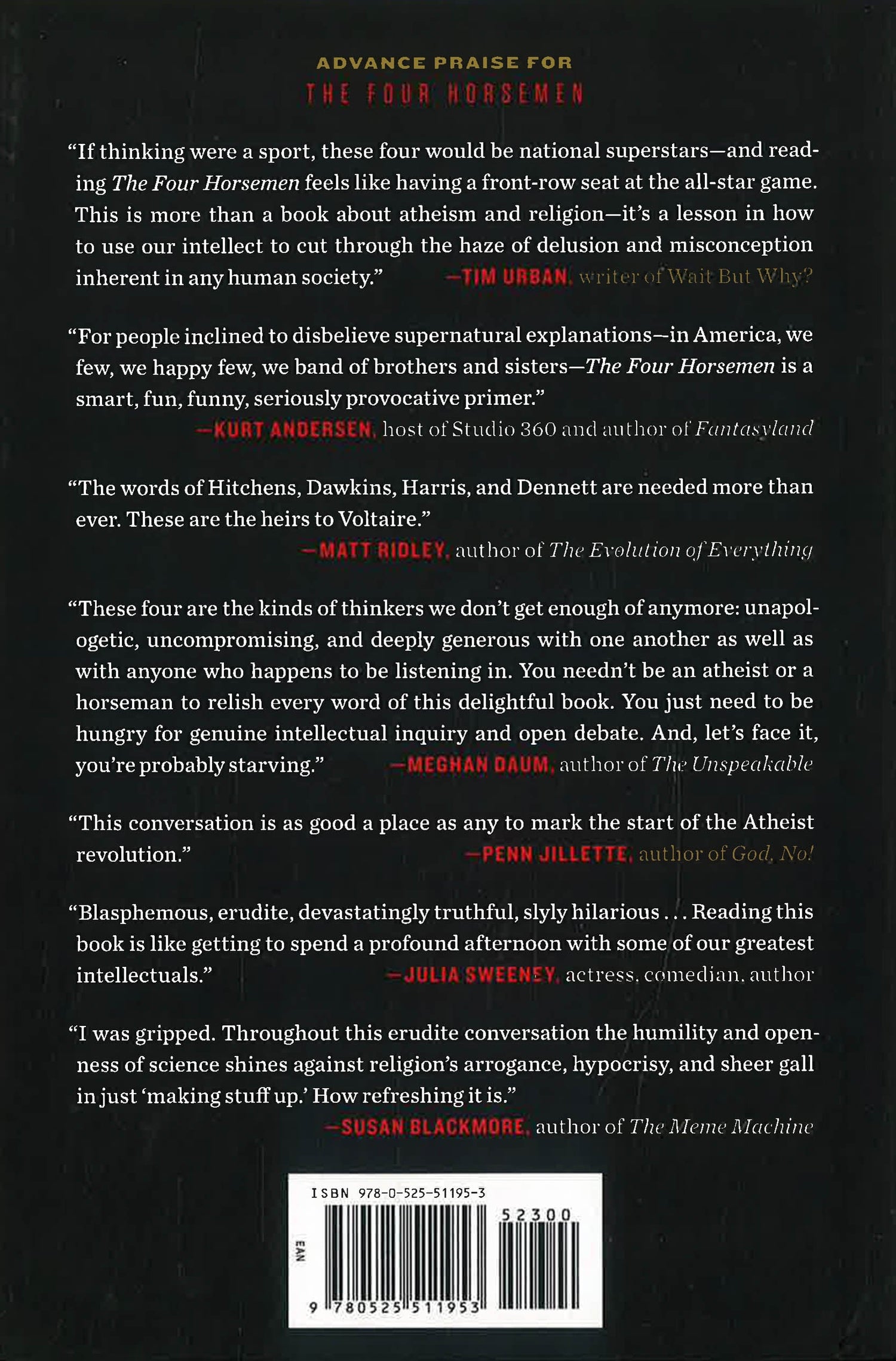 At the dawn of the new atheist movement, the thinkers who became known as “the four horsemen,” the heralds of religion's unraveling—Christopher Hitchens, Richard Dawkins, Sam Harris, and Daniel Dennett—sat down together over cocktails. What followed was a rigorous, pathbreaking, and enthralling exchange, which has been viewed millions of times since it was first posted on YouTube. This is intellectual inquiry at its best: exhilarating, funny, and unpredictable, sincere and probing, reminding us just how varied and colorful the threads of modern atheism are.