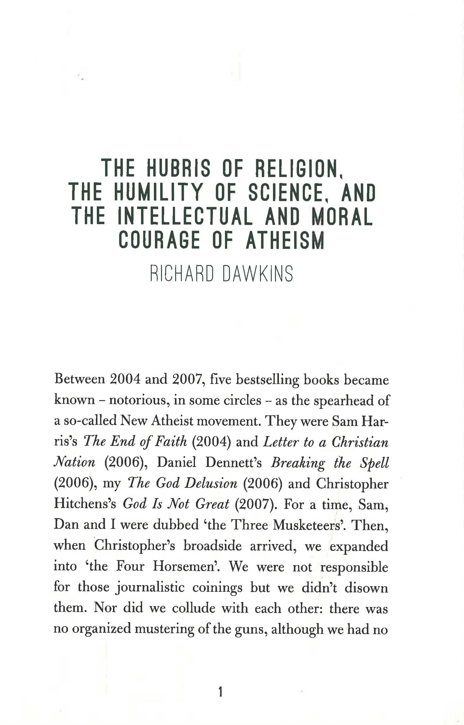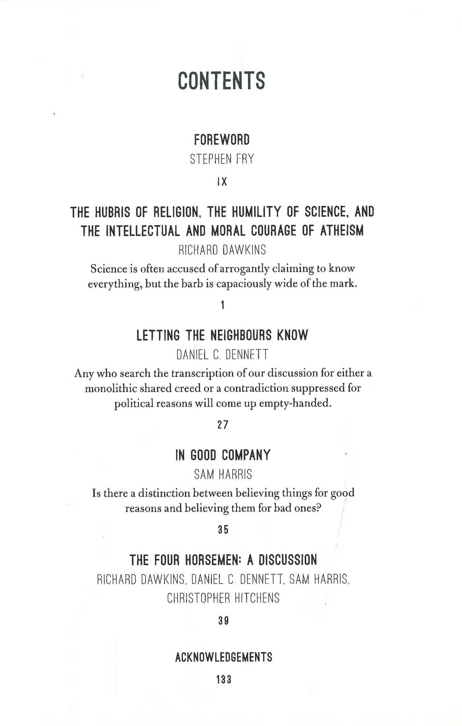 Here is the transcript of that conversation, in print for the first time, augmented by material from the living participants: Dawkins, Harris, and Dennett. These new essays, introduced by Stephen Fry, mark the evolution of their thinking and highlight particularly resonant aspects of this epic exchange. Each man contends with the most fundamental questions of human existence while challenging the others to articulate their own stance on God and religion, cultural criticism, spirituality, debate with people of faith, and the components of a truly ethical life.