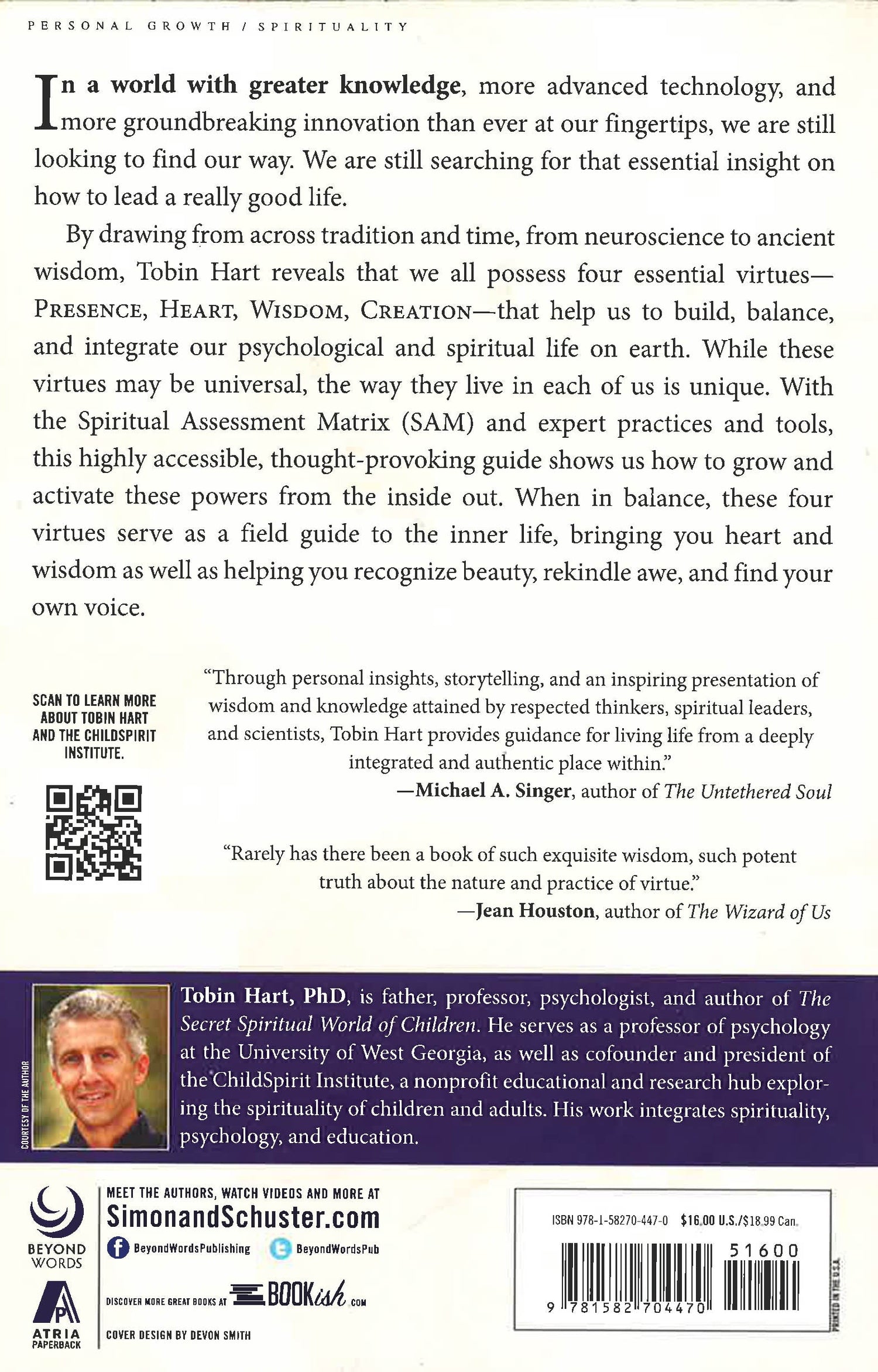 Most of us are hungry for a life of meaning, connection, and fulfilment, but in the midst of today's demands and pressures, a deeper life doesn't come automatically. We must increasingly focus on certain virtues-four universal principles needed to foster wholeness and meaningful purpose in humanity. Drawing from decades of research across the wisdom traditions, neuroscience, psychology, poetry, physics, religion, the arts, and literature, The Four Virtues provides a field guide for developing your deepest self. The Spiritual Assessment Matrix of targeted quizzes shows you where you are in relation to the virtues of Presence, Heart, Wisdom, and Creation, and expert practices and tools help you "activate" them in your life. In addition, internationally respected author, professor, and psychologist Tobin Hart speaks directly to anyone-whether religious or secular-looking to live by a contemporary set of ethics to frame their self-development and happiness. Highly accessible, thought provoking, and interactive, The Four Virtuesprovides a ground-breaking way to engage and flourish in life. *This book may have remainder mark*