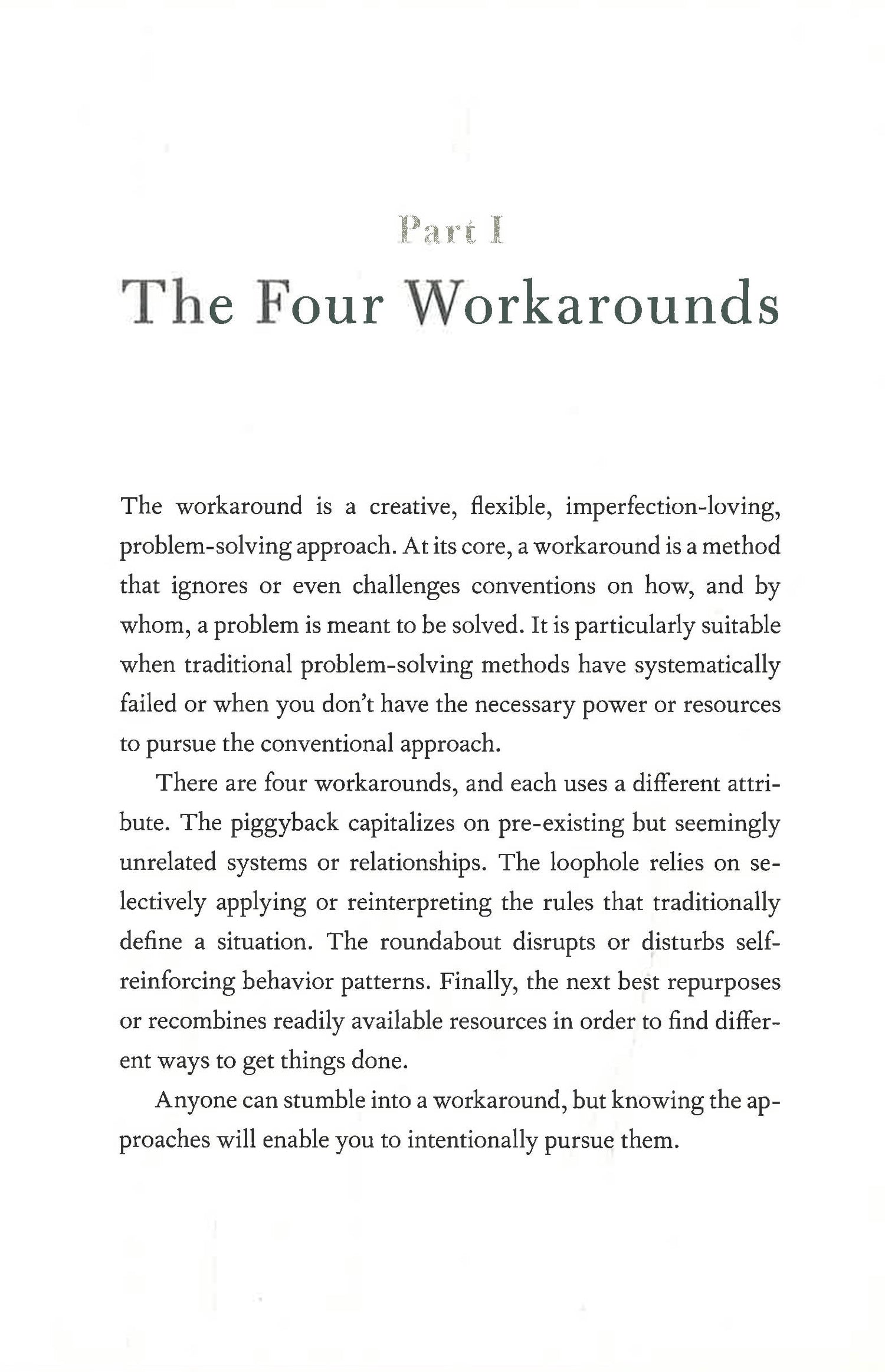 We constantly encounter complex problems at home, in our places of work, and in society at large. Even if we had all the time and money in the world, sometimes no good solution can be found. So, what should we do, especially when we can't wait? The answer: a workaround.