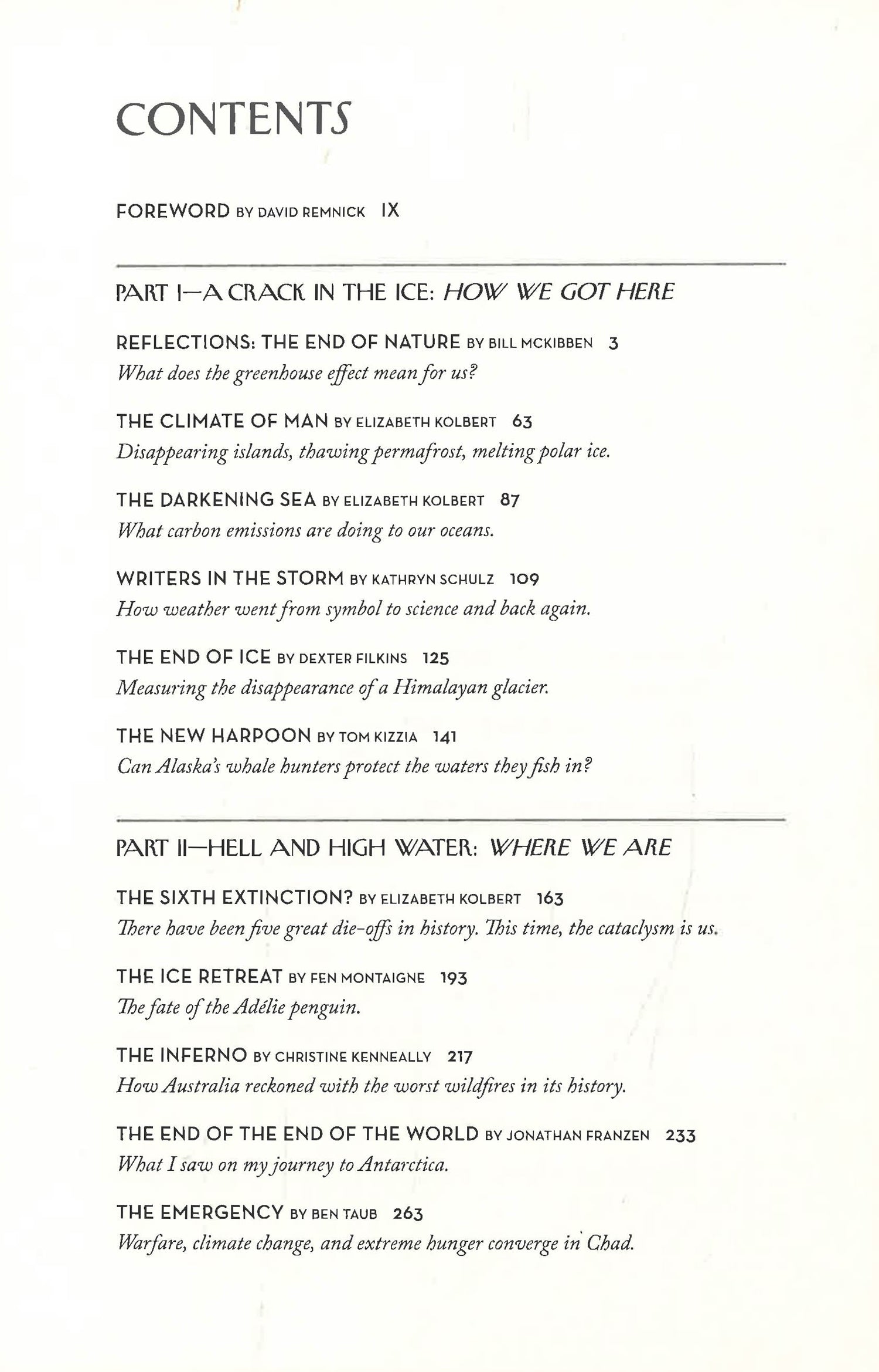 A collection of the New Yorker’s groundbreaking reporting from the front lines of climate change—including writing from Bill McKibben, Elizabeth Kolbert, Ian Frazier, Kathryn Schulz, and more