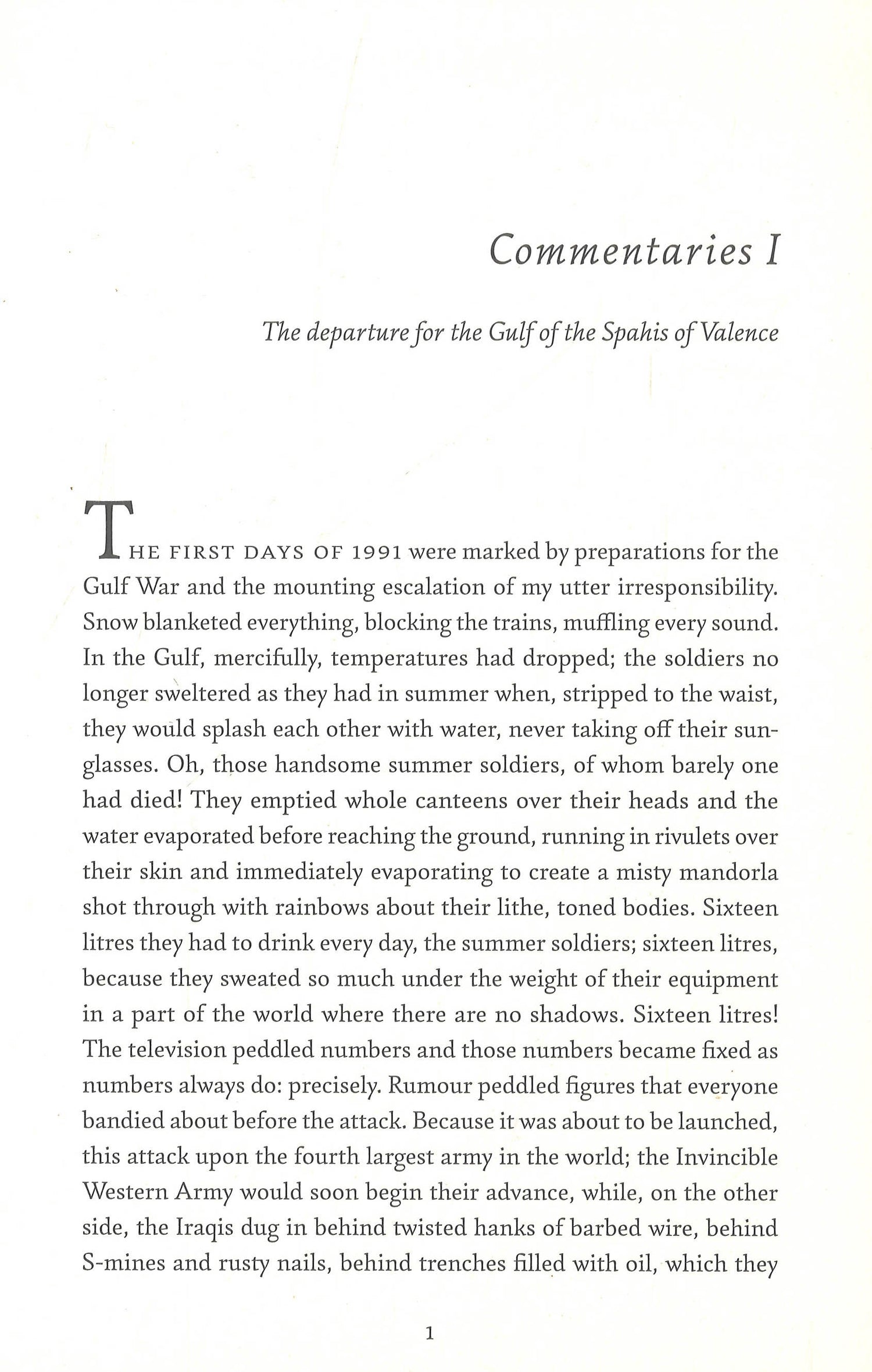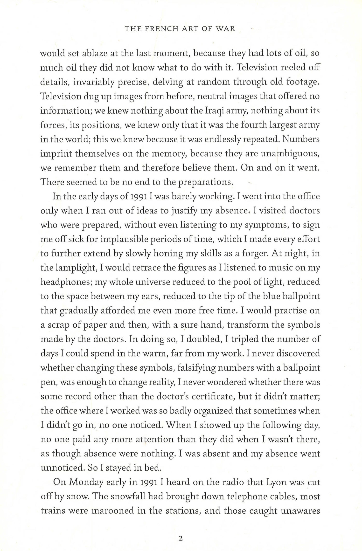 It was the beginning of the Gulf War. I watched it on TV and did little else. I was doing badly, you see. Everything was going wrong. I just awaited the end. But then I met Victorien Salagnon, a veteran of the great colonial wars of Indochina, Vietnam and Algeria, a commander who had led his soldiers across the globe, a man with the blood of others up to his elbows. He said he would teach me to paint; he must have been the only painter in the French Forces, but out there no one cares about such things. I cared, though. In return, he wanted me to write his life story. And so he talked, and I wrote, and through him I witnessed the rivers of blood that cut channels through France, I saw the deaths that were as numberless as they were senseless and I began finally to understand the French art of war.