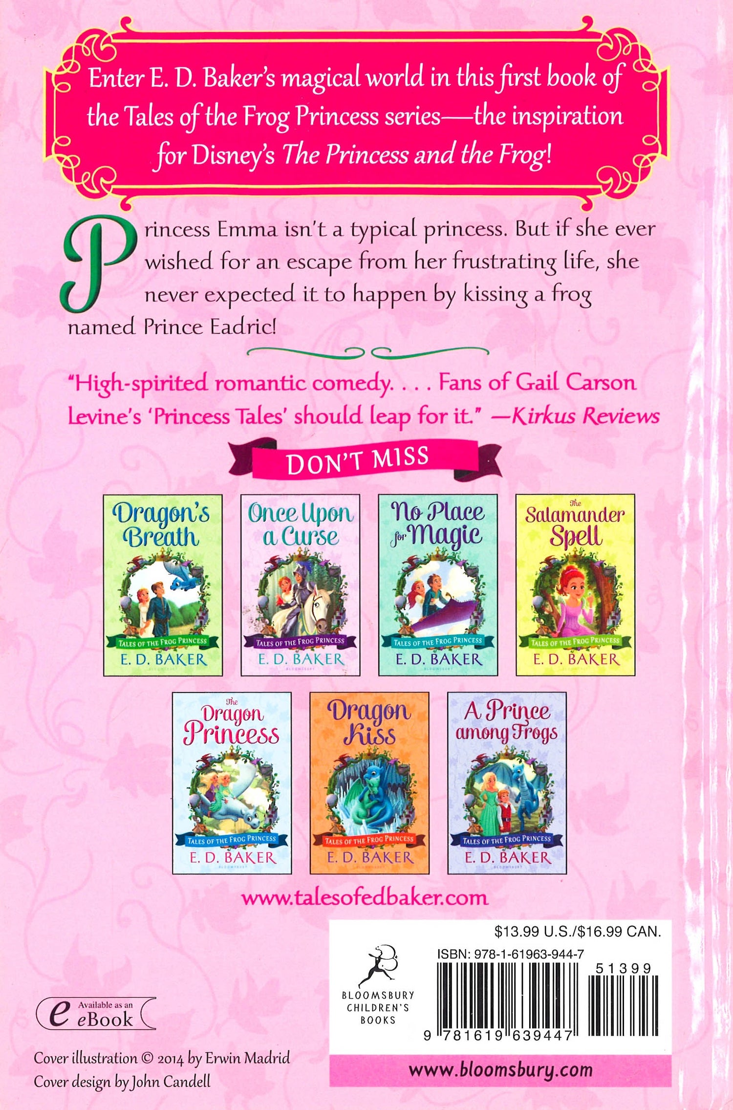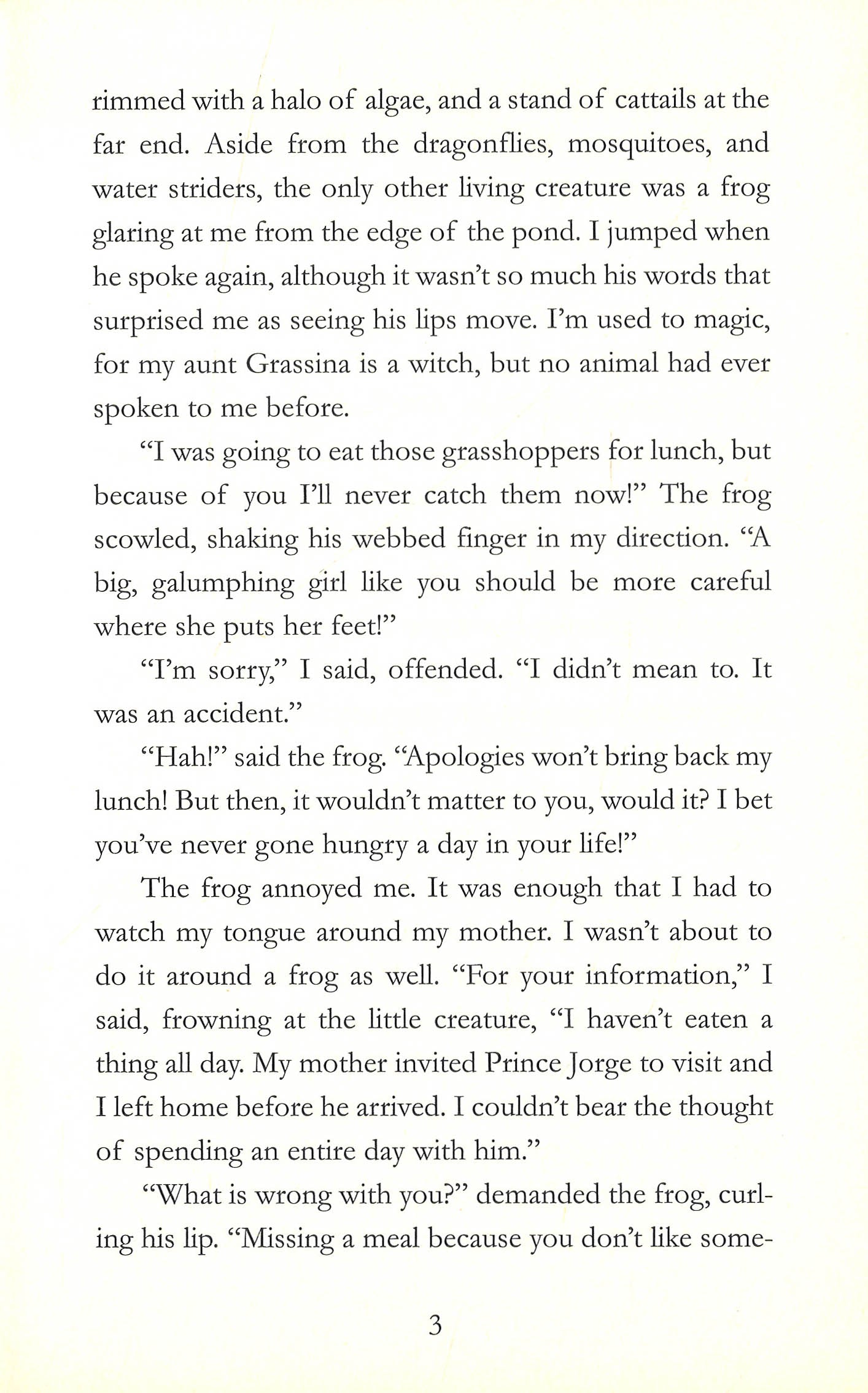 Princess Emeralda a.k.a. Emma isn't exactly an ideal princess. Her laugh is more like a donkey's bray than tinkling bells, she trips over her own feet and she does not like Prince Jorge, whom her mother hopes she will marry. But if Emma ever thought to escape her troubles, she never expected it to happen by turning into a frog! When convinced to kiss a frog so he might return to being a prince, somehow the spell is reversed and Emma turns into a frog herself! Thus begins their adventure-a quest to return to human form. Fascinating and hilarious characters ranging from a self-conscious but friendly bat to a surprisingly loyal snake and a wise green witch confirm that readers won't soon forget this madcap story.