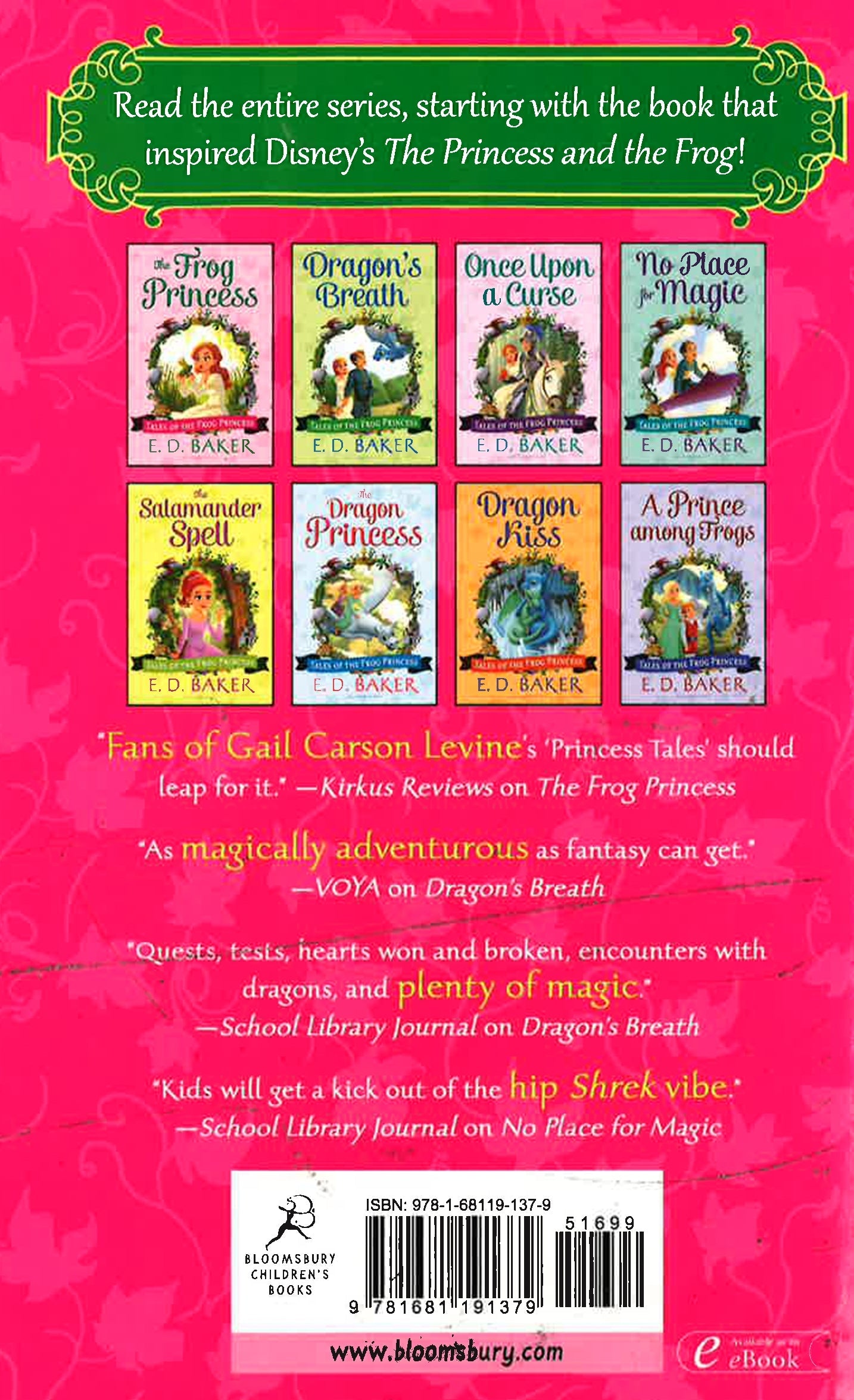 Two weeks after Emma's birthday, Prince Eadric, having been turned from a frog into a human again, is still in Greater Greensward. One day, a beautiful princess named Adara arrives at the castle in Greater Greensward for a visit, claiming to be Emma's distant cousin. But Adara has other motives that threaten Emma and Eadric's blossoming romance. Meanwhile, something is very wrong in Greater Greensward. Crops are dying, streams are drying up, and large sections of trees in the enchanted forest are withering, all because the Fairy Queen has disappeared. Without her, there is no peace in the magical kingdom, and dangerous foes threaten to take advantage of her absence. Only brave, tenacious Emma with her knowledge of the land can restore order, but first she must set out on a journey unlike any before. Brimming with lovable characters and page-turning magic, The Frog Princess Returns will bring a whole new batch of readers to E. D. Baker's highly acclaimed, wonderfully popular world of Frog Princess series.