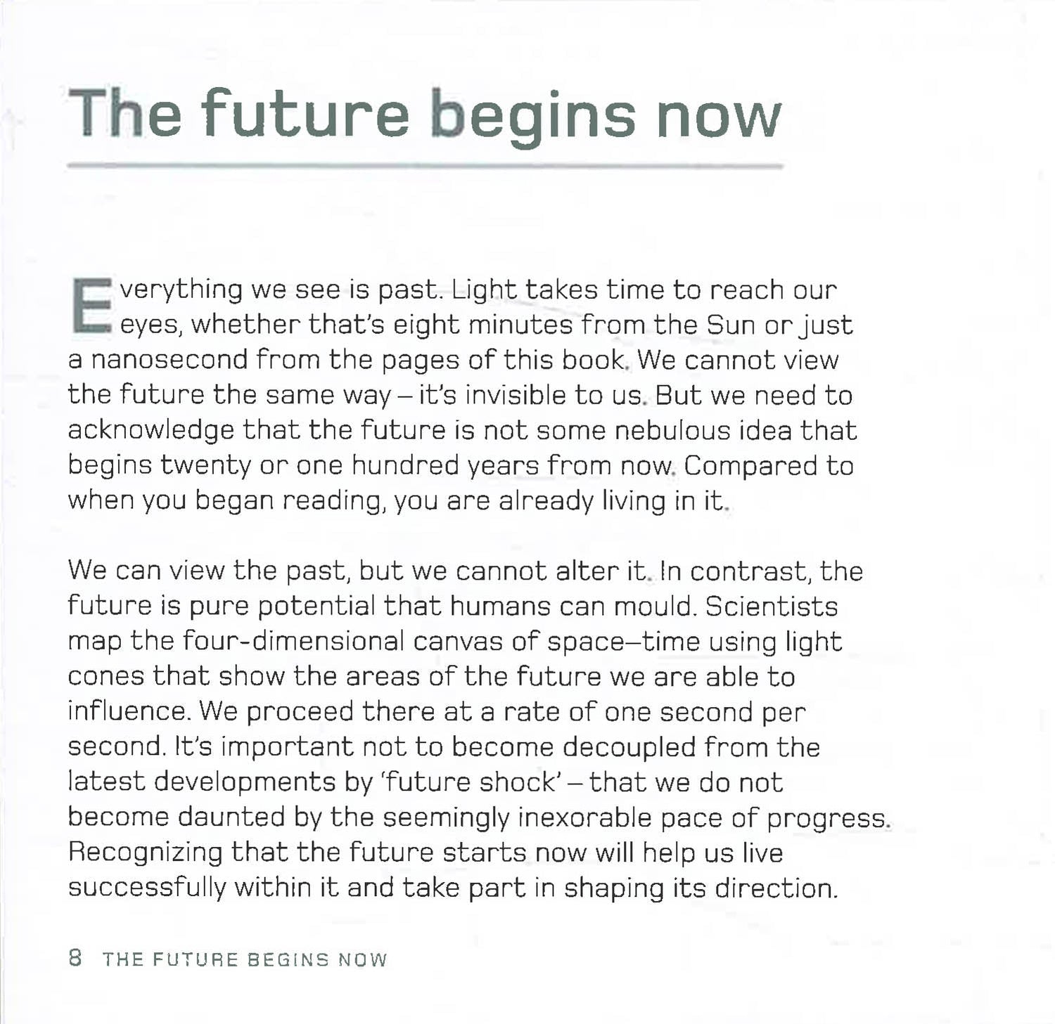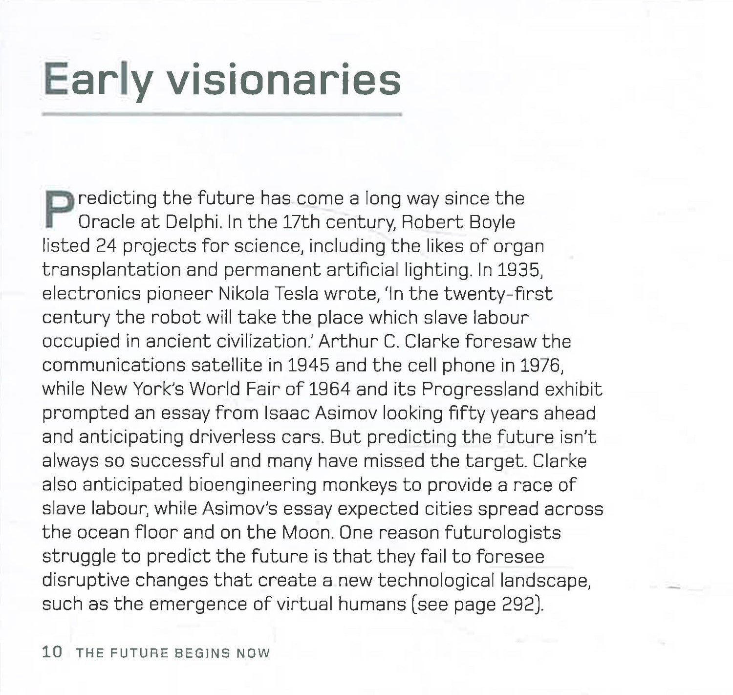 Contents include: Predicting the future; How we'll live; Shifts in society; Technology of the future; Scarcity and solutions; Politics, warfare and ethics; The quest for immortality; Transhumans and posthumans; Artificial intelligence; Threats to humanity; Space travel and colonization; Super-advanced science; and The Fate of the Earth and the Universe.