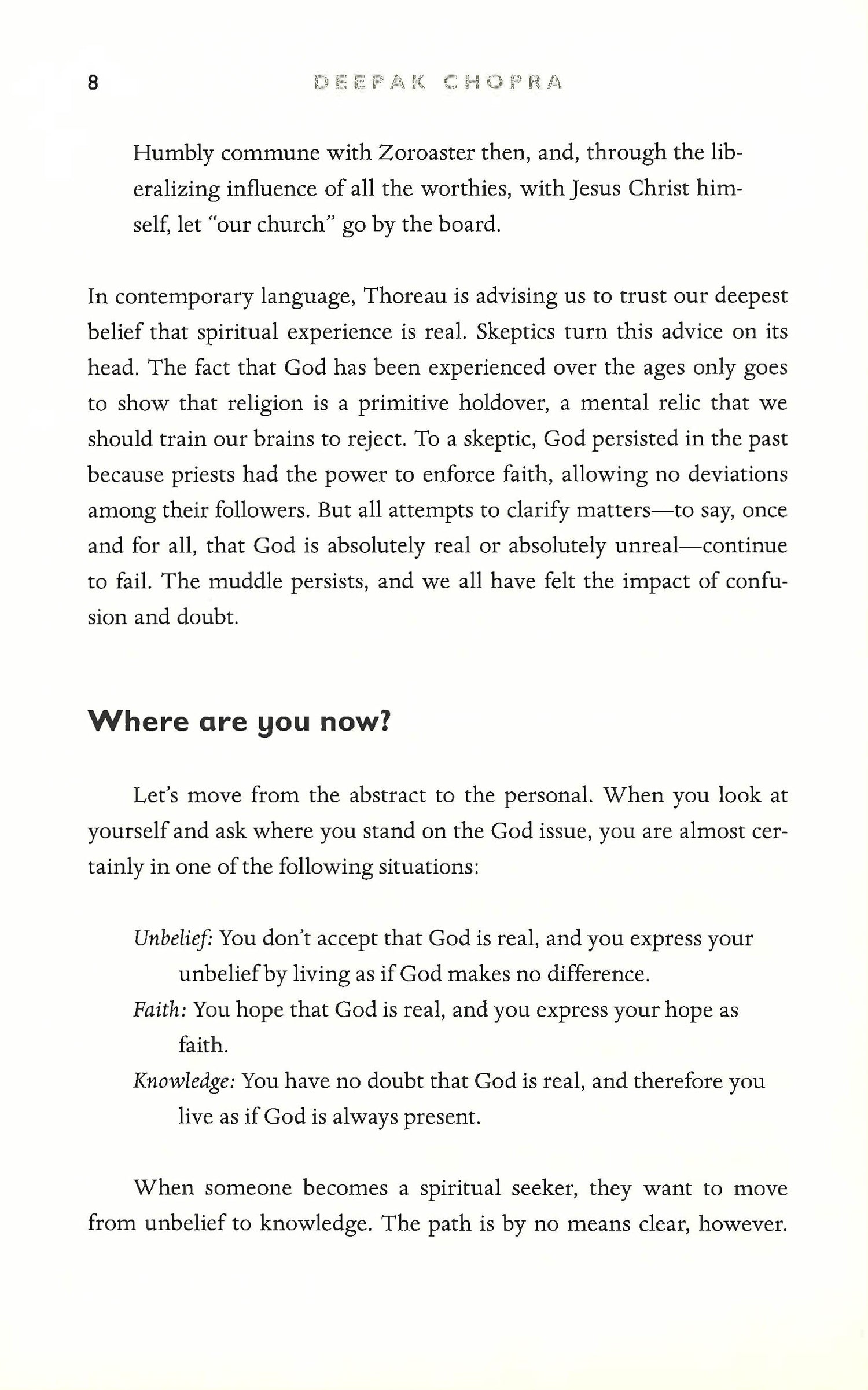 From the New York Times Bestselling Author. Can God be revived in a skeptical age? What would it take to give people a spiritual life more powerful than anything in the past? Deepak Chopra tackles these issues with eloquence and insight in this book. He proposes that God lies at the source of human awareness. Therefore, any person can find the God within that transforms everyday life. God is in trouble. The rise of the militant atheist movement spearheaded by Richard Dawkins signifies, to many, that the deity is an outmoded myth in the modern world. Deepak Chopra passionately disagrees, seeing the present moment as the perfect time for making spirituality what it really should be: reliable knowledge about higher reality. Outlining a path to God that turns unbelief into the first step of awakening, Deepak shows us that a crisis of faith is like the fire we must pass through on the way to power, truth, and love. "Faith must be saved for everyone's sake," he writes. "From faith springs a passion for the eternal, which is even stronger than love. Many of us have lost that passion or have never known it." In any age, faith is a cry from the heart. God is the higher consciousness that responds to the cry. "By itself, faith can't deliver God, but it does something more timely: It makes God possible." For three decades, Deepak Chopra has inspired millions with his profound writing and teaching. With The Future of God, he invites us on a journey of the spirit, providing a practical path to understanding God and our own place in the universe. Now, is a moment of reinvigoration, he argues. Now is moment of renewal.