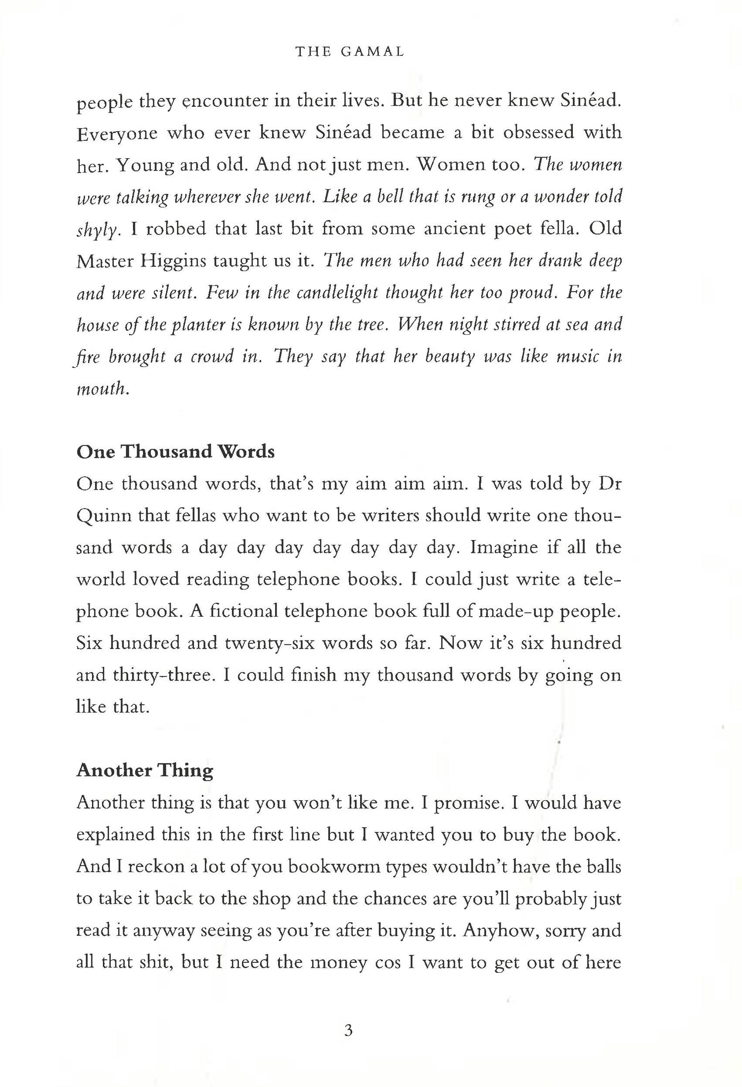 Meet Charlie. People think he's crazy. But he's not. People think he's stupid. But he's not. People think he's innocent... He's the Gamal. Charlie has a story to tell, about his best friends Sinead and James and the bad things that happened. But he can't tell it yet, at least not till he's worked out where the beginning is. Because is the beginning long ago when Sinead first spoke up for him after Charlie got in trouble at school for the millionth time? Or was it later, when Sinead and James followed the music and found each other? Or was it later still on that terrible night when something unspeakable happened after closing time and someone chose to turn a blind eye? Charlie has promised Dr Quinn he'll write 1,000 words a day, but it's hard to know which words to write. And which secrets to tell... This is the story of the dark heart of an Irish village, of how daring to be different can be dangerous and how there is nothing a person will not do for love. Exhilarating, bitingly funny and unforgettably poignant, this is a story like no other. This is the story of the Gamal.