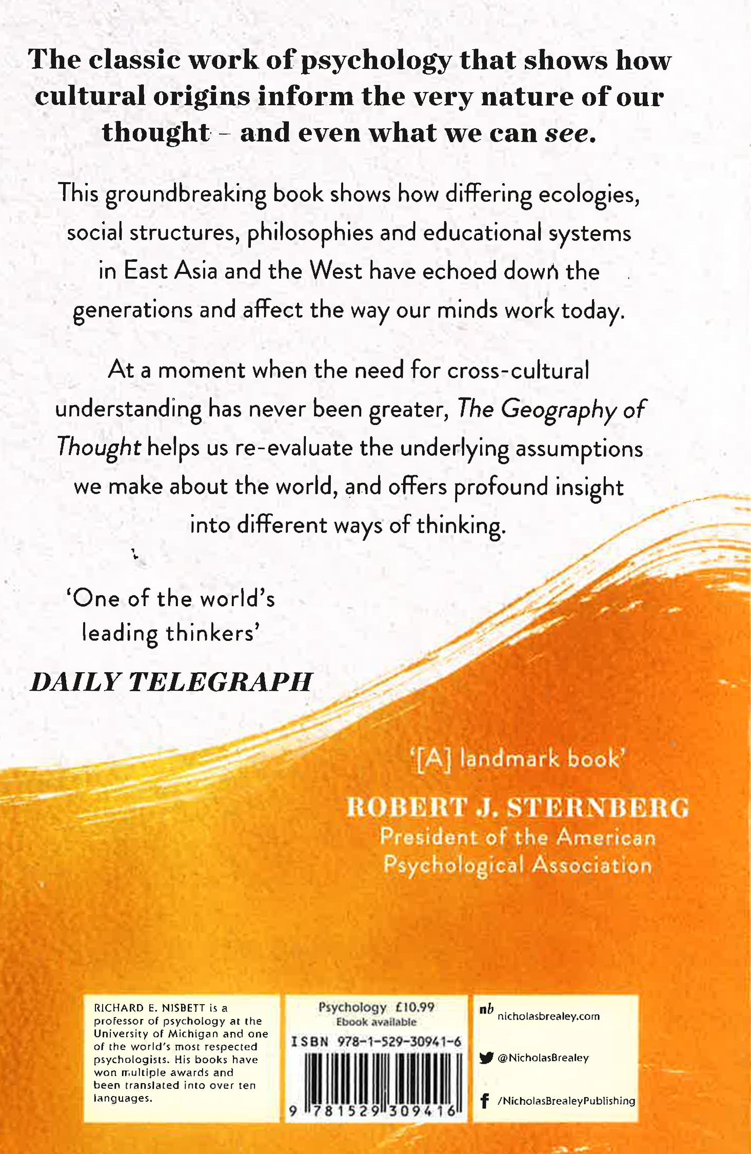 As Professor Nisbett shows in The Geography of Thought people actually think - and even see - the world differently, because of differing ecologies, social structures, philosophies, and educational systems that date back to ancient Greece and China, and that have survived into the modern world. As a result, East Asian thought is "holistic" - drawn to the perceptual field as a whole, and to relations among objects and events within that field.