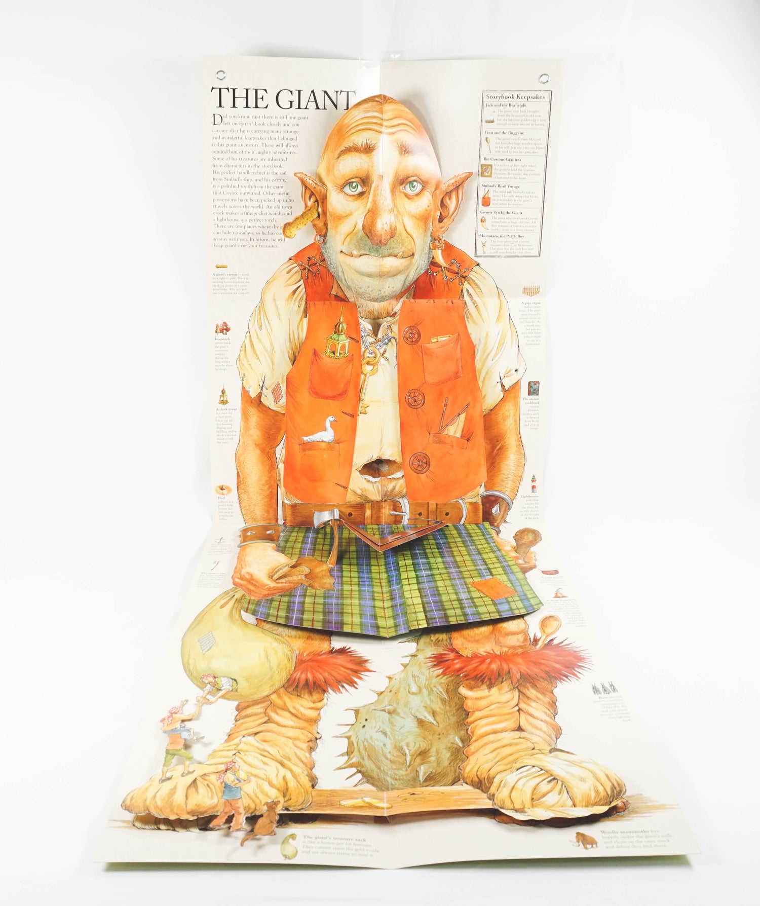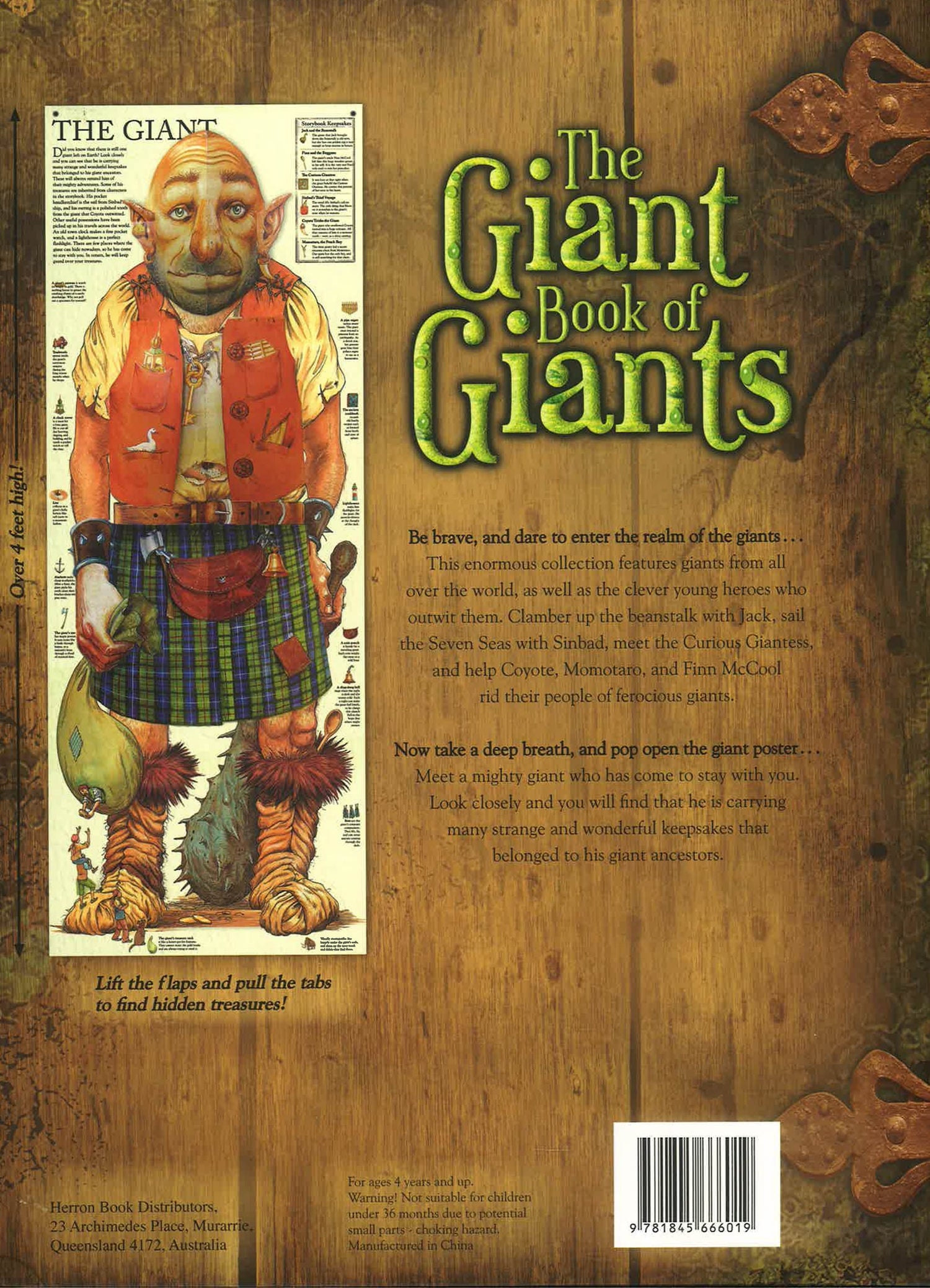 Be brave, and dare to enter the realm of the giants.. This enormous collection features giant from all over the world, as well as the clever young heroes who outwit them. Clamber up the beanstalk with Jack, sail the Seven Seas with Sinbad, meet the Curious Giantess, and help Coyote, Momotaro, and Finn McCool rid their people of ferocious giants. Now take a adeep breath, and open the giant poster.. Meet a mighty giant who has come to stay with you. Look closely and you will find that he is carrying many strange and wonderful keepsakes that belongs to his giant ancestors