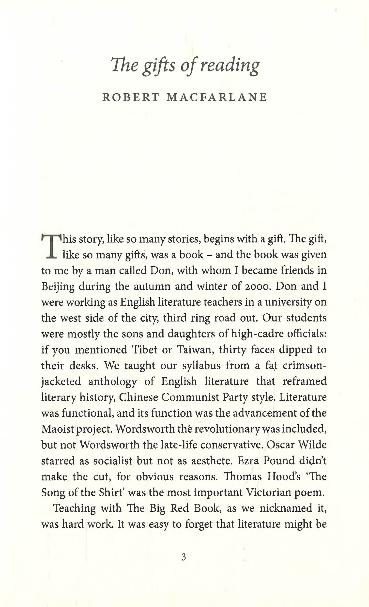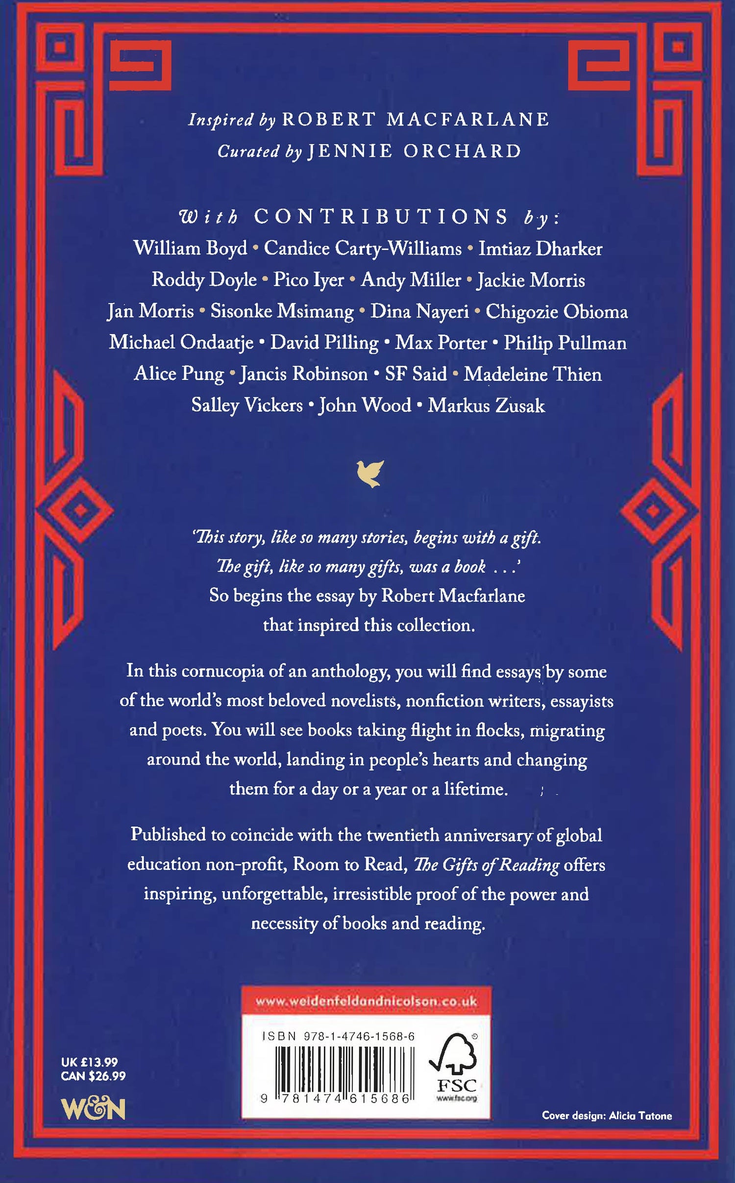 With contributions by: William Boyd, Candice Carty-Williams, Imtiaz Dharker, Roddy Doyle, Pico Iyer, Robert Macfarlane, Andy Miller, Jackie Morris, Jan Morris, Sisonke Msimang, Dina Nayeri, Chigozie Obioma, Michael Ondaatje, David Pilling, Max Porter, Philip Pullman, Alice Pung, Jancis Robinson, S.F.Said, Madeleine Thien, Salley Vickers, John Wood and Markus Zusak 'This story, like so many stories, begins with a gift. The gift, like so many gifts, was a book...' So begins the essay by Robert Macfarlane that inspired this collection. In this cornucopia of an anthology, you will find essays by some of the world's most beloved novelists, nonfiction writers, essayists and poets. 'You will see books taking flight in flocks, migrating around the world, landing in people's hearts and changing them for a day or a year or a lifetime. 'You will see books sparking wonder or anger; throwing open windows into other languages, other cultures, other minds; causing people to fall in love or to fight for what is right. 'And more than anything, over and over again, you will see books and words being given, received and read - and in turn prompting further generosity.' Published to coincide with the 20th anniversary of global literacy non-profit, Room to Read, The Gifts of Reading forms inspiring, unforgettable, irresistible proof of the power and necessity of books and reading. Inspired by Robert Macfarlane Curated by Jennie Orchard