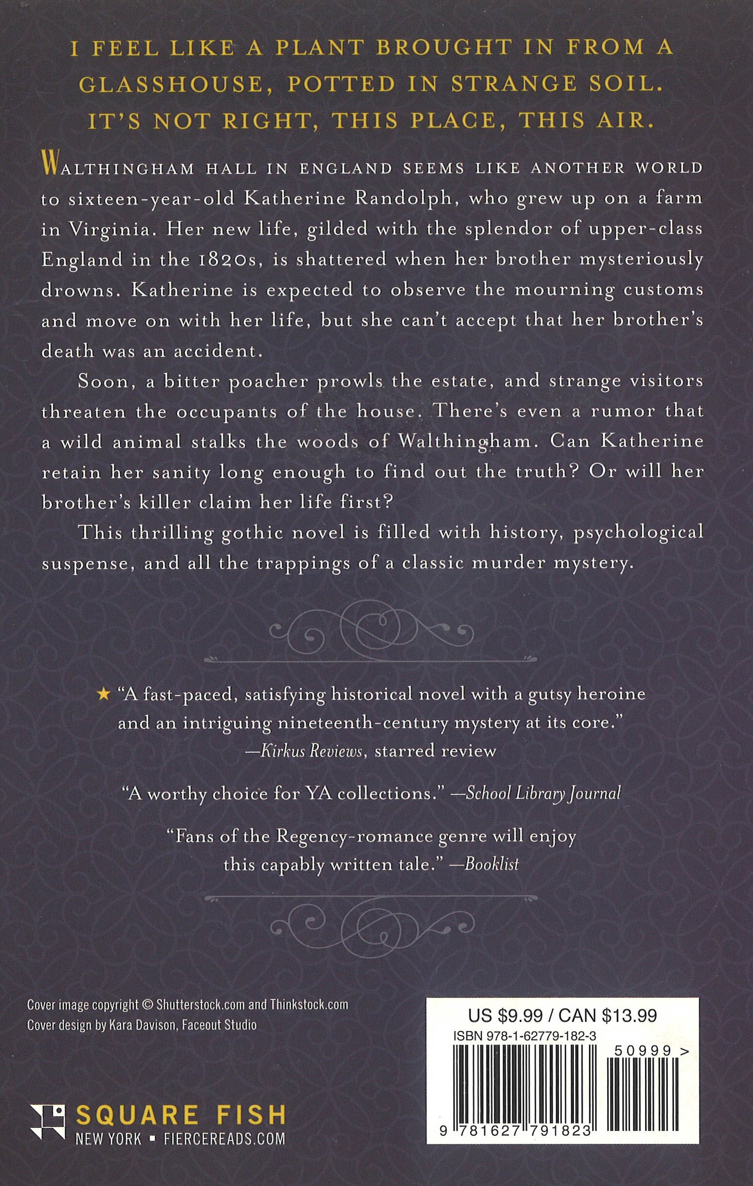 After growing up on a farm in Virginia, Walthingham Hall in England seems like another world to sixteen-year-old Katherine Randolph. Her new life, filled with the splendor of upper class England in the 1820s, is shattered when she discovers the corpse of her brother George in a lake on the estate - the tragic accidental drowning of a young man, the coroner reports, despite the wound to George's head.Katherine is expected to observe the mourning customs and get on with her life, but she can't accept that her brother's death was an accident. A bitter poacher prowls the estate, and strange visitors threaten the occupants of the house. There's a rumor, too, that a wild animal stalks the woods of Walthingham.Can Katherine retain her sanity long enough to find out the truth? Or will her brother's killer claim her life, too?