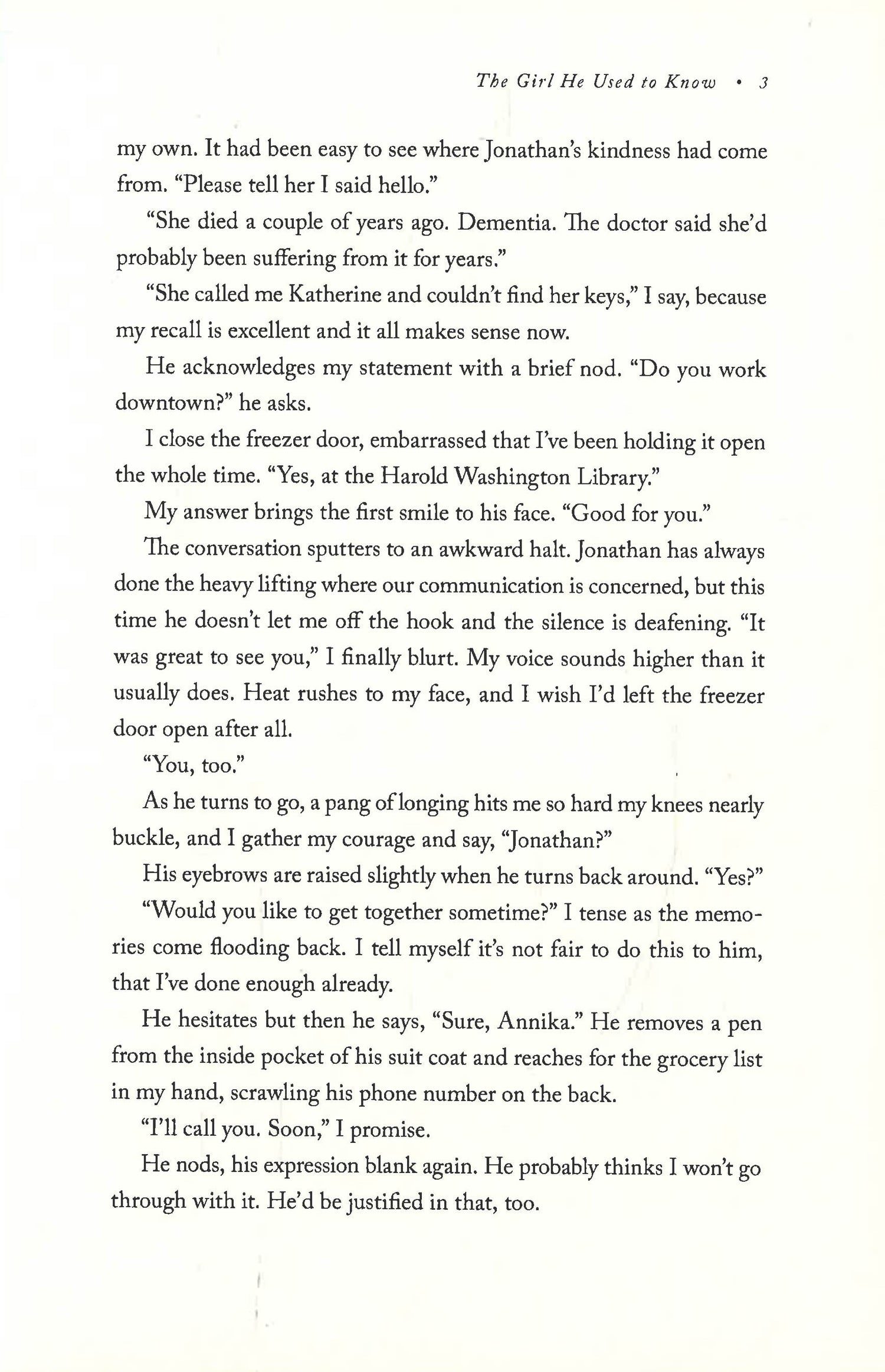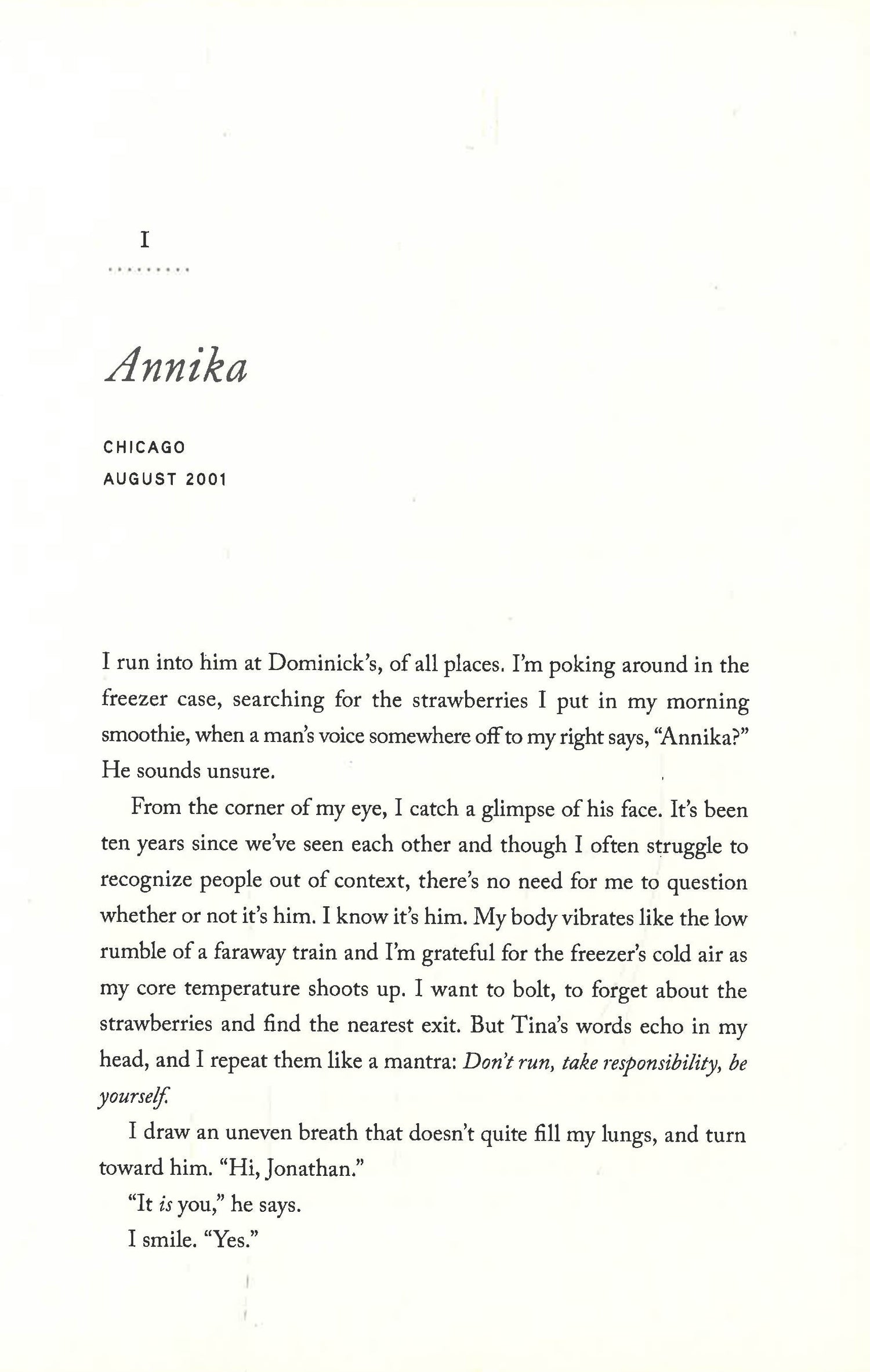 Now, a decade later, fate reunites Annika and Jonathan in Chicago. She's living the life she wanted as a librarian. He's a Wall Street whiz, recovering from a divorce and seeking a fresh start. The attraction and strong feelings they once shared are instantly rekindled, but until they confront the fears and anxieties that drove them apart, their second chance will end before it truly begins.