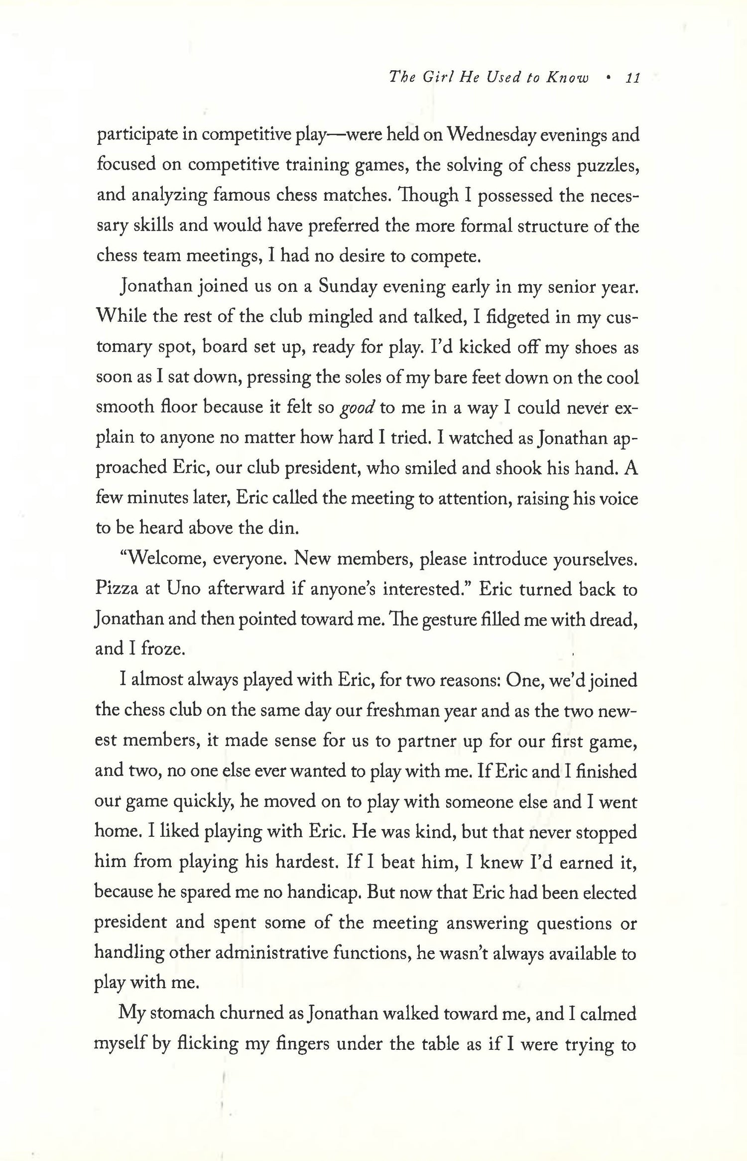 Jonathan Hoffman joined the chess club and lost his first game—and his heart—to the shy and awkward, yet brilliant and beautiful Annika. He admires her ability to be true to herself, quirks and all, and accepts the challenges involved in pursuing a relationship with her. Jonathan and Annika bring out the best in each other, finding the confidence and courage within themselves to plan a future together. What follows is a tumultuous yet tender love affair that withstands everything except the unforeseen tragedy that forces them apart, shattering their connection and leaving them to navigate their lives alone.