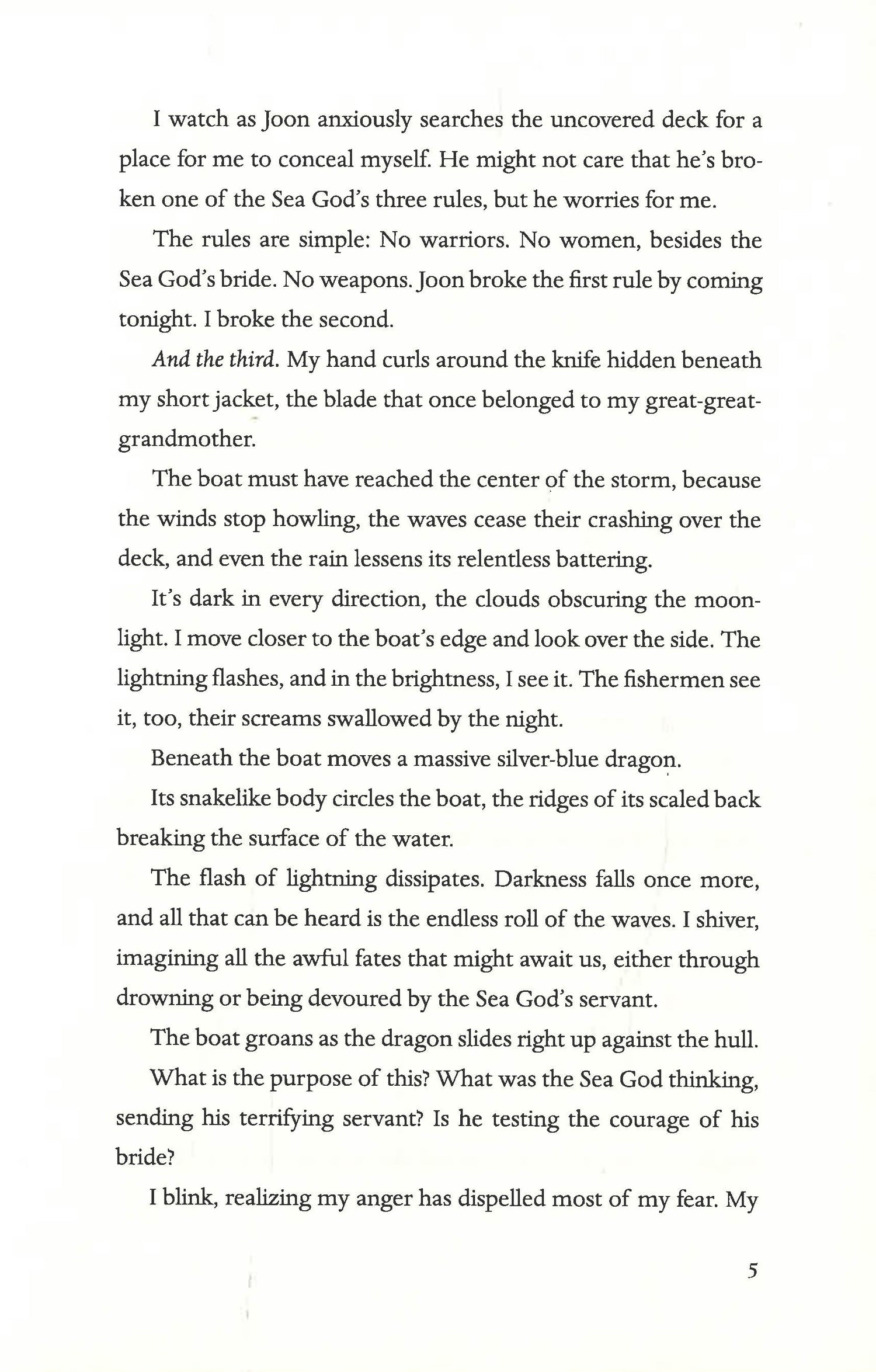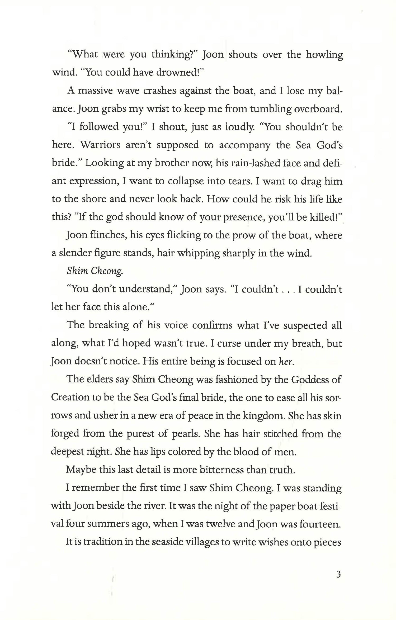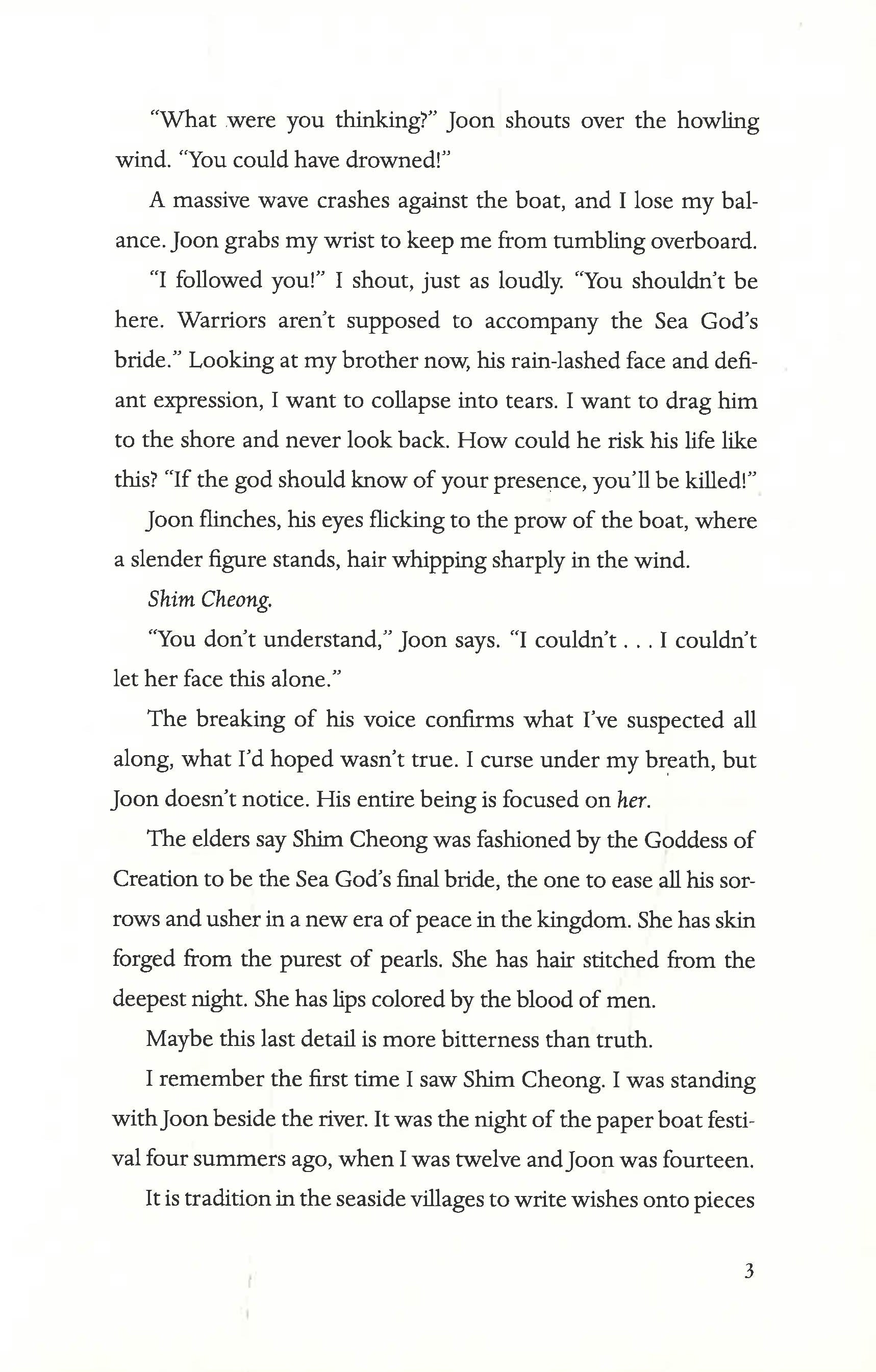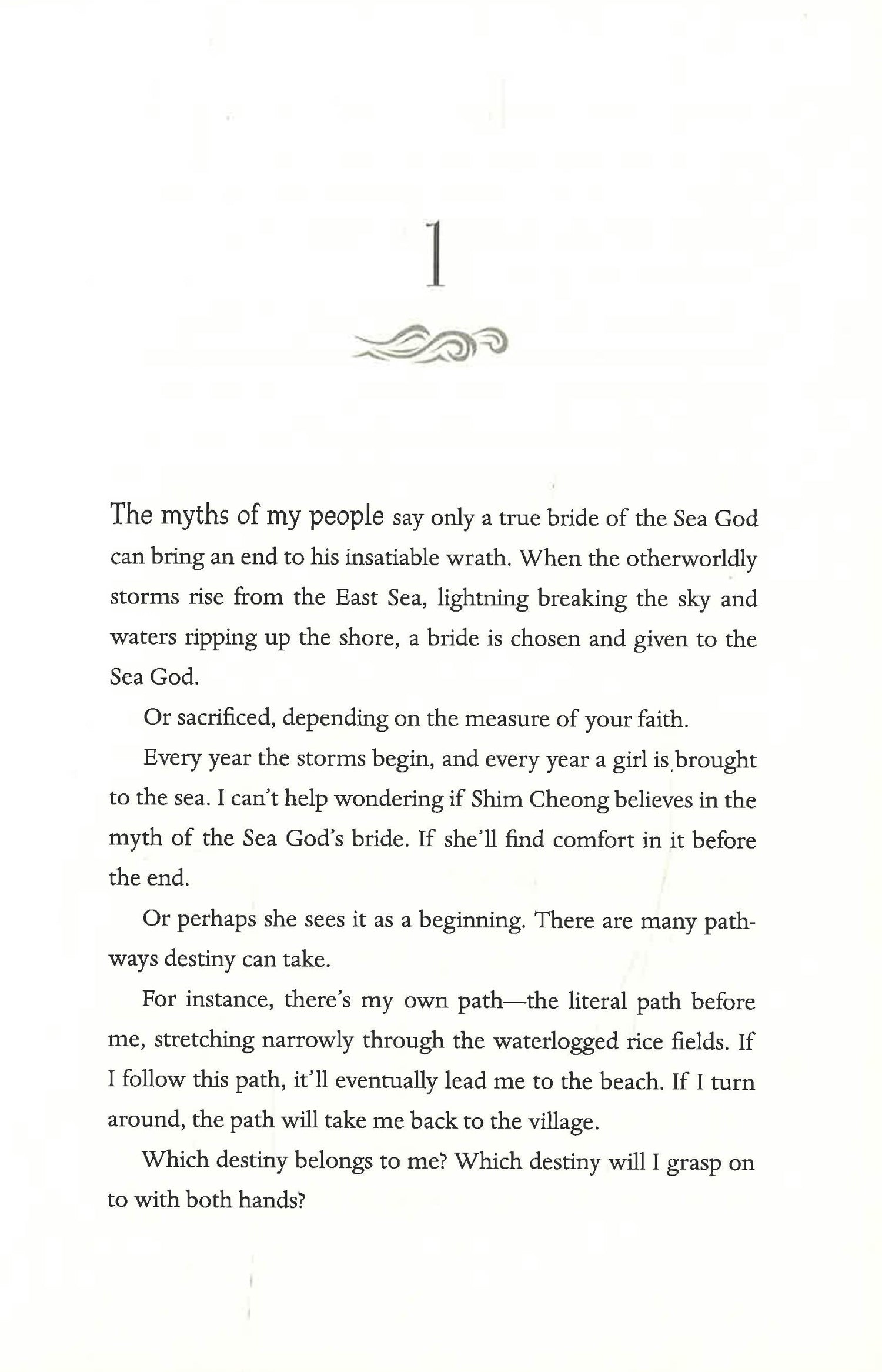 Many believe that Shim Cheong, the most beautiful girl in the village--and the beloved of Mina's older brother Joon--may be the legendary true bride. But on the night Cheong is to be sacrificed, Joon follows Cheong out to sea, even knowing that to interfere is a death sentence. To save her brother, Mina throws herself into the water in Cheong's stead.