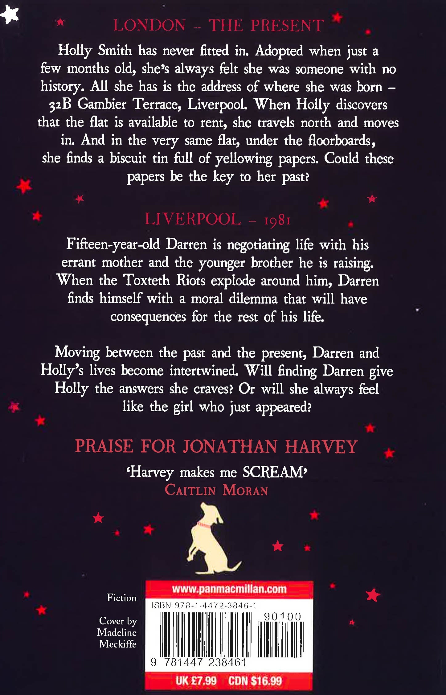London - The Present Holly Smith has never fitted in. Adopted when just a few months old, she's always felt she was someone with no history, the girl who just appeared. All she has is the address of where she was born - 32B Gambier Terrace, Liverpool. By a bizarre twist of fate Holly discovers that the flat is available to rent. She travels north and moves in. When she finds a biscuit tin full of yellowing papers under the floorboards, she wonders if this might hold the secret to her past. Liverpool 1981. Fifteen-year-old Darren negotiates life with his errant mother and the younger brother he is bringing up. When the Toxteth Riots explode around him Darren finds himself with a moral dilemma that will have consequences for the rest of his life. Flitting between the present and the past, we discover how Darren and Holly's lives become intertwined. Will Holly uncover the secrets of her past? Or will she always feel like the girl who just appeared?