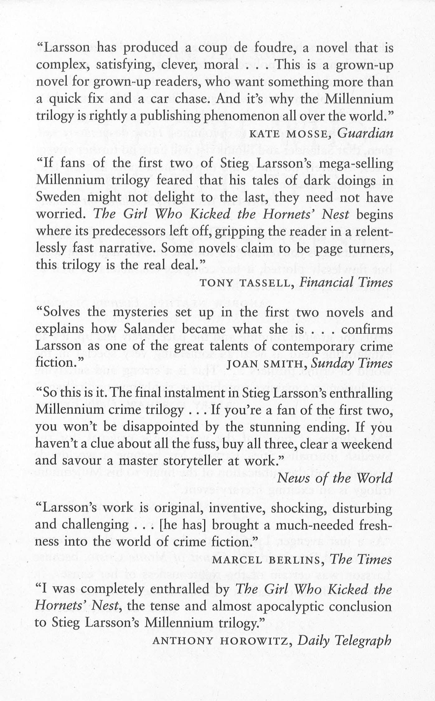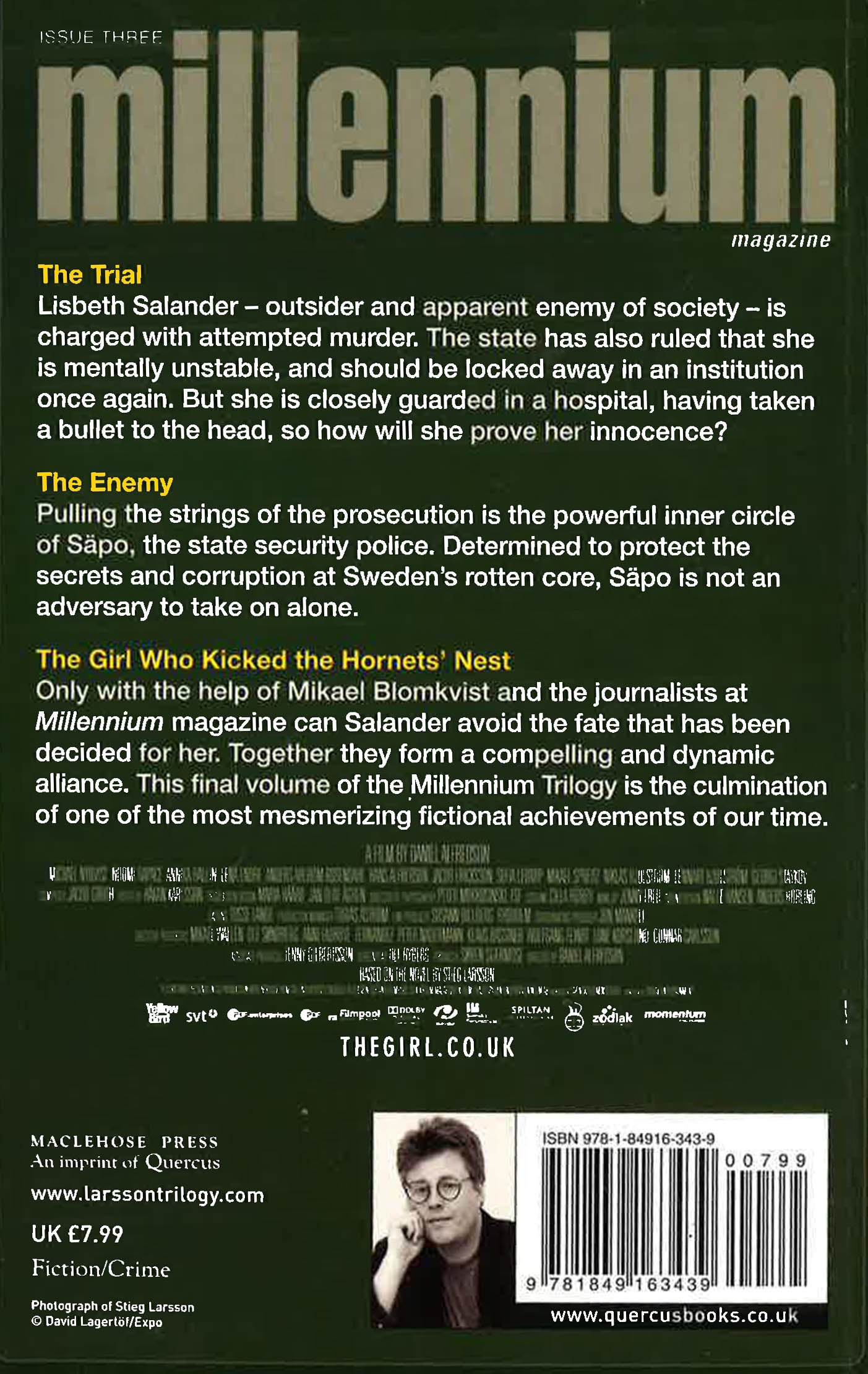 Salander is plotting her revenge - against the man who tried to kill her, and against the government institutions that very nearly destroyed her life. But it is not going to be a straightforward campaign. After taking a bullet to the head, Salander is under close supervision in Intensive Care, and is set to face trial for three murders and one attempted murder on her eventual release. With the help of journalist Mikael Blomkvist and his researchers at Millennium magazine, Salander must not only prove her innocence, but identify and denounce the corrupt politicians that have allowed the vulnerable to become victims of abuse and violence. Once a victim herself, Salander is now ready to fight back.