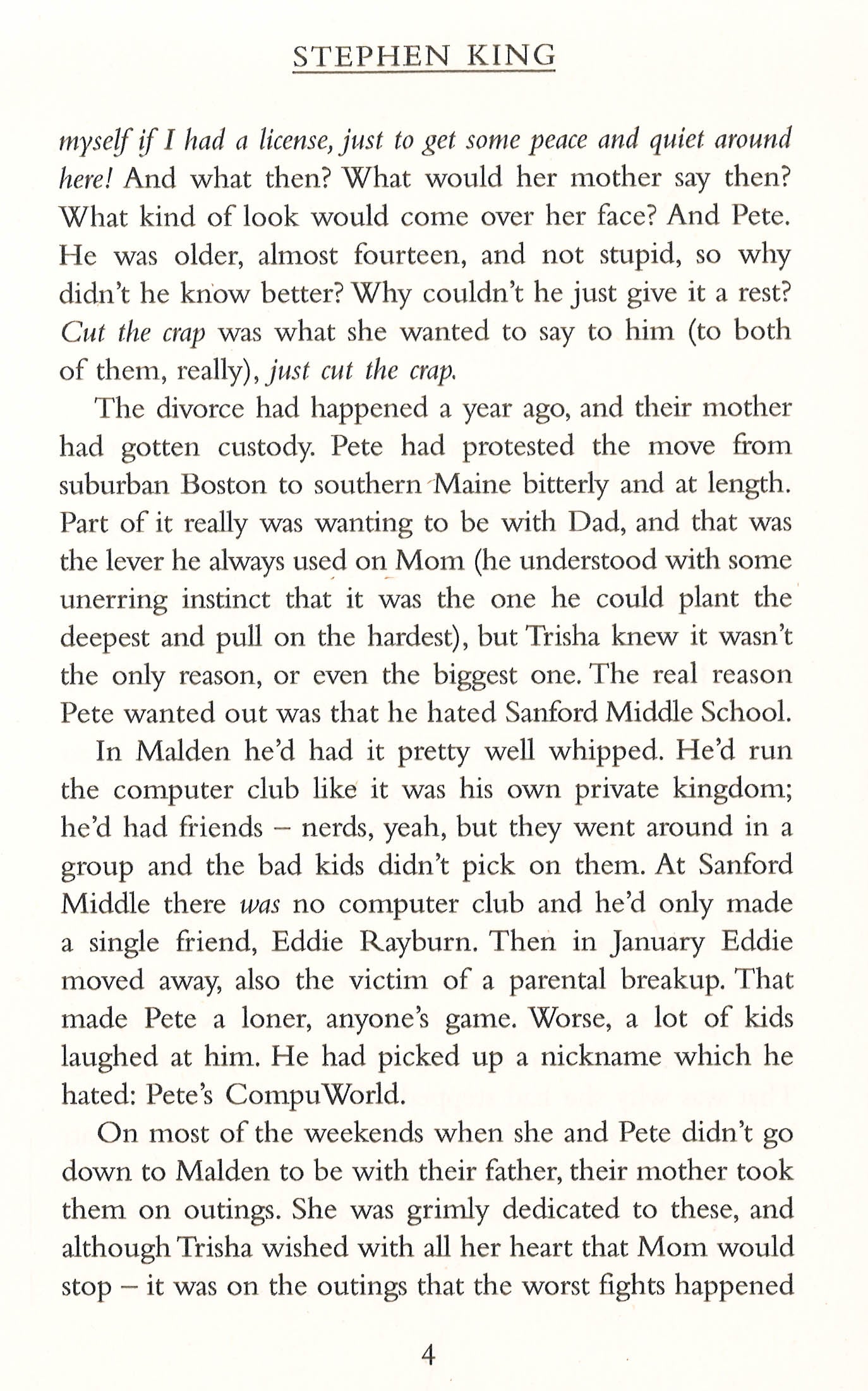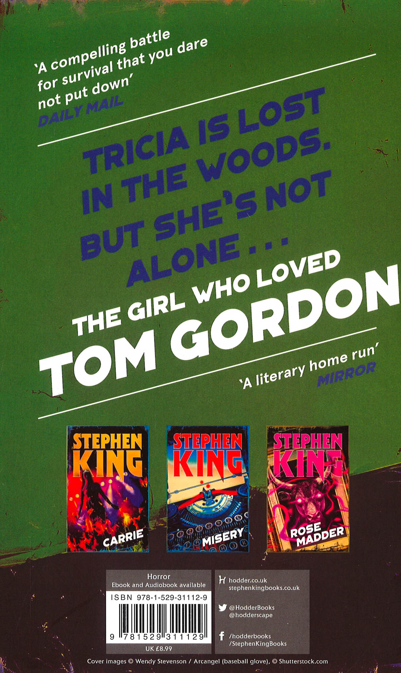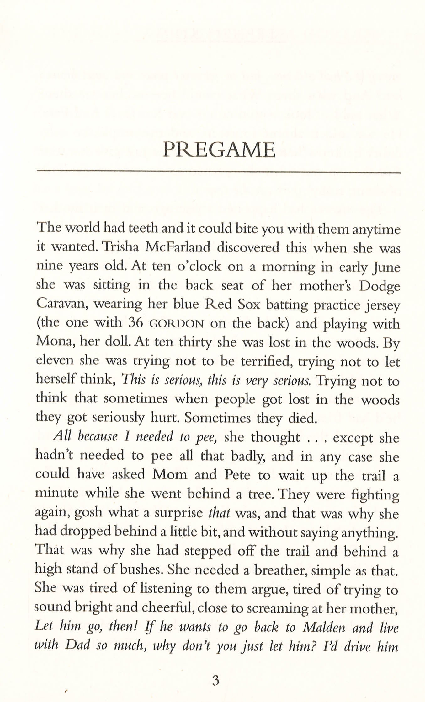 Tricia is lost in the woods. But she's not alone . . .'The world has teeth and it could bite you with them anytime it wanted. Trisha McFarland discovered this when she was nine years old. Lost in the woods.'Trisha has only veered a little way off the trail. But in her panic to get back to the path, Trisha takes a turning that leads into the tangled undergrowth. Deeper and deeper in the terrifying woods. At first it's just the bugs, midges and mosquitoes. Then comes the hunger. For comfort she tunes her Walkman into broadcasts of the Red Sox baseball games and the performances of her hero Tom Gordon. As darkness begins to fall, Trisha realises that she is not alone. There's something else in the woods - watching. Waiting . . .