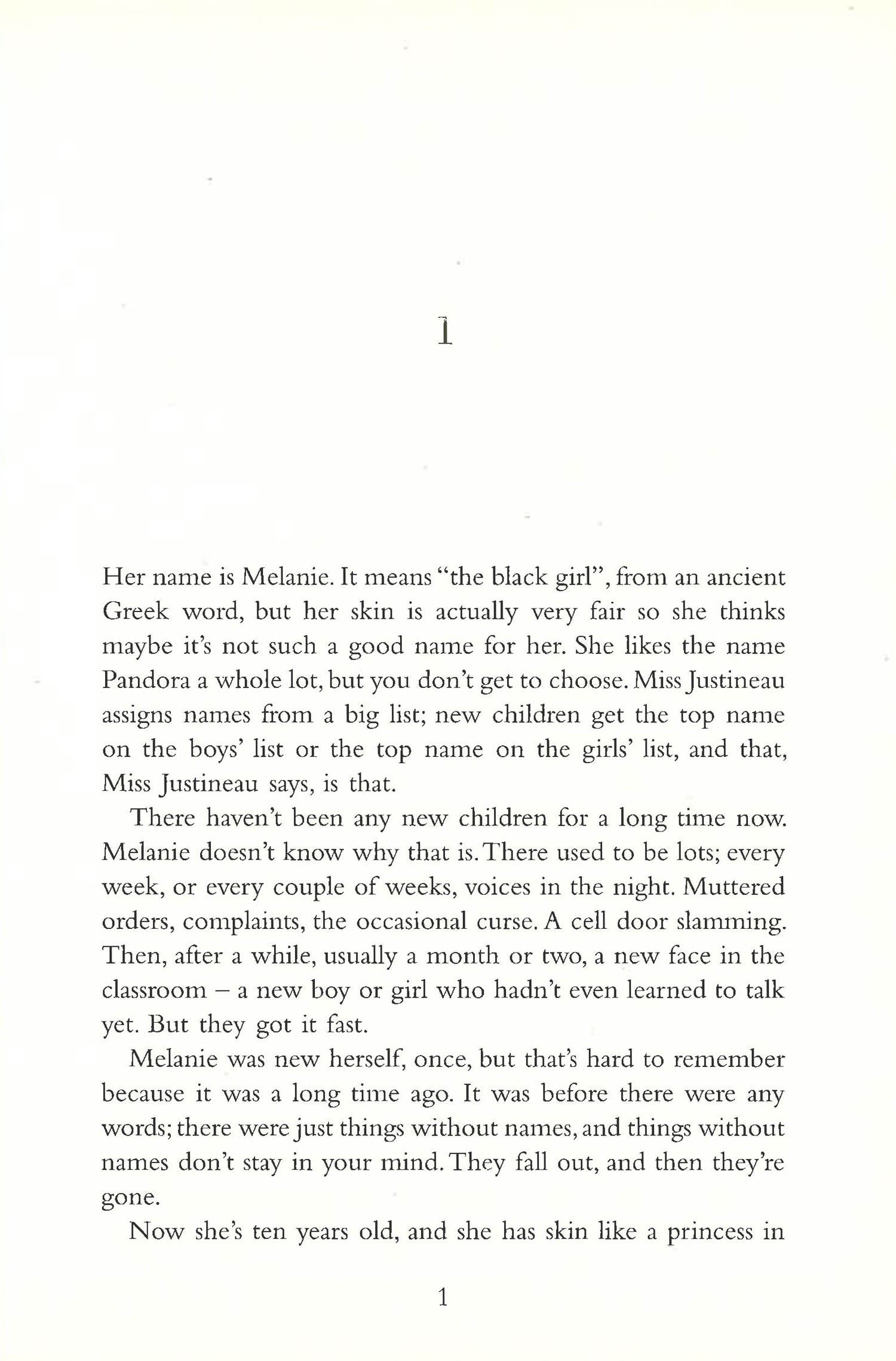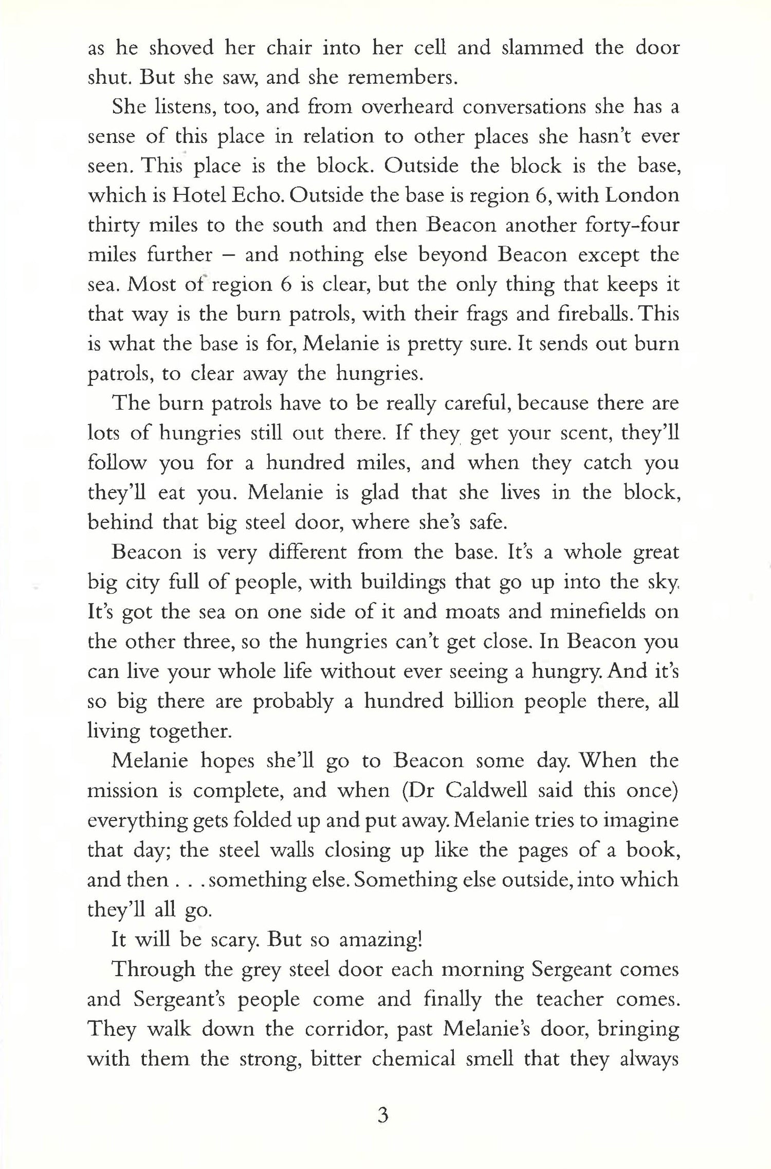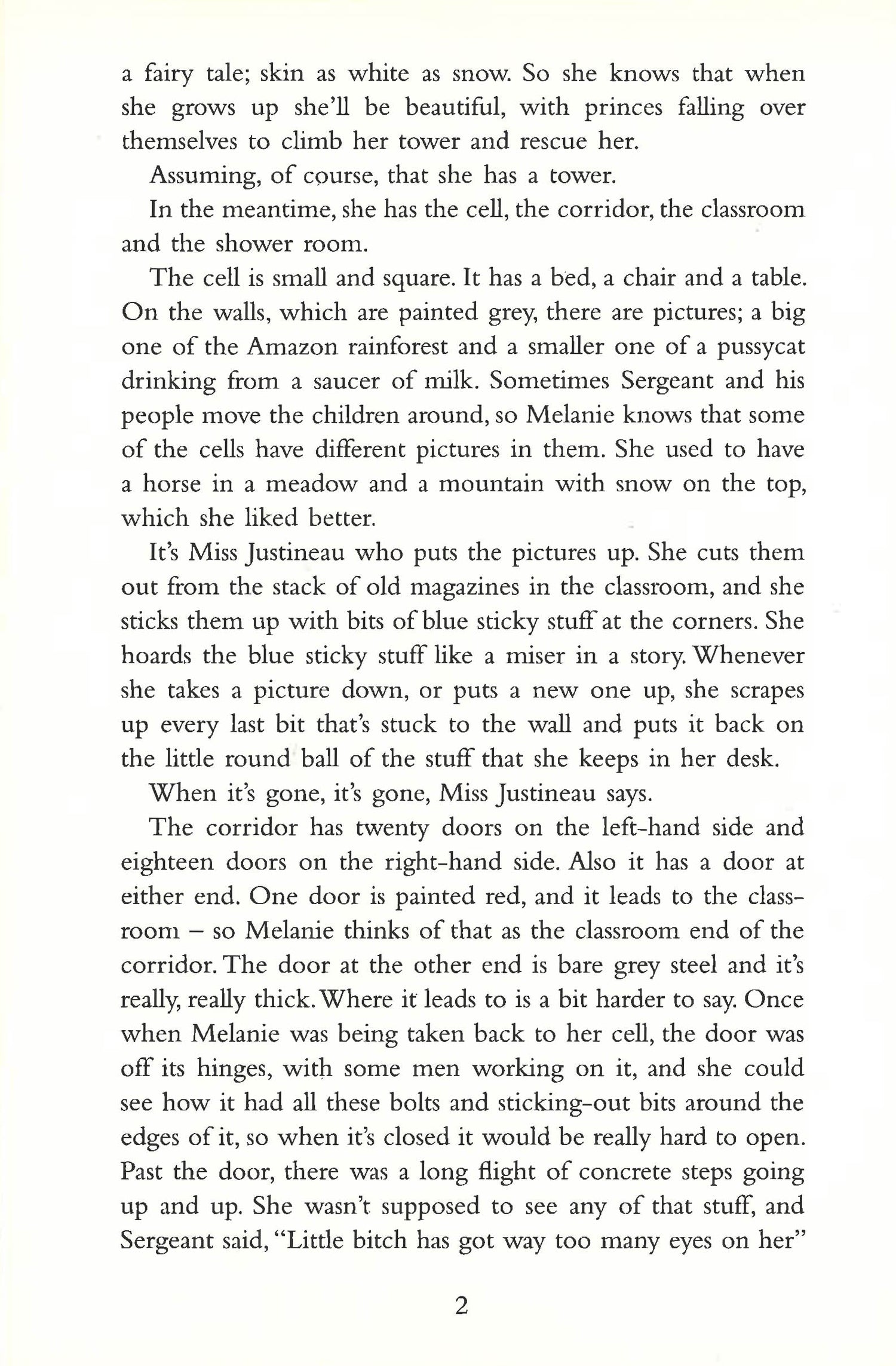 Every morning, Melanie waits in her cell to be collected for class. When they come for her, Sergeant keeps his gun pointed at her while two of his people strap her into the wheelchair. She thinks they don't like her. She jokes that she won't bite, but they don't laugh.