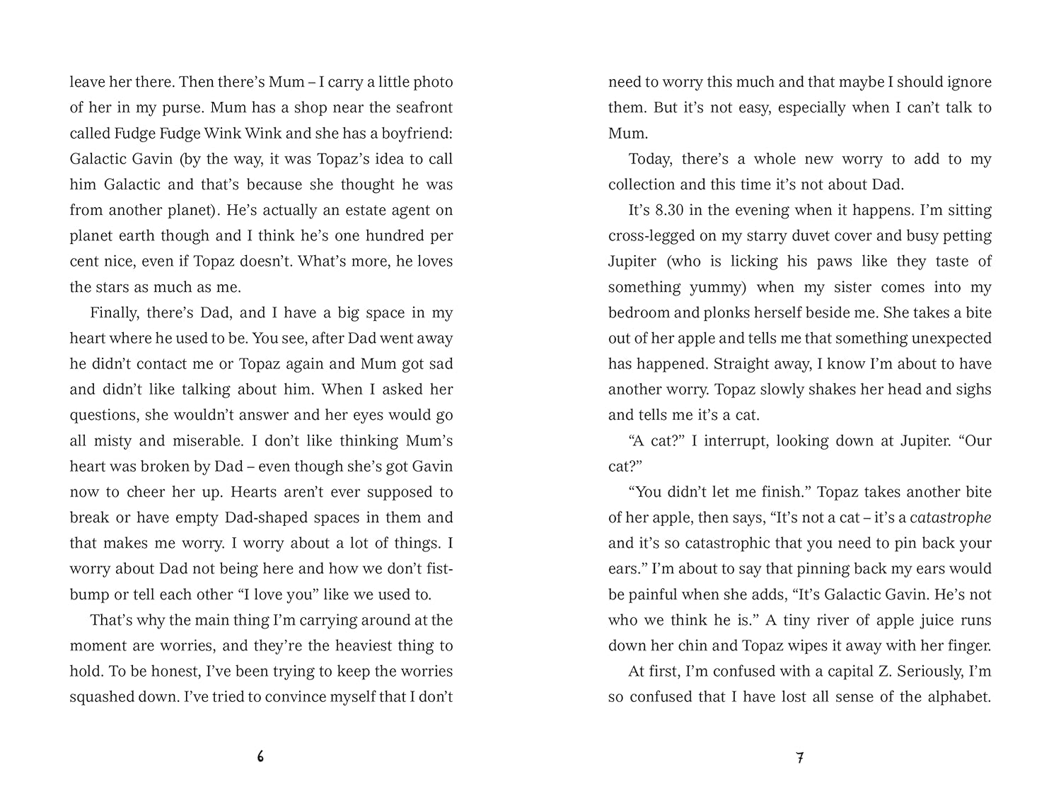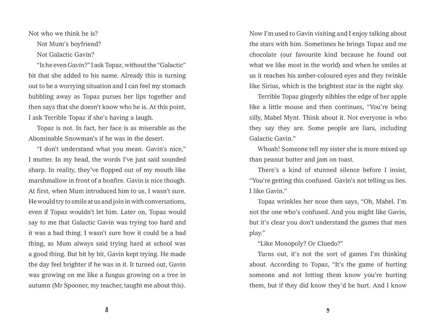 Mabel Mynt knows a lot about space...like how we feel connected to the stars because we are all made of stardust. And that Mum's new boyfriend, Galactic Gavin, has eyes that twinkle like Sirius, the brightest star in the night sky. And that sometimes the perfect place for her sister Terrible Topaz would be a black hole. But Mabel doesn't know how to fill the space in her heart that Dad left when he walked out. And so she sets out on a mission of discovery... A heart-warming and hilarious story about learning that love is never lost and change doesn't have to be scary.
