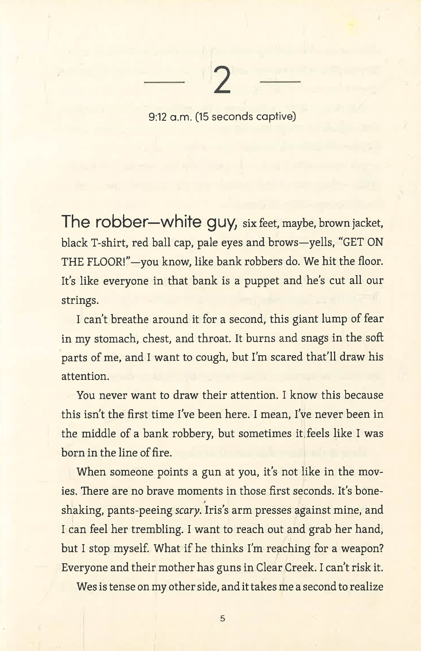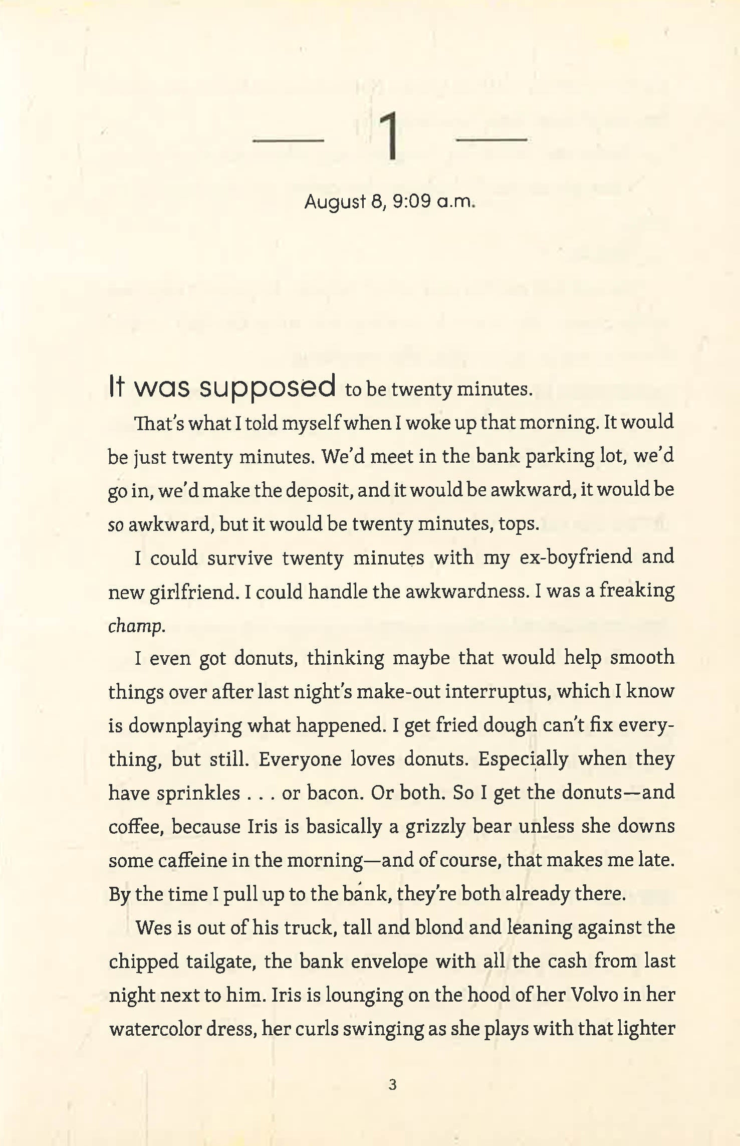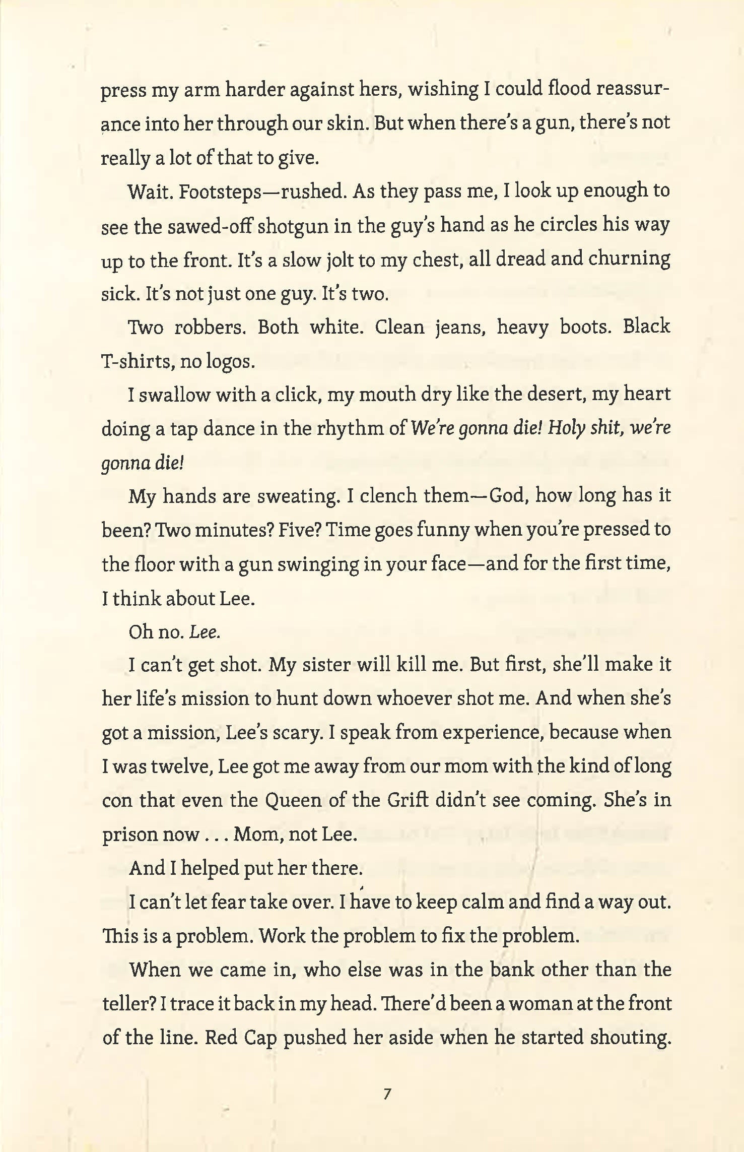 For five years Nora's been playing at normal - but things are far from it when she finds herself held at gunpoint in the middle of a bank heist, along with Wes (her ex-boyfriend) and Iris (her secret new girlfriend and mutual friend of Wes ... awkward). Now it will take all of Nora's con artistry skills to get them out alive.