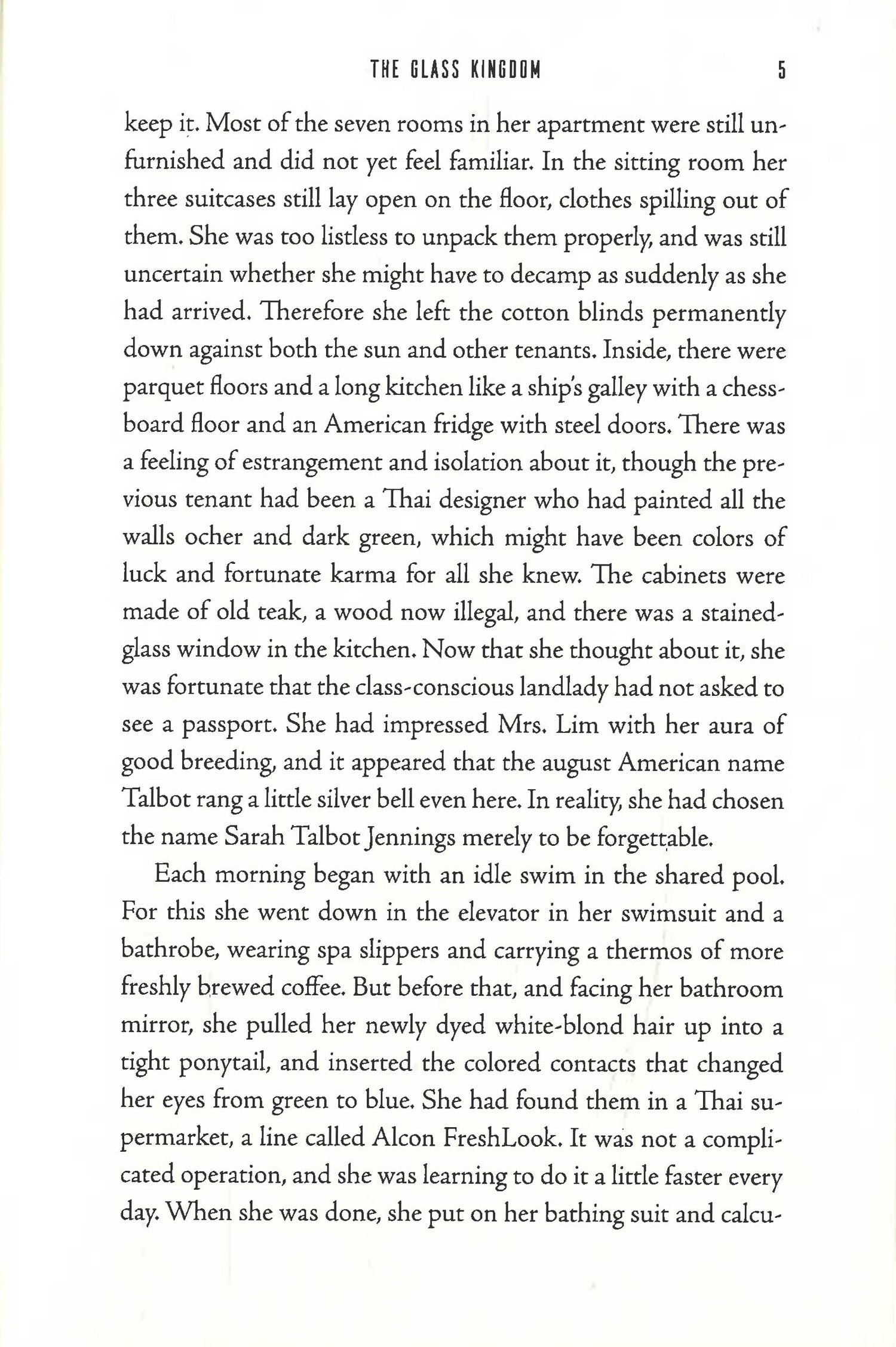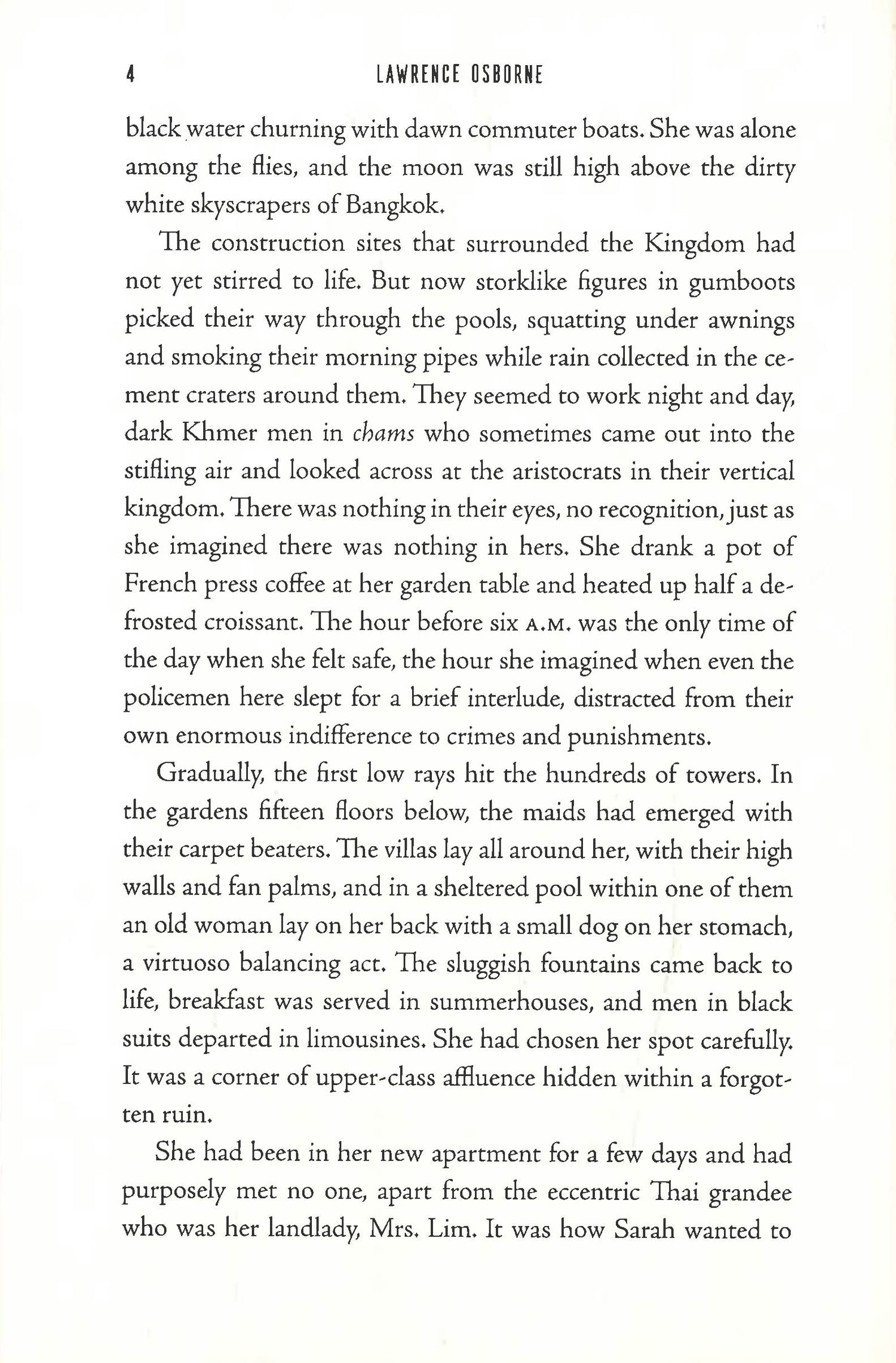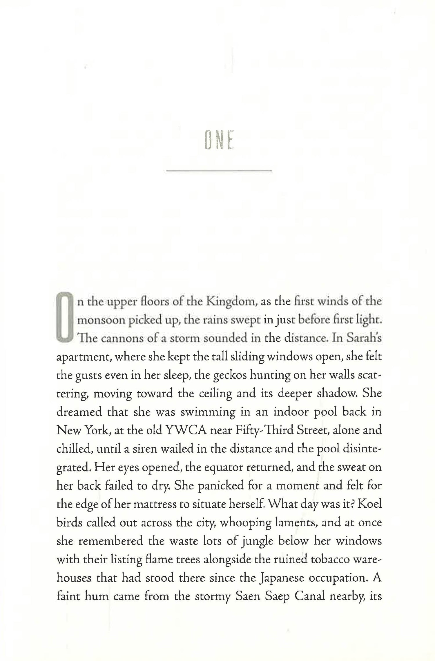 Escaping New York for the anonymity of Bangkok, Sarah Mullins arrives in Thailand on the lam with nothing more than a suitcase of purloined money. Her plan is to lie low and map out her next move in a high-end apartment complex called the Kingdom, whose glass-fronted façade boasts views of the bustling city and glimpses into the vast honeycomb of lives within.