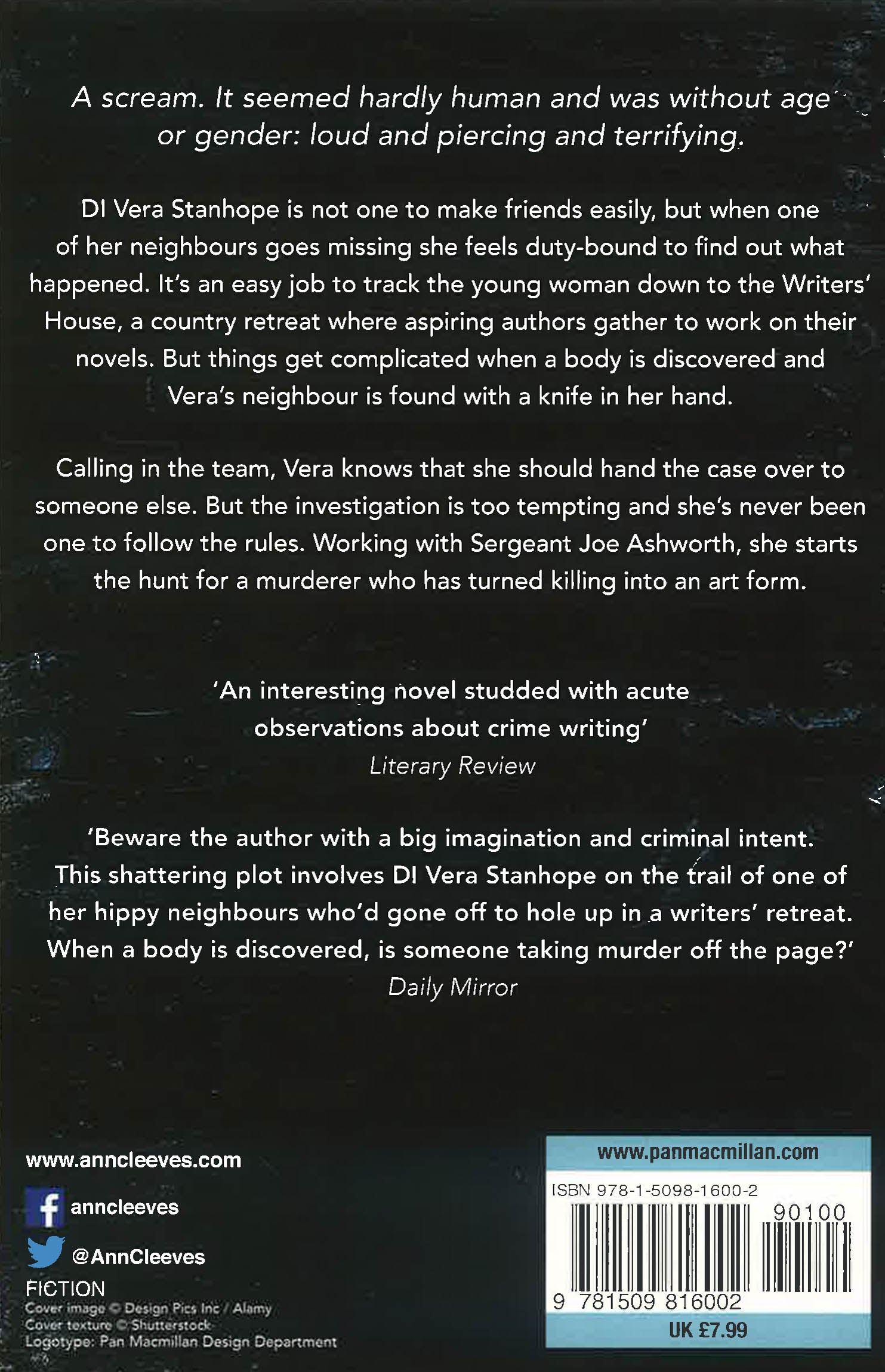 *Winner of the 2017 Crime Writers' Association Diamond Dagger* *Vera Stanhope will return in The Seagull* The Glass Room is the fifth book in Ann Cleeves’ Vera Stanhope series – which is now a major ITV detective drama starring Brenda Blethyn, VERA. DI Vera Stanhope is not one to make friends easily, but her hippy neighbours keep her well-supplied in homebrew and conversation. But when one of them goes missing, her path leads her to more than a missing friend . . . Vera tracks the young woman down to the Writer’s House, a country retreat where aspiring authors work on their stories. Things get complicated when a body is discovered and Vera’s neighbour is found with a knife in her hand. Calling in the team, Vera knows that she should hand the case over. She’s too close to the main suspect. But the investigation is too tempting and she’s never been one to follow the rules. There seems to be no motive. When another body is found, Vera suspects that someone is playing games with her. Somewhere there is a killer who has taken murder off the page and is making it real . . . Also available in the Vera Stanhope series are The Crow Trap, Telling Tales, Hidden Depths and Silent Voices. Ann Cleeves’ Shetland series (BBC television drama SHETLAND) contains five titles, of which Dead Water is the most recent.