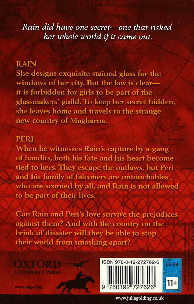 Rain designs exquisite stained glass for the windows of her city. But the law is clear-it is forbidden for girls to be part of the glassmakers' guild. To keep her secret hidden, she leaves home and travels to the strange new country of Magharna. When Peri witnesses Rain's capture by a gang of bandits, both his fate and his heart become tied to hers. They escape the outlaws, but Peri and his family of falconers are untouchables who are scorned by all, and Rain is not allowed to be part of their lives. Can Rain and Peri's love survive the prejudices against them? And with the country on the brink of disaster will they be able to stop their world from smashing apart?
