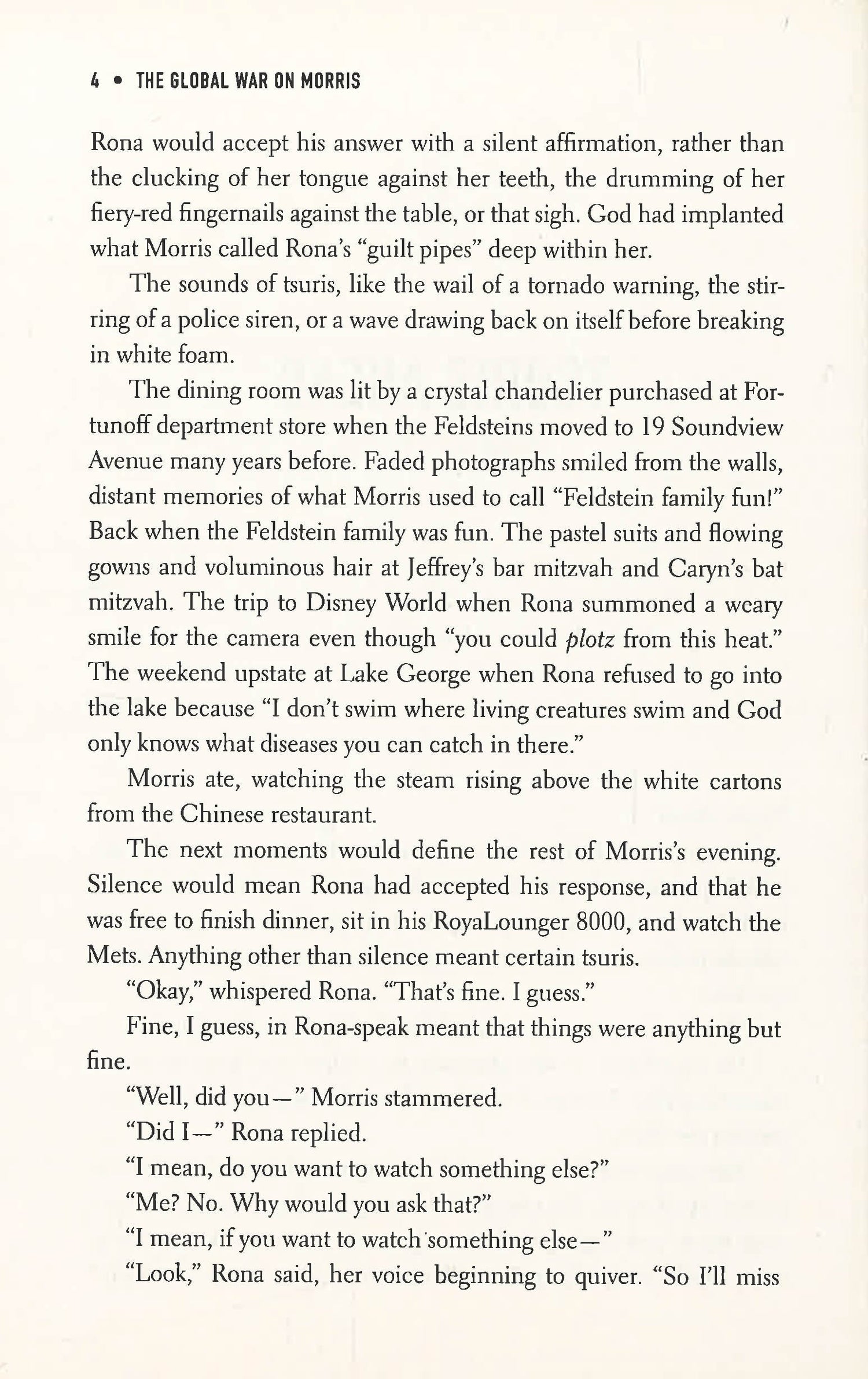 Meet Morris Feldstein, a pharmaceutical salesman living and working in western Long Island who loves the Mets, loves his wife Rona, and loves things just the way they are. He doesn’t enjoy the news; he doesn’t like to argue. Rona may want to change the world; Morris wants the world to leave him alone. Morris does not make waves. But one day Morris is seduced by a lonely, lovesick receptionist at one of the offices along his sales route, and in a moment of weakness charges a non-business expense to his company credit card. No big deal. Easy mistake. But the government’s top-secret surveillance program, anchored by a giant, complex supercomputer known as NICK, thinks differently. NICK begins to thread together the connected strands of Morris’s life - his friends, family, his traffic violations, his daughter’s political leanings, his wife’s new patients, and even his failed romantic endeavors - and Morris becomes the government’s public enemy number one.In his "laugh-out-loud funny" (Chris Matthews) debut novel, author "Steve Israel reveals his inner Jon Stewart" (Daily News, New York). The Global War on Morris toes the line between recent breaking headlines and a future that is not that difficult to imagine: "Why read this when one can see Washington insiders acting like buffoons in farcical situation on CNN? This is funnier than Wolf Blitzer, that’s why" (Library Journal).