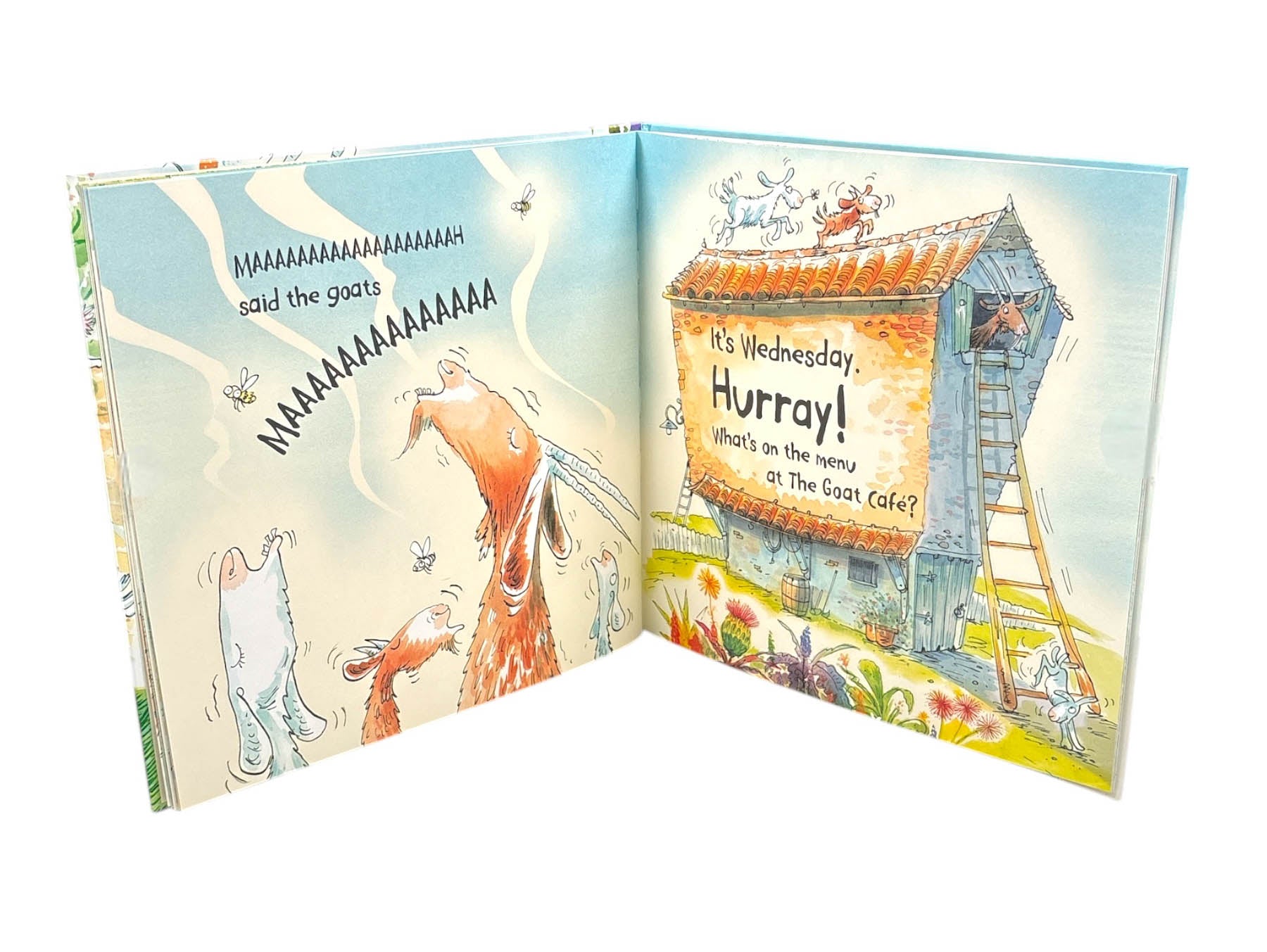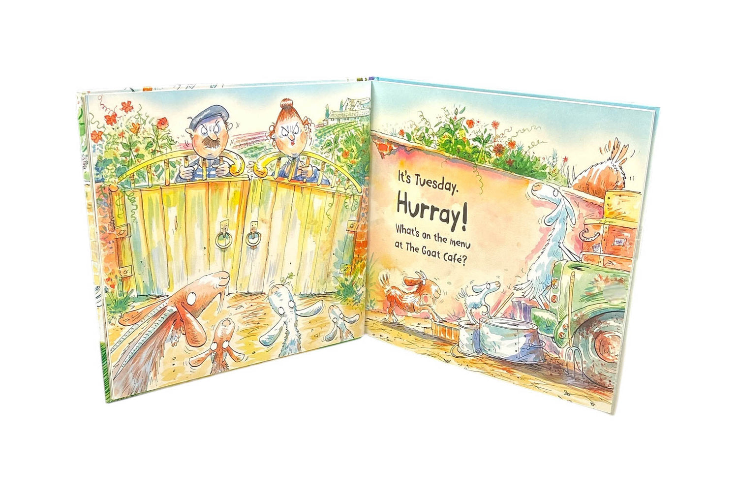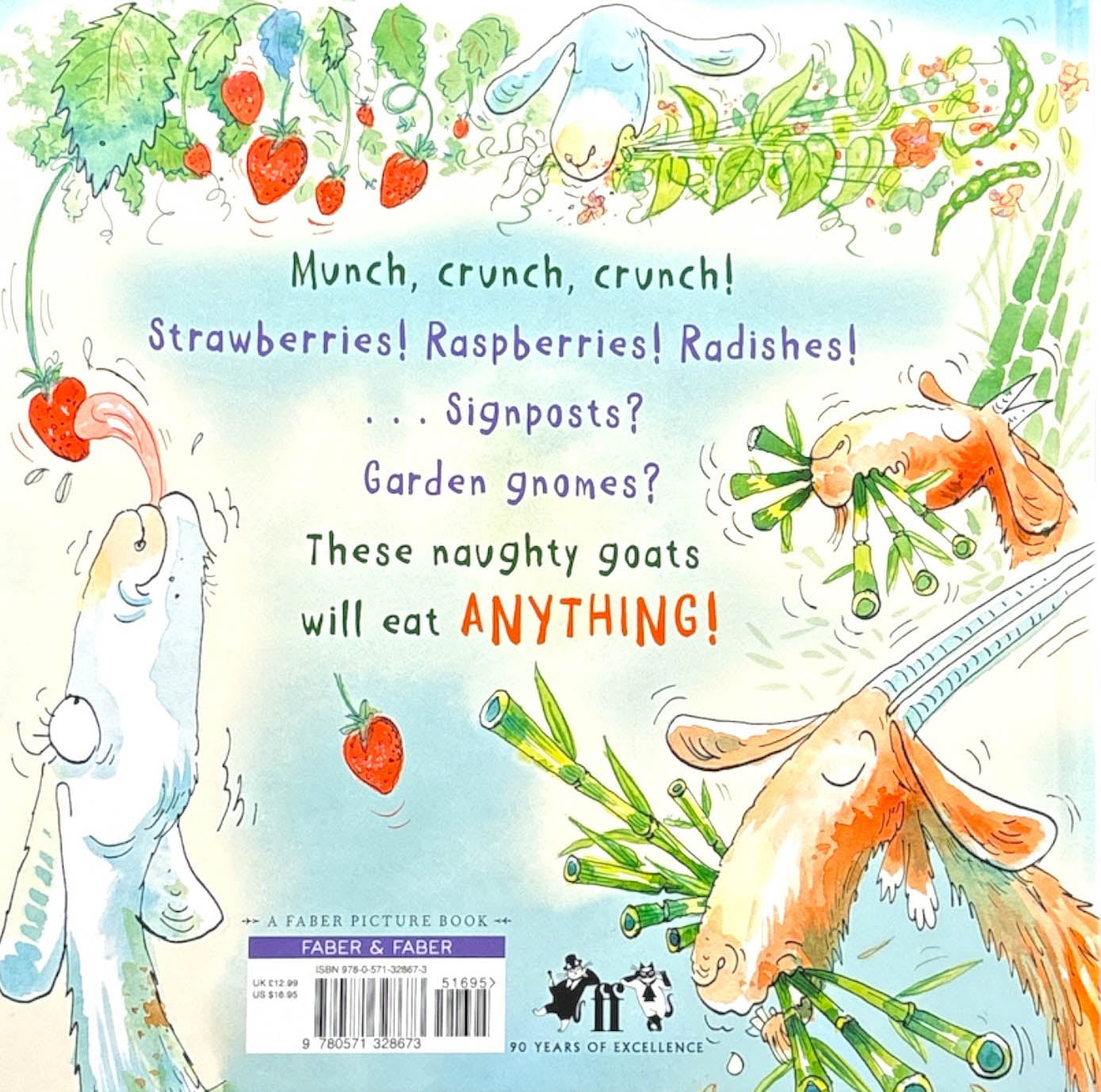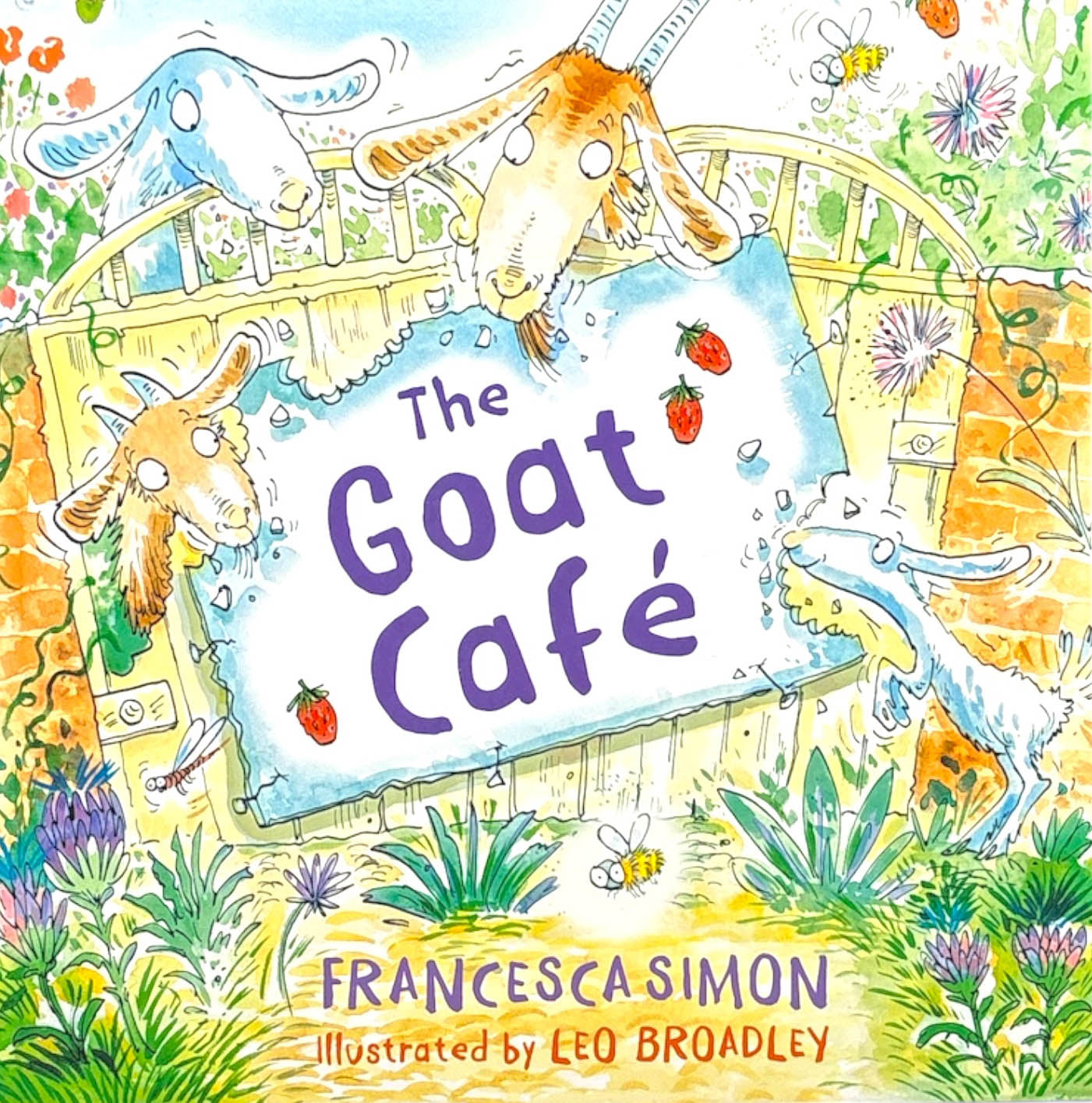 Goats eat EVERYTHING! Especially when a garden gate is left open and a feast awaits. Not content with strawberries, lemons and beans they continue to munch until all the plants, the shed and the garden gnomes have been devoured. And then . . . off to the next cafe!