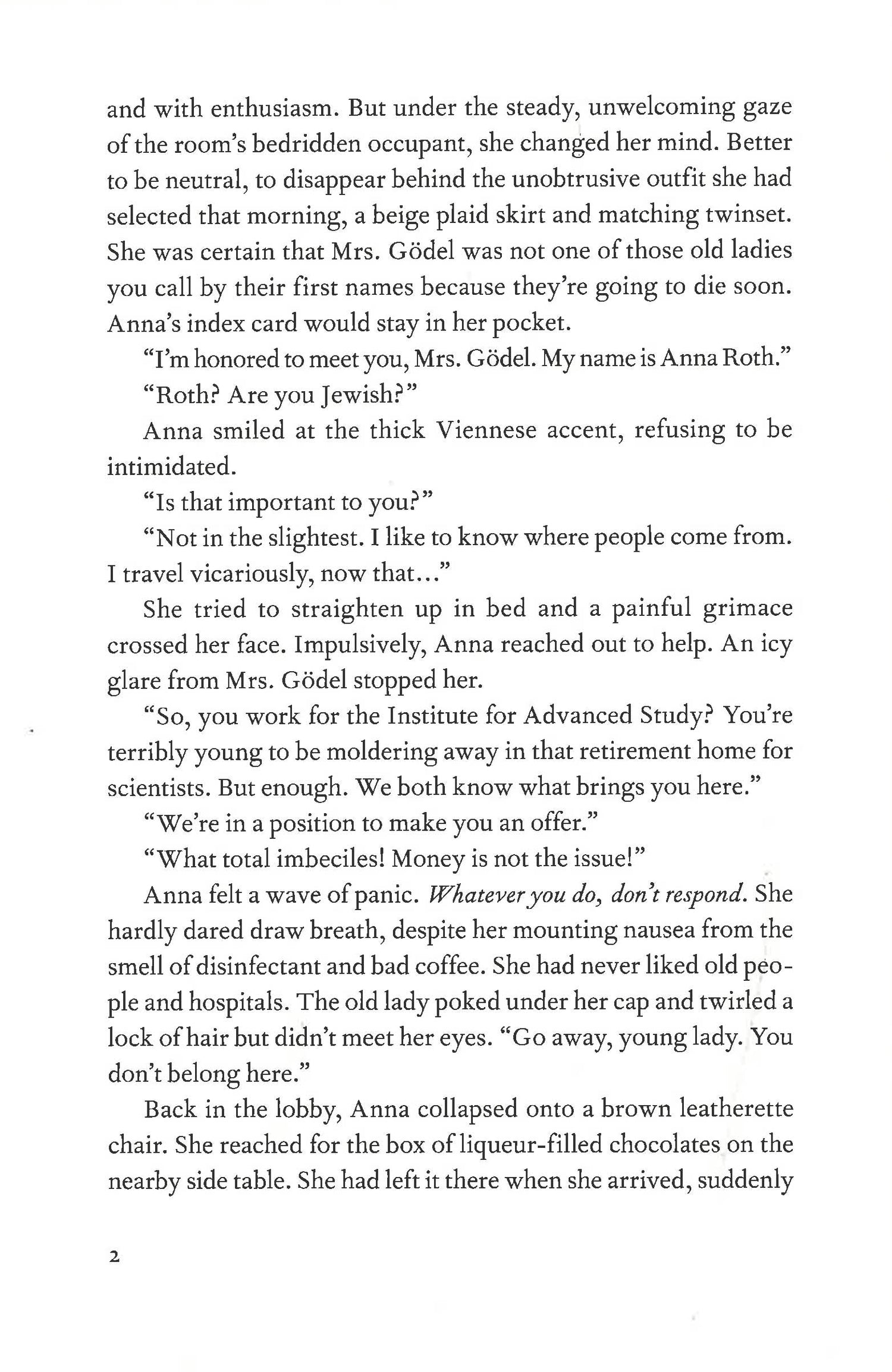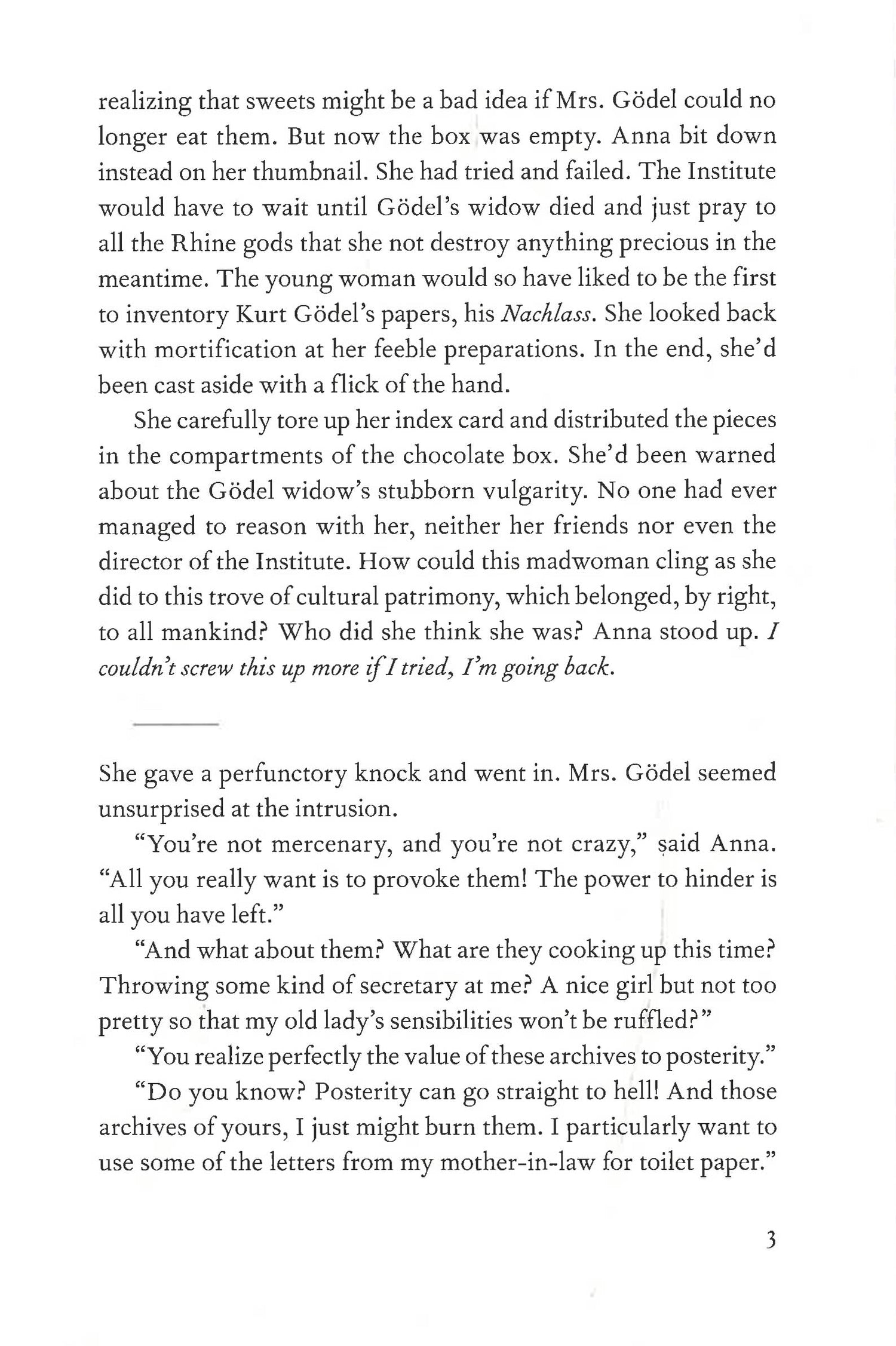 An internationally best-selling debut novel about the life, marriage, and legacy of one of the greatest mathematicians of the last century.Princeton University 1980. Kurt Gödel, the most fascinating, though hermetic, mathematician of the twentieth century, has just died of anorexia. His widow, Adele, a fierce woman shunned by her husband’s colleagues because she had been a cabaret dancer, is now consigned to a nursing home. To the great annoyance of the Institute of Advanced Studies, she refuses to hand over Gödel’s precious records. Anna Roth, the timid daughter of two mathematicians who are part of the Princeton clique, is given the difficult task of befriending Adele and retrieving the documents from her. As Adele begins to notice Anna’s own estrangement from her milieu and starts to trust her, she opens the gates of her memory and together they travel back to Vienna during the Nazi era, Princeton right after the war, the pressures of McCarthyism, the end of the positivist ideal, and the advent of nuclear weapons. It is this epic story of a genius who could never quite find his place in the world, and the determination of the woman who loved him, that will eventually give Anna the courage to change her own life.
