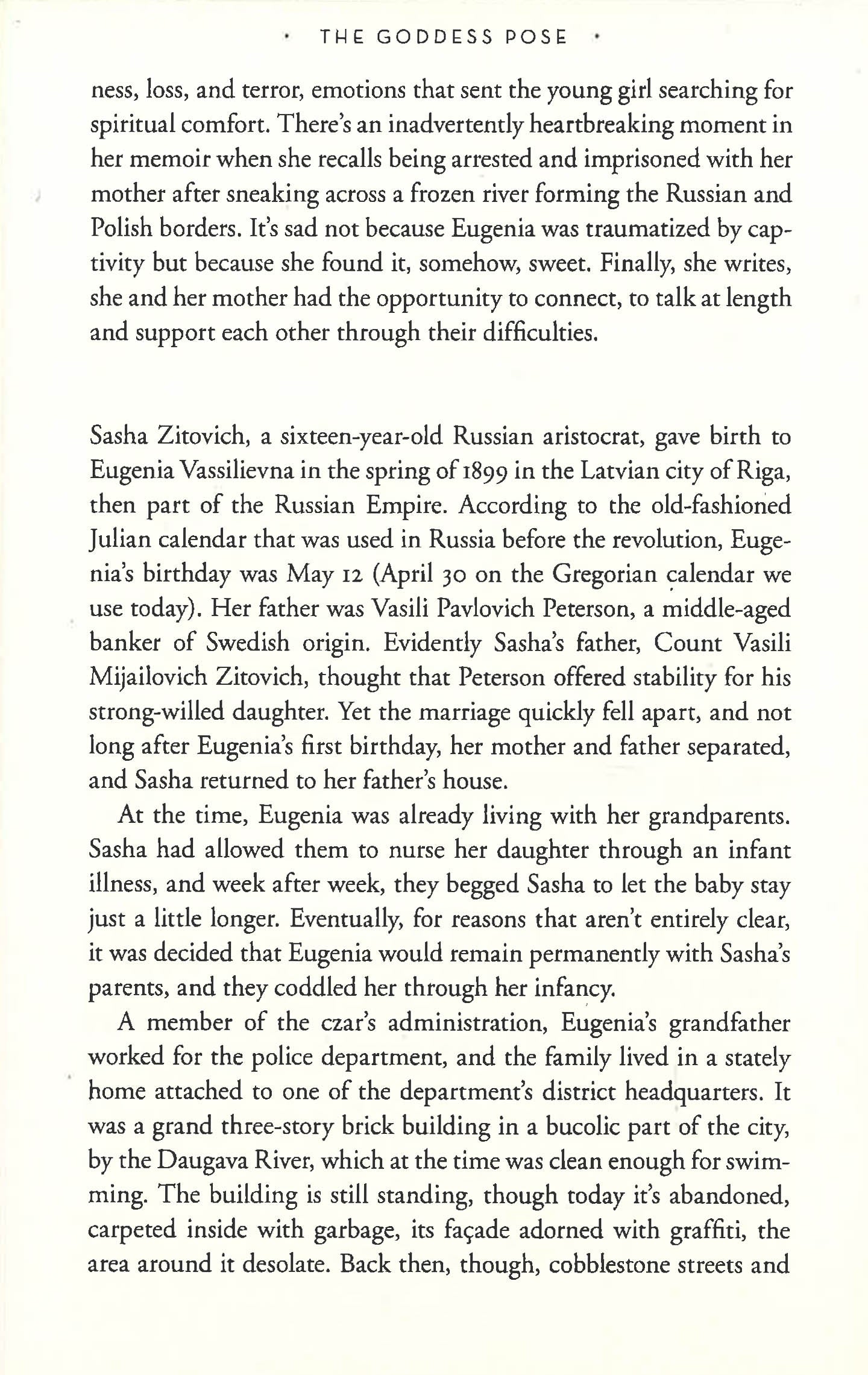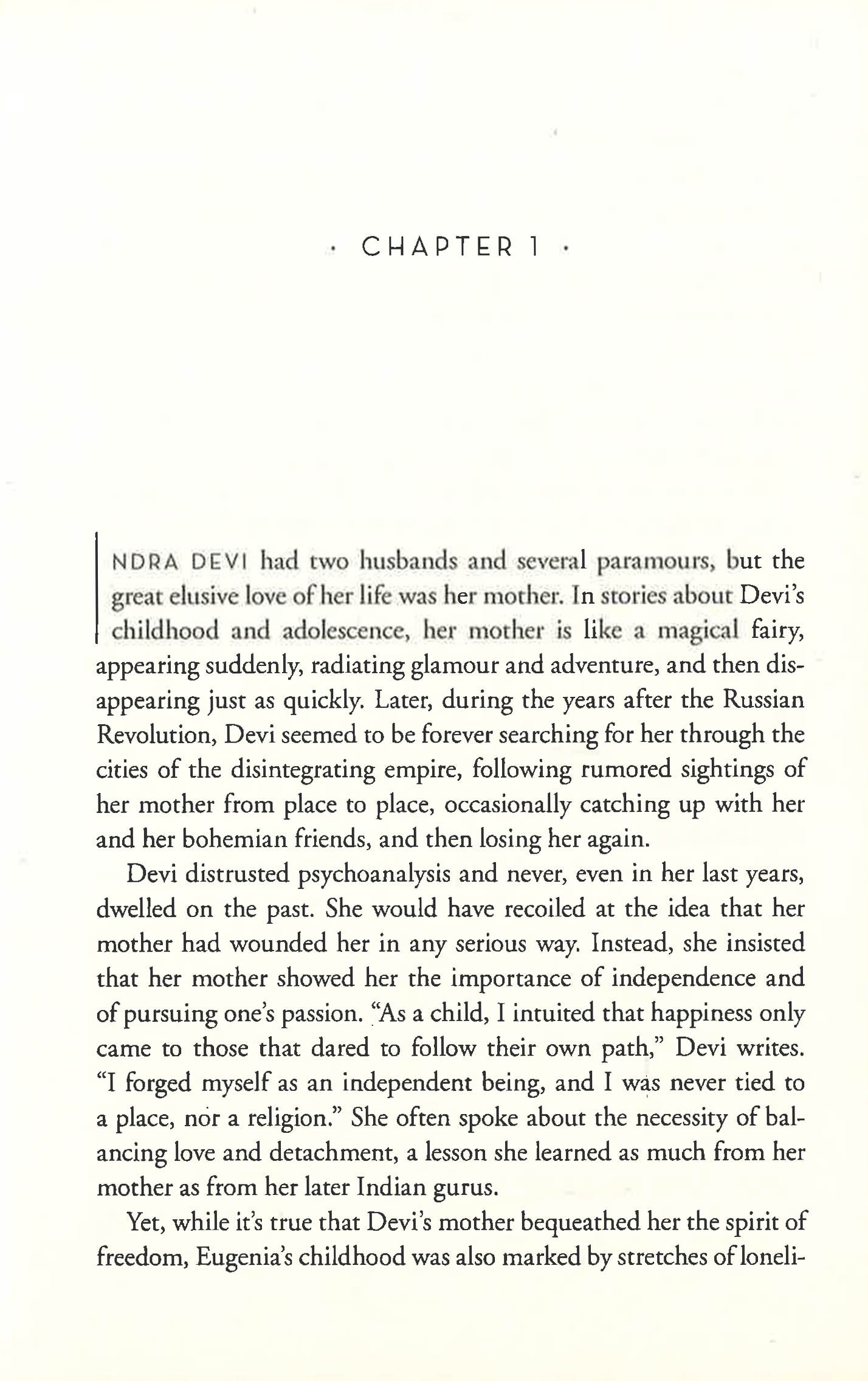 Born into the minor aristocracy (as Eugenia Peterson), Devi grew up in the midst of one of the most turbulent times in human history. Forced to flee the Russian Revolution as a teenager, she joined a famous Berlin cabaret troupe, dove into the vibrant prewar spiritualist movement, and, at a time when it was nearly unthinkable for a young European woman to travel alone, followed the charismatic Theosophical leader Jiddu Krishnamurti to India.