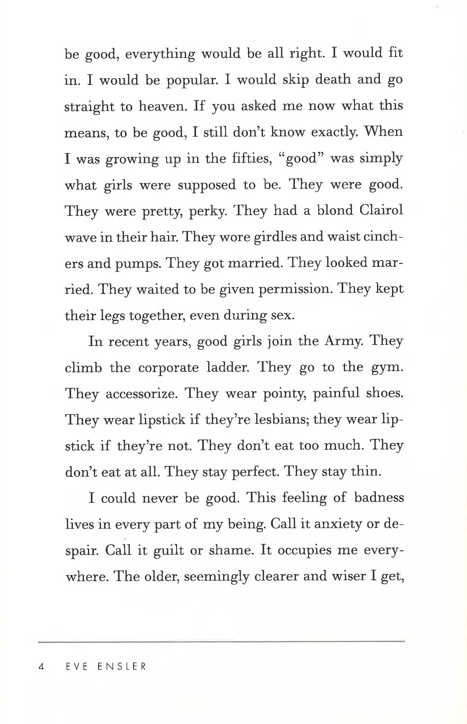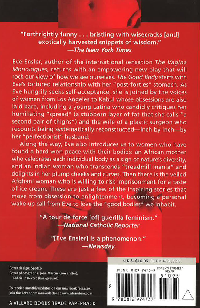 Botox, bulimia, breast implants: Eve Ensler, author of the international sensation The Vagina Monologues, is back, this time to rock our view of what it means to have a ?good body.? ?In the 1950s,? Eve writes, girls were ?pretty, perky. They had a blond Clairol wave in their hair. They wore girdles and waist-pinchers. . . . In recent years good girls join the army. They climb the corporate ladder. They go to the gym. . . . They wear painful pointy shoes. They don?t eat too much. They . . . don?t eat at all. They stay perfect. They stay thin. I could never be good.? The Good Body starts with Eve?s tortured relationship with her own ?post-forties? stomach and her skirmishes with everything from Ab Rollers to fad diets and fascistic trainers in an attempt get the ?flabby badness? out. As Eve hungrily seeks self-acceptance, she is joined by the voices of women from L.A. to Kabul, whose obsessions are also laid bare: A young Latina candidly critiques her humiliating ?spread,? a stubborn layer of fat that she calls ?a second pair of thighs.? The wife of a plastic surgeon recounts being systematically reconstructed?inch by inch?by her ?perfectionist? husband. An aging magazine executive, still haunted by her mother?s long-ago criticism, describes her desperate pursuit of youth as she relentlessly does sit-ups. *This book may have remainder mark*